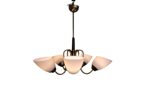 En underbar graciös taklampa som är från skiftet 50/60-tal med alla de kvalitéer som var en självklarhet. Taklampan är femarmad