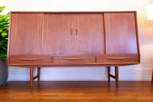 Exklusivt skåp i teak från Clausen & Son med barskåp, skjutluckor och ädelträinredning – en