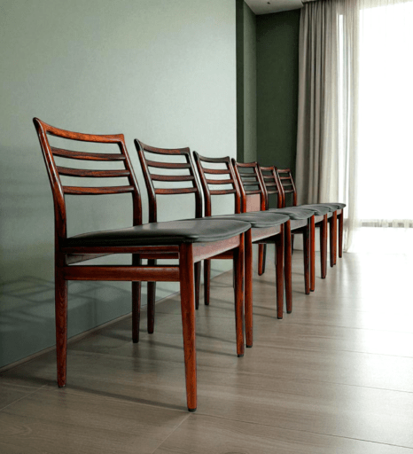 Ett set mycket ovanliga danska stolar i modell Peter i massiv teak. Designade av Niels