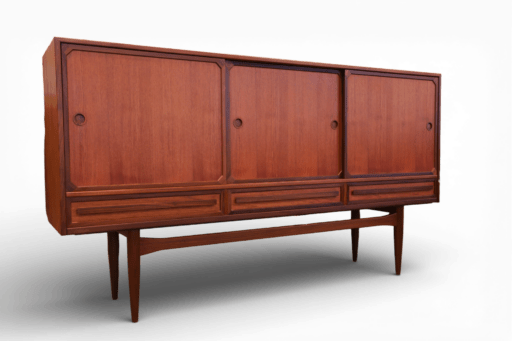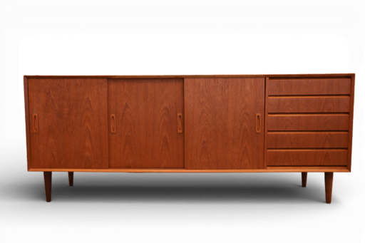Ett makalöst vackert och smakfullt danskt sidebord i gyllenbrun teak! Sideboardet har långa och eleganta