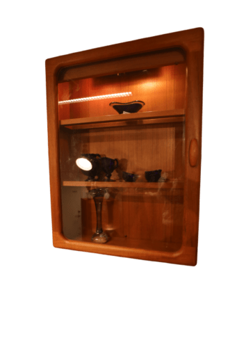 Ett nätt vägghängt skåp i teak med belysning samt lucka i teak och glas. Skåpet