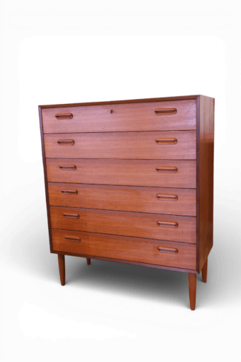 En elegant och tidstypisk teakbyrå från 1960-talet i dansk design. Byrån har en hög och
