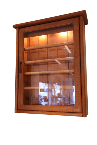 Ett nätt vägghängt skåp i teak med belysning samt lucka i teak och glas. Skåpet