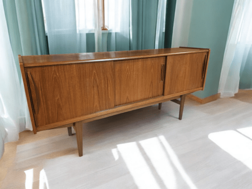 Exklusivt skåp i teak från Clausen & Son med barskåp, skjutluckor och ädelträinredning – en