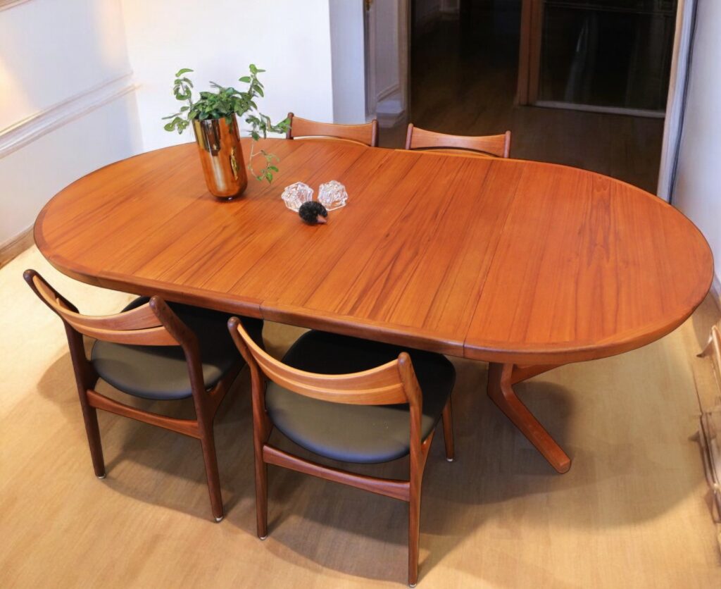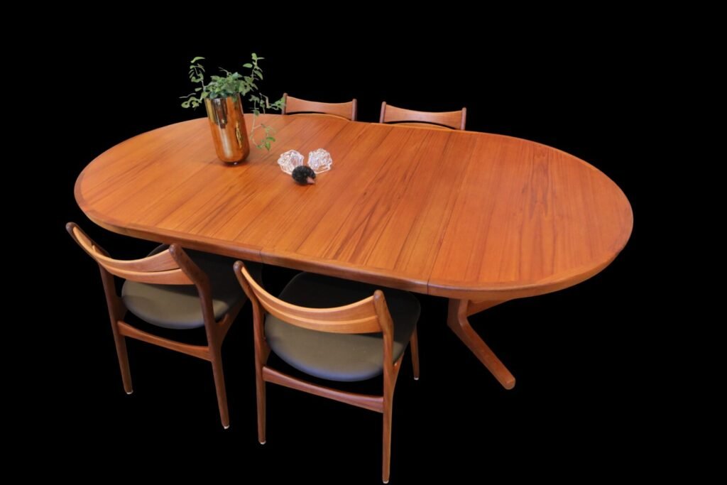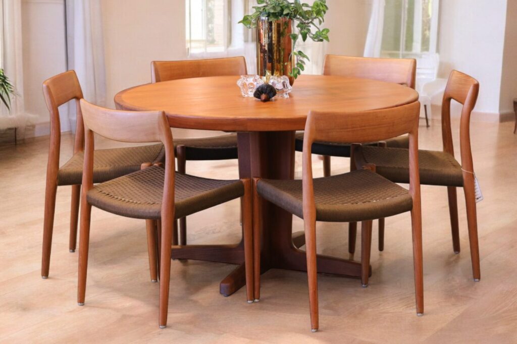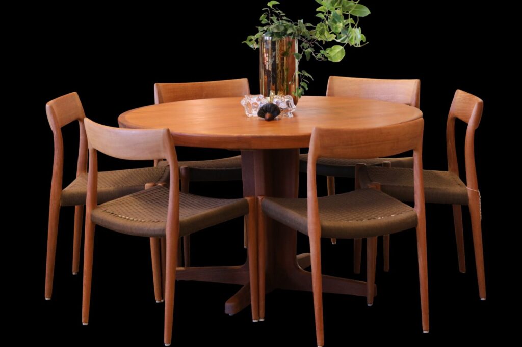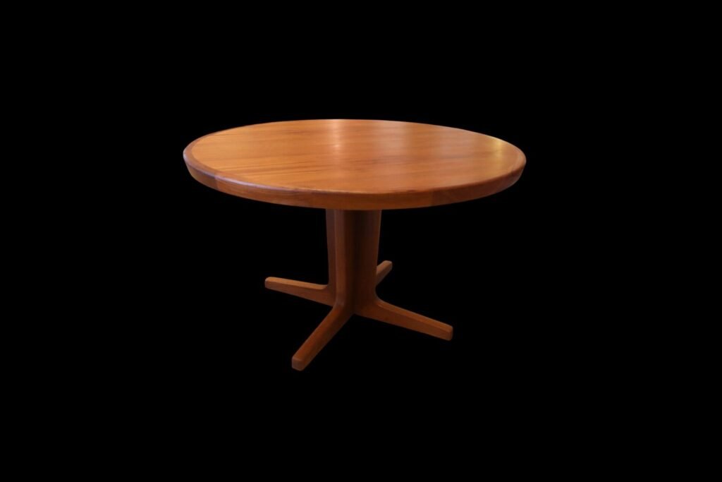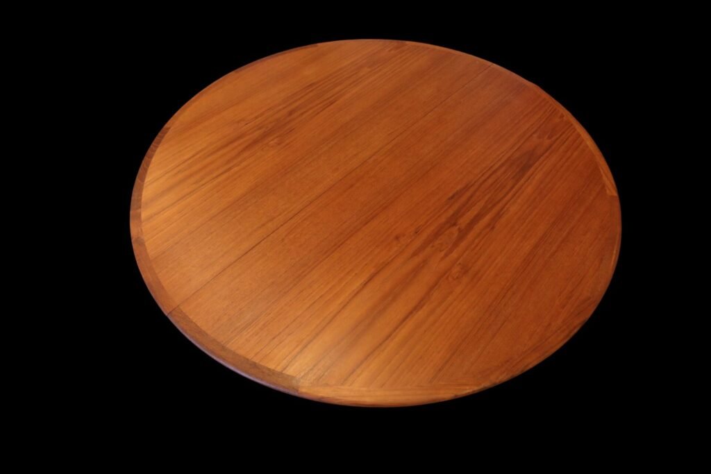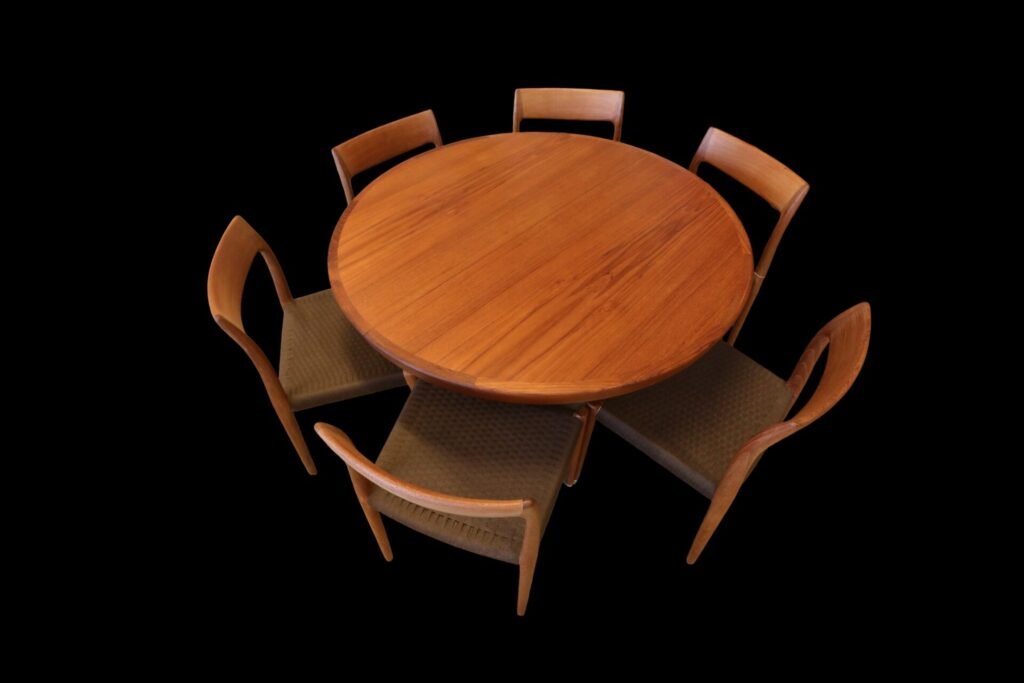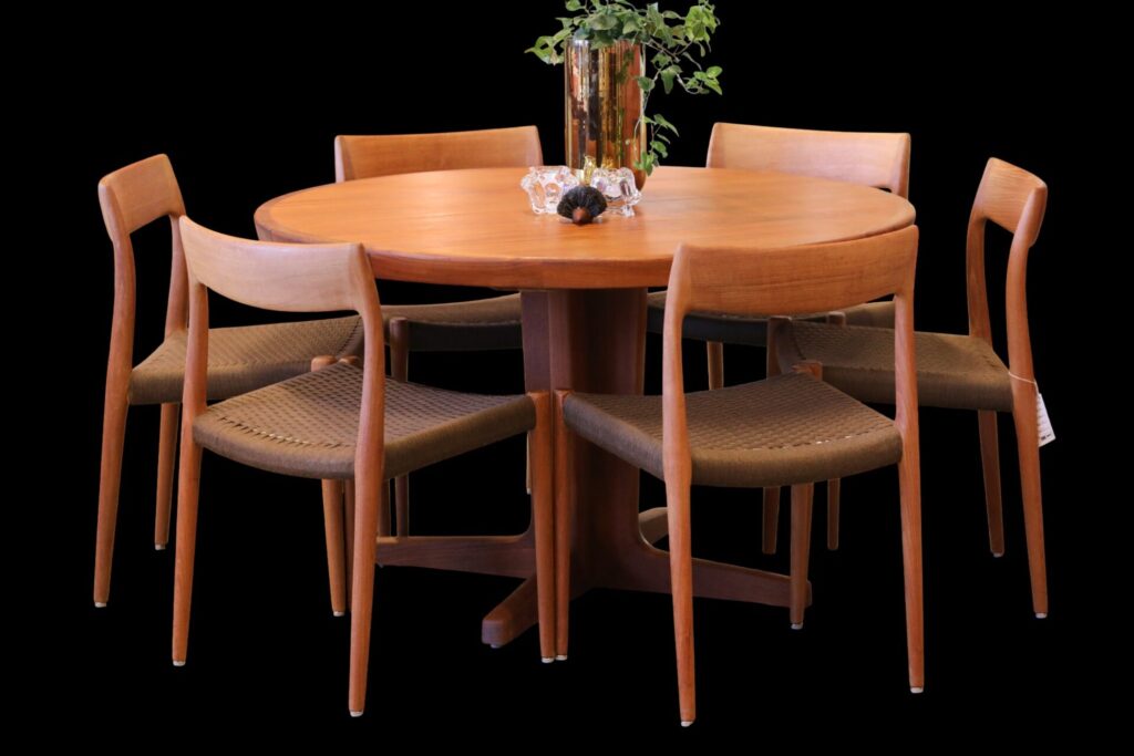 Ett runt matbord i teak från AM Møbler Danmark som står på pelarfot vilket gör det enkelt att placera stolarna runt bordet. Vi har placerat ut både fem och sex stolar runt bordet utan att det upplevs trångt och besvärligt!