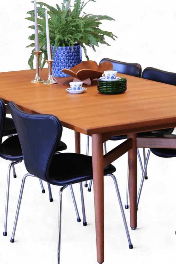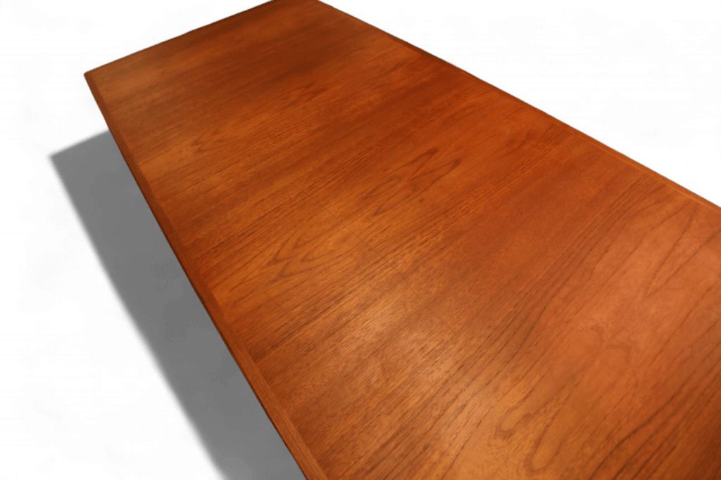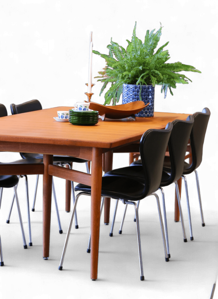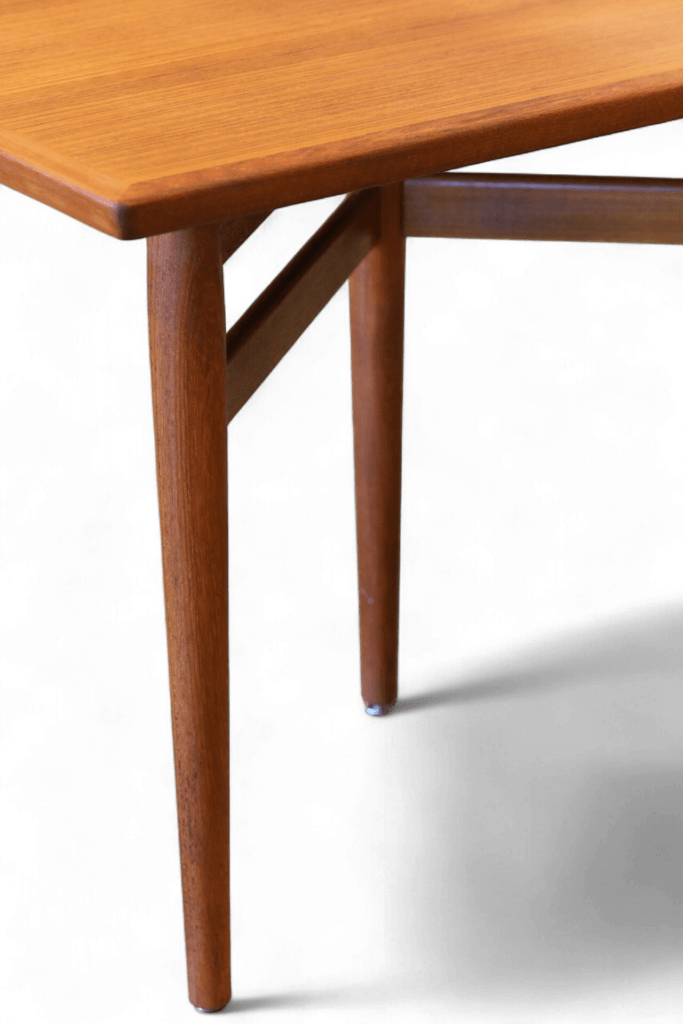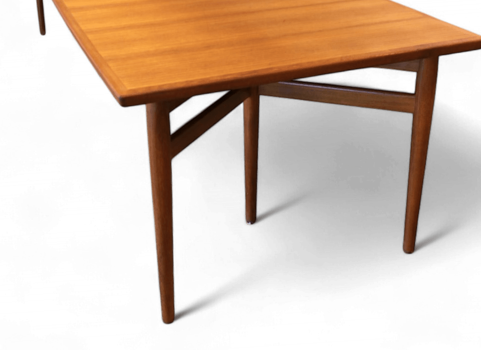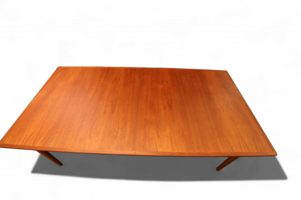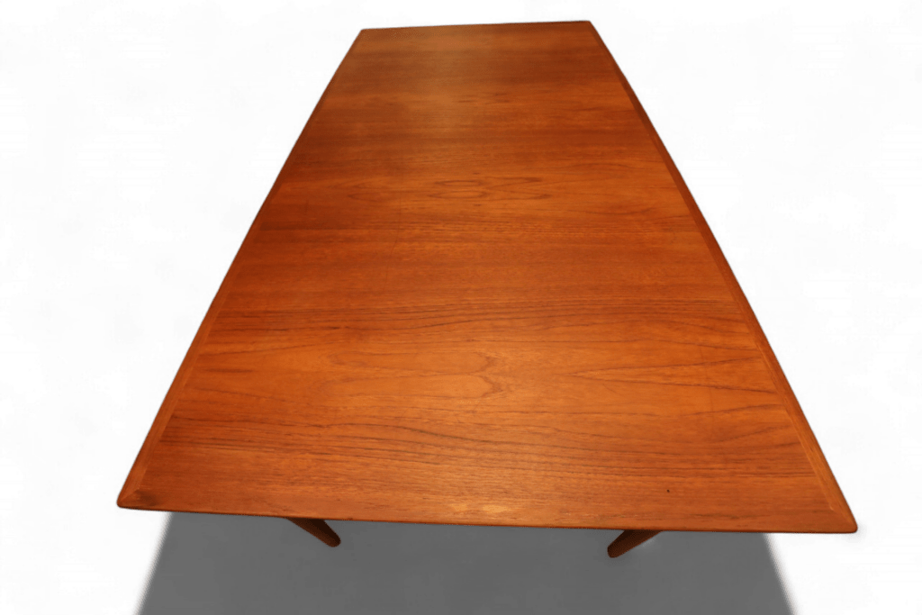 Ett stort och generöst matbord i en mycket ovanlig modell. Bordet är teak formgivet av Arne Vodder för Sibast Møbler i Danmark och har modellbeteckning 201. Matbordet är så pass rymligt att det rymmer sex-åtta sittplatser.