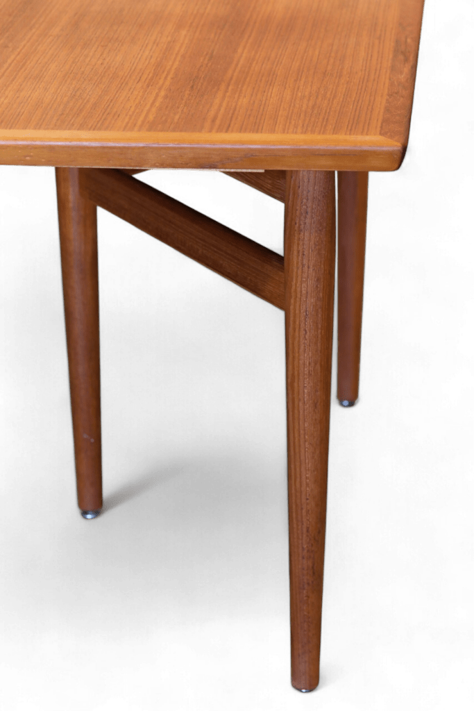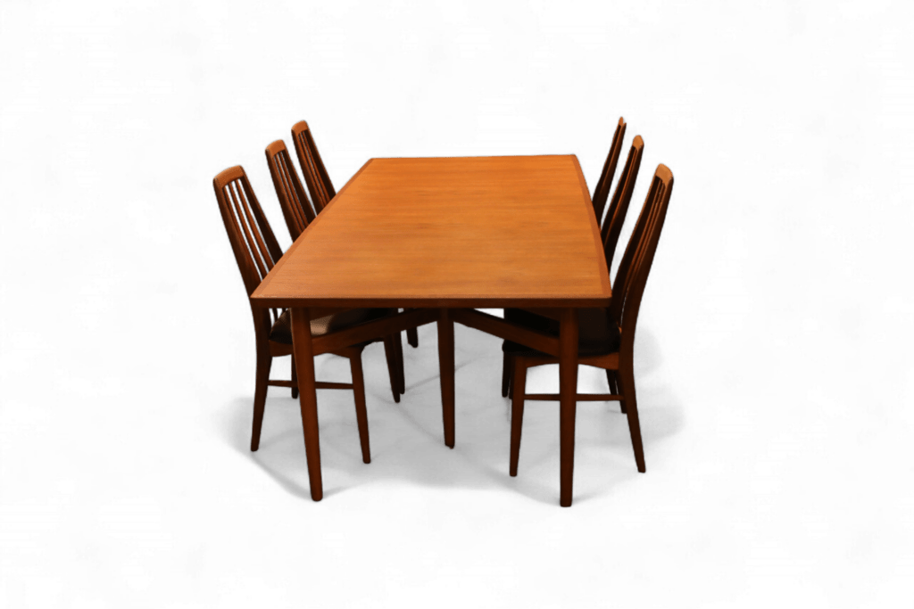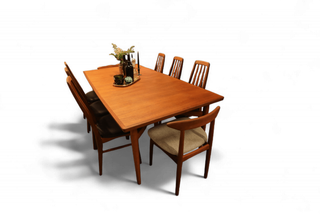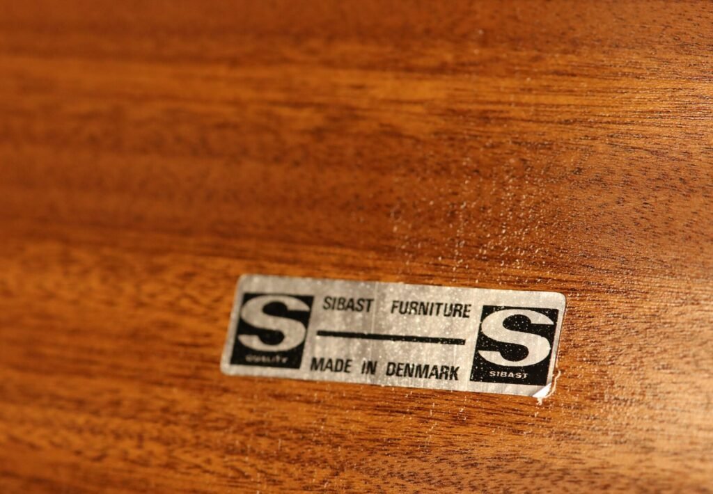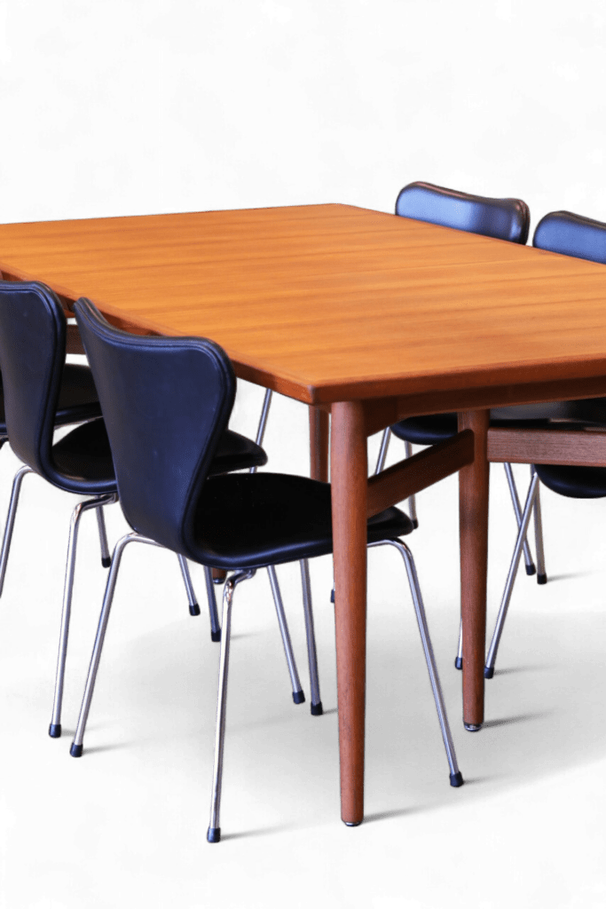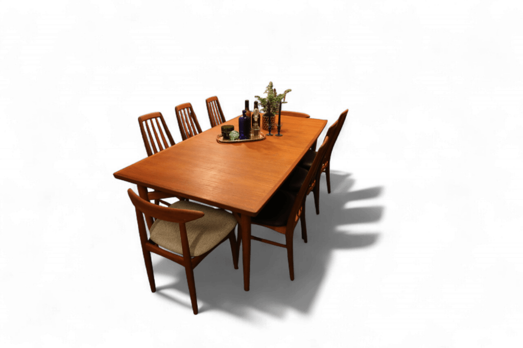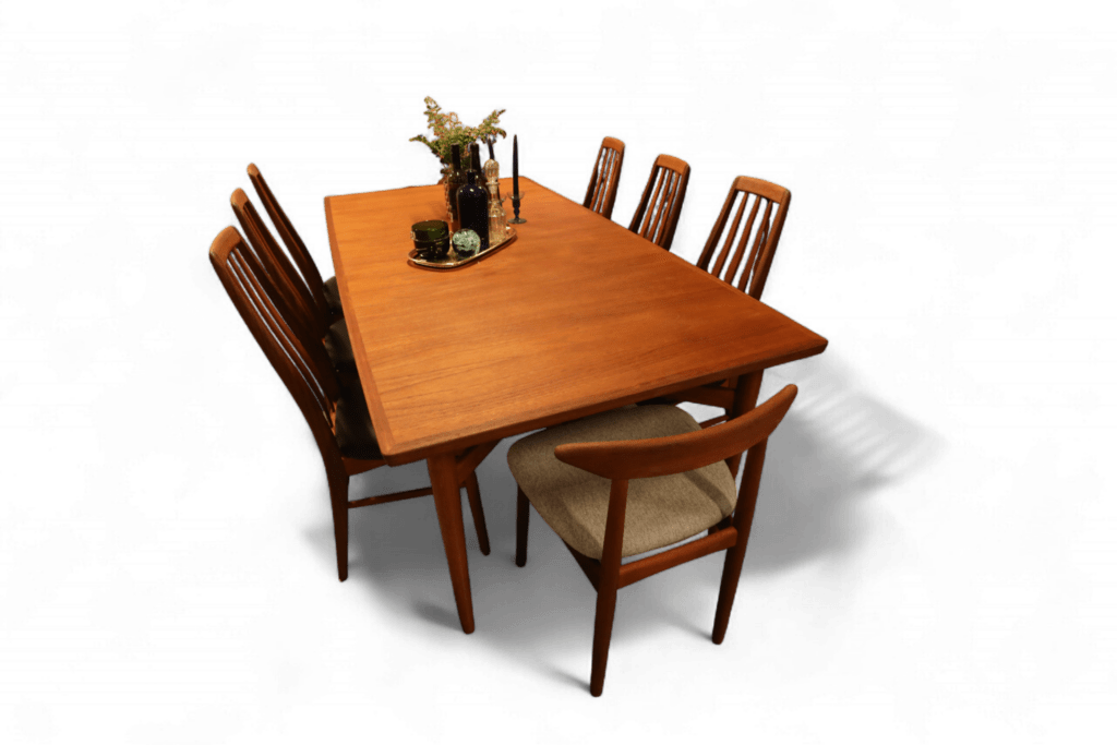 Ett stort och generöst matbord i en mycket ovanlig modell. Bordet är teak formgivet av Arne Vodder för Sibast Møbler i Danmark och har modellbeteckning 201. Matbordet är så pass rymligt att det rymmer sex-åtta sittplatser.