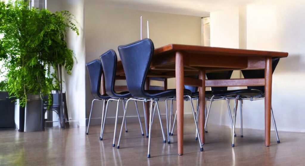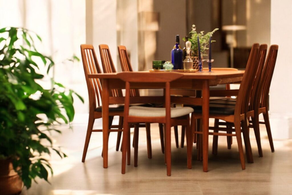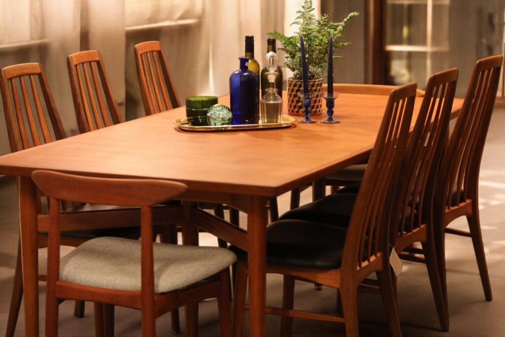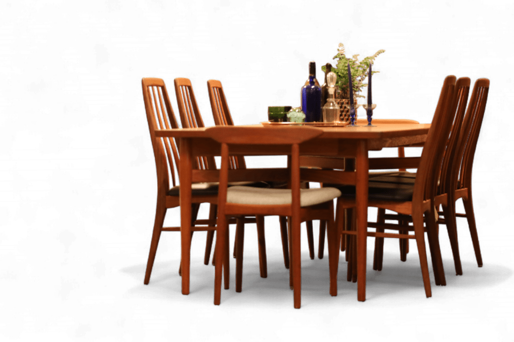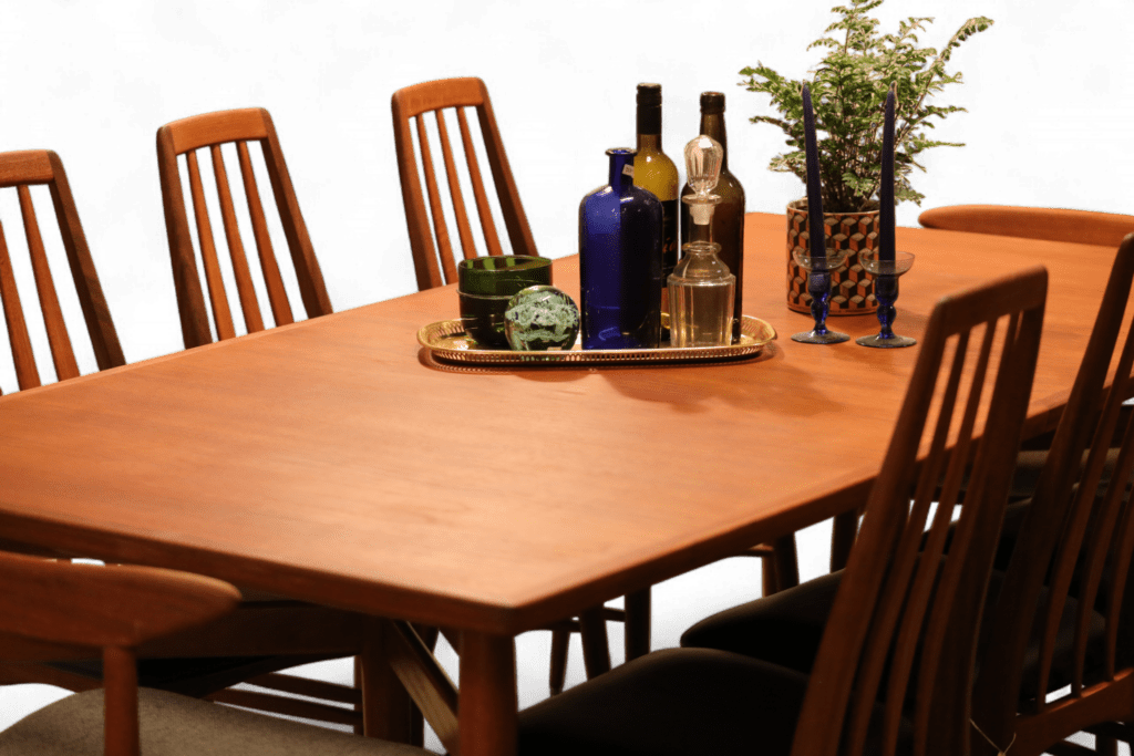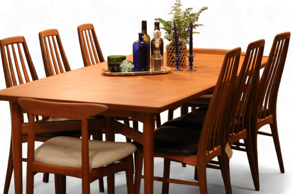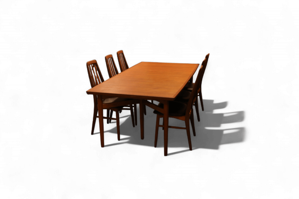 Ett stort och generöst matbord i en mycket ovanlig modell. Bordet är teak formgivet av Arne Vodder för Sibast Møbler i Danmark och har modellbeteckning 201. Matbordet är så pass rymligt att det rymmer sex-åtta sittplatser.