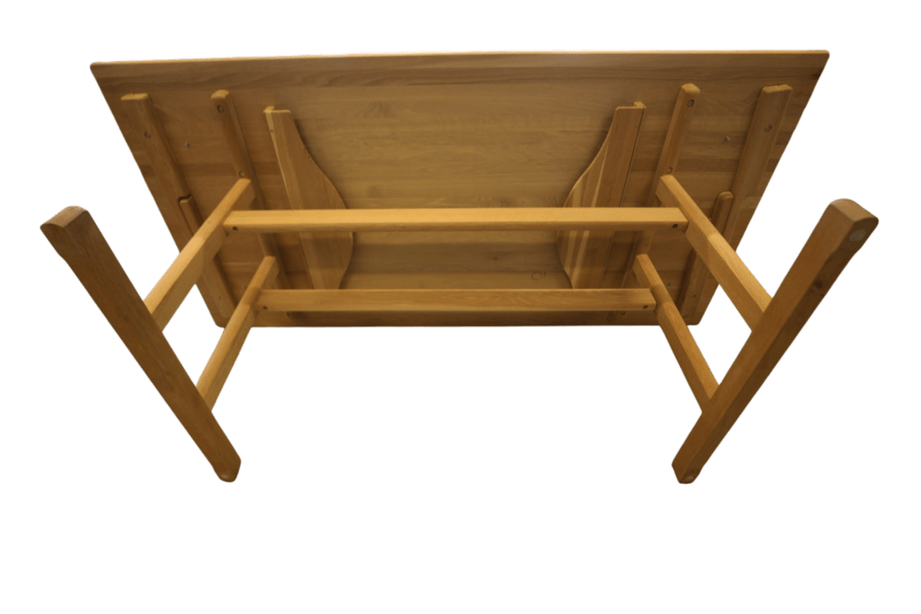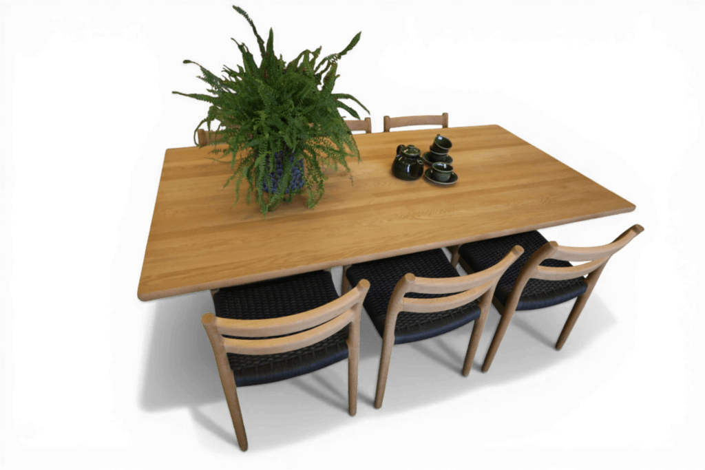Bordet är tillverkat i massiv ek av mycket hög kvalitet, ett material som inte bara är vackert utan också robust och slitstarkt. Den gedigna bordsskivan ger en stabil och generös yta som passar lika fint till middagar och umgänge som till arbete och vardag.