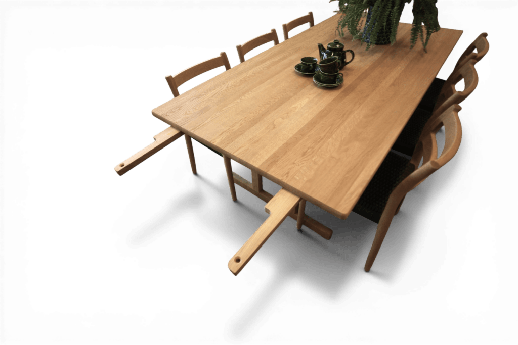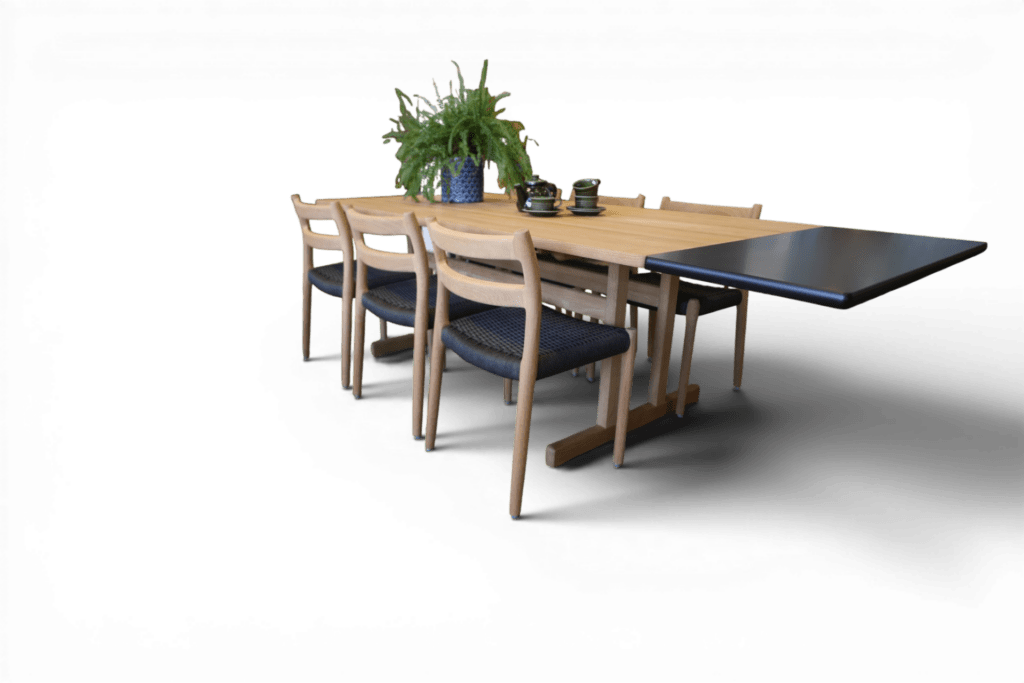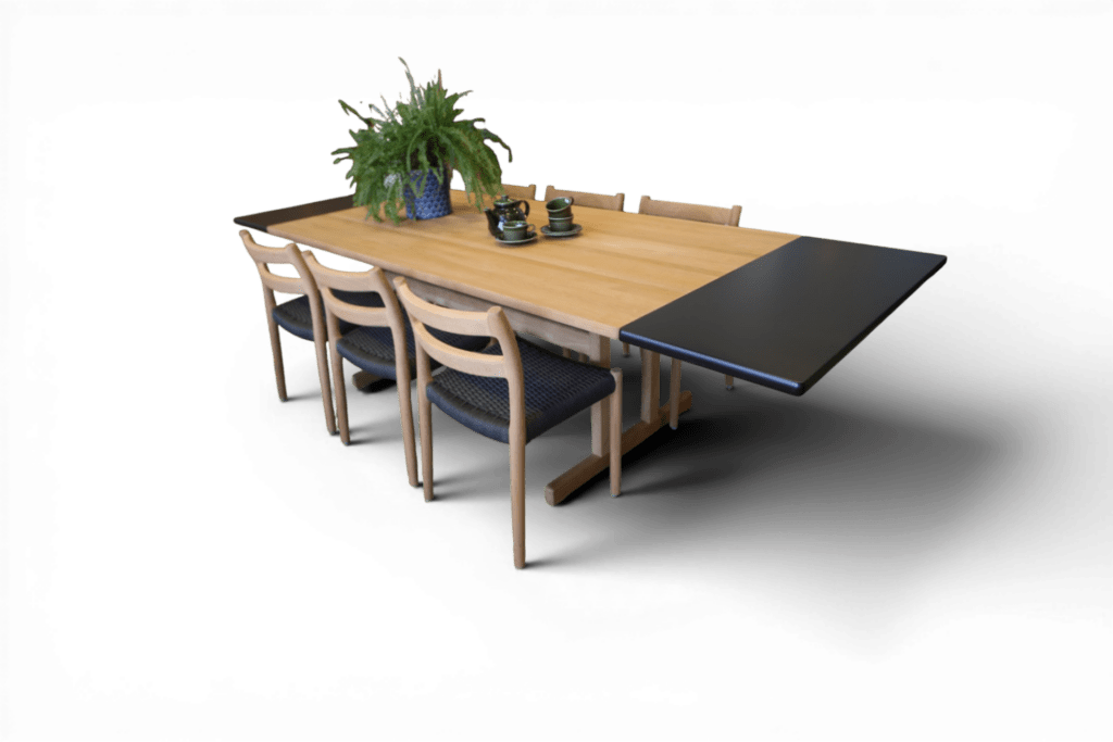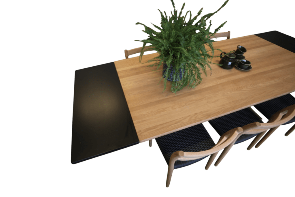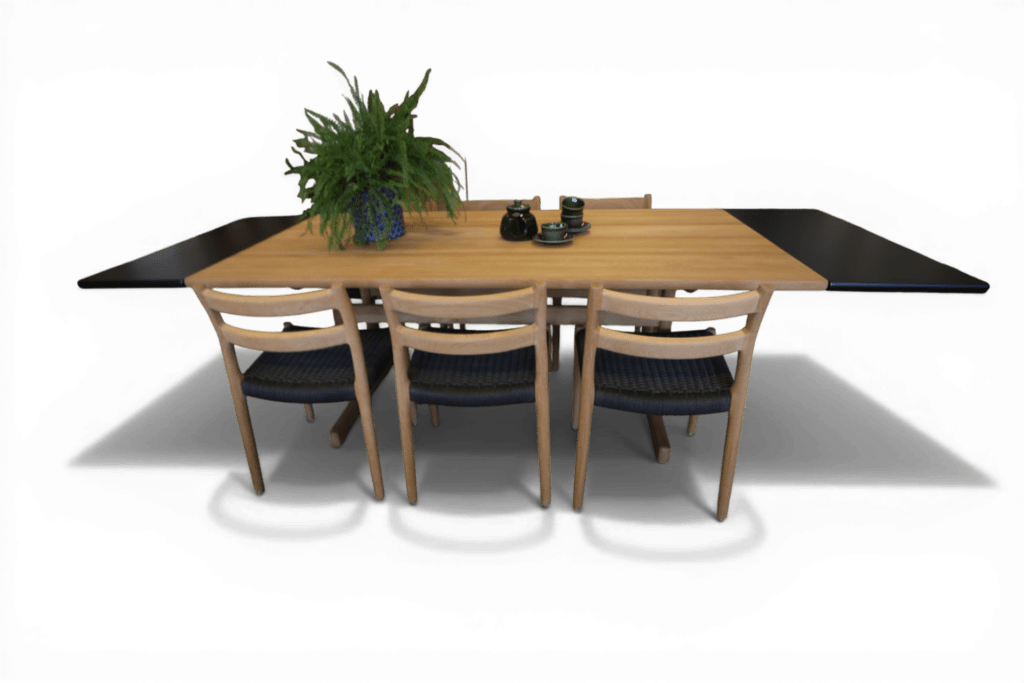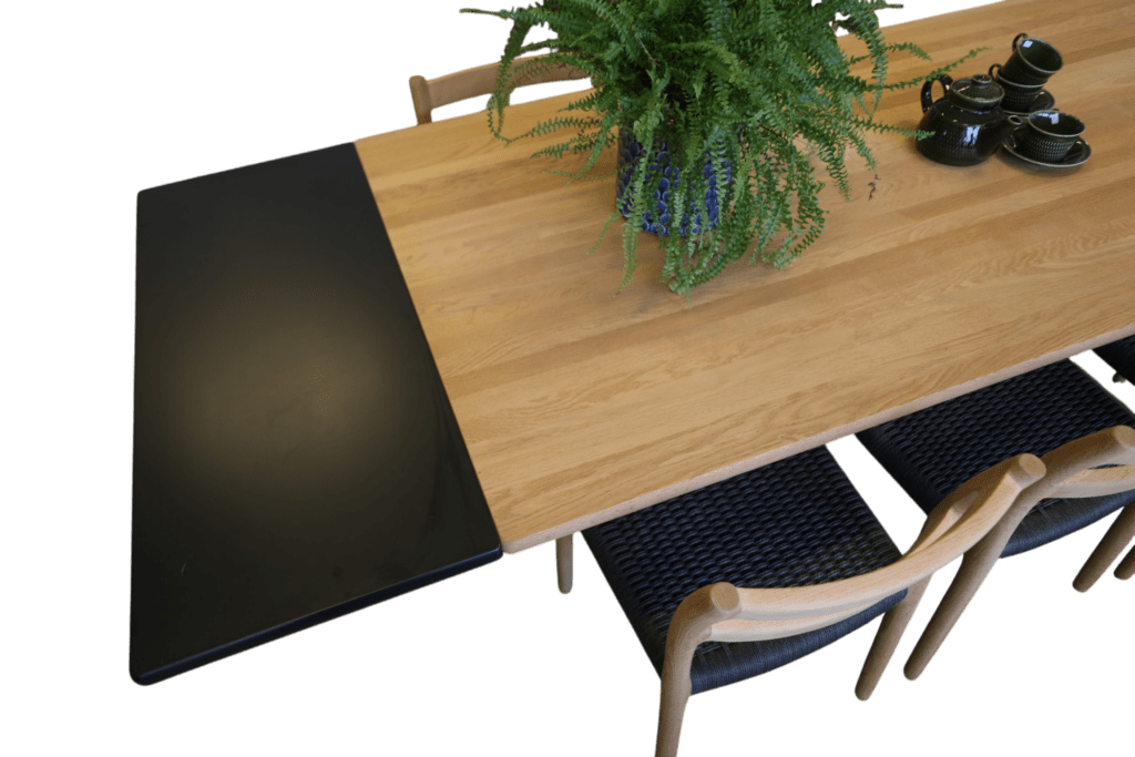 Tack vare den generösa storleken är detta ett mycket praktiskt och socialt matbord. I sitt ursprungliga utförande ryms enkelt tre stolar på varje långsida samt en stol på vardera kortsida. Med iläggsskivorna får du ytterligare fyra sittplatser. Det gör bordet perfekt för familjemiddagar, högtider och långa kvällar tillsammans med nära och kära.