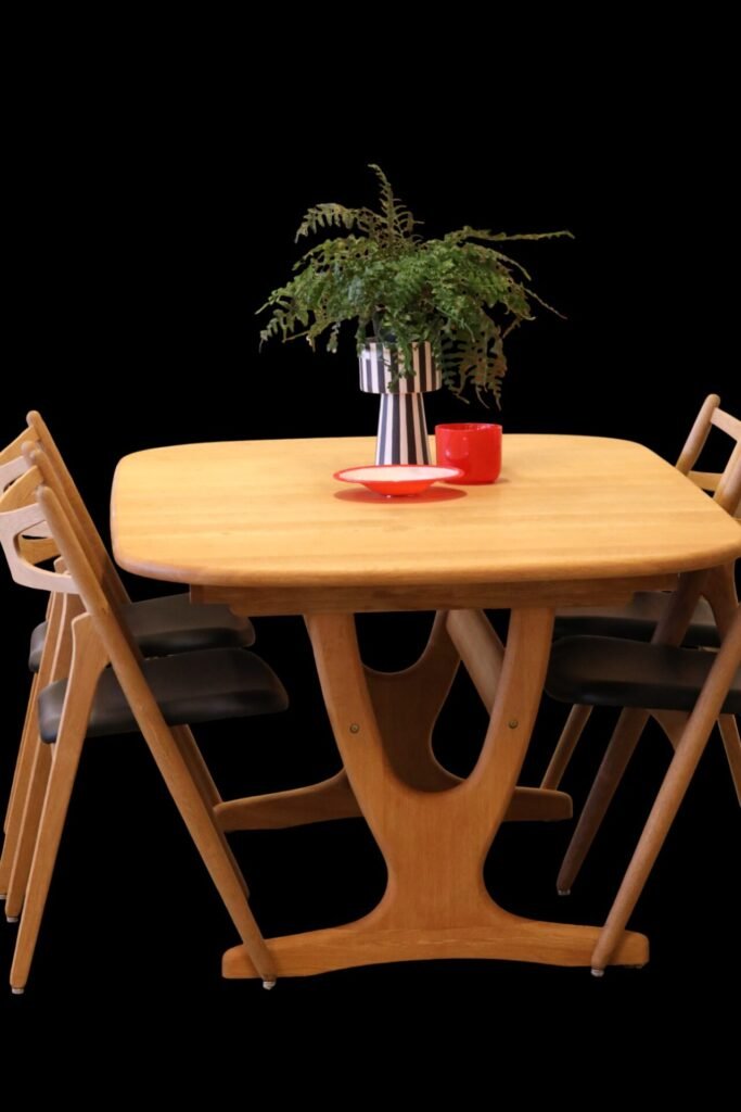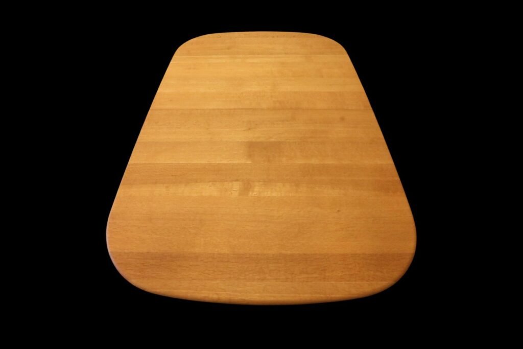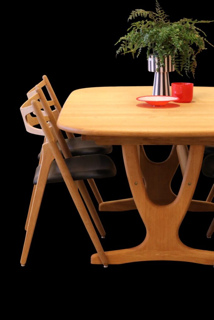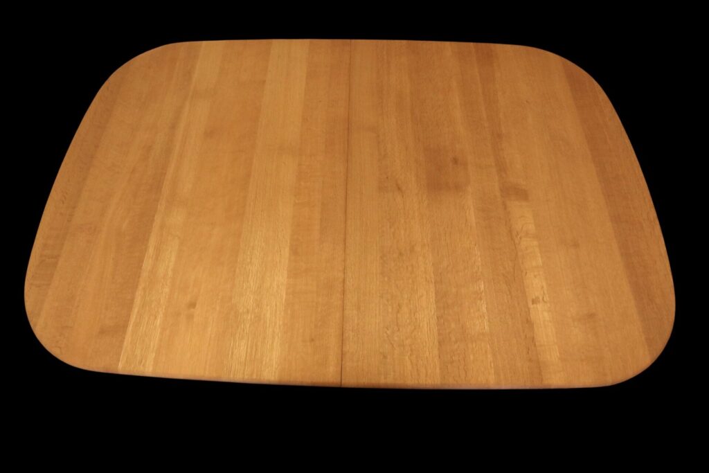 Bordet har mjukt rundade hörn och kanter samt står på bordsben i shakermodell vilket gör det enkelt att placera stolar runt bordet utan att några bordsben tar mot. Benen är dessutom kopplade och gör bordet stabilt och bra.