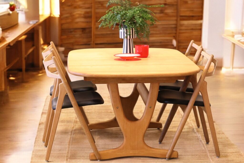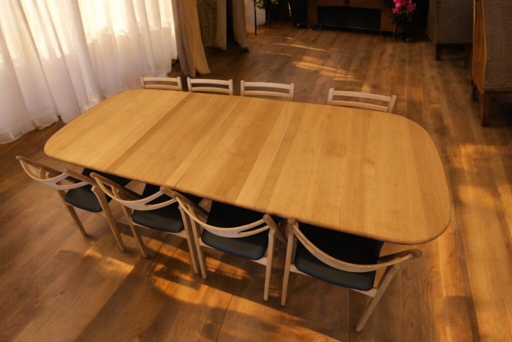 Perfekt och stadigt matbord, även för en barnfamilj. Det går att renovera bordet oändligt många gånger utan problem i och med att bordet är i massiv ek , skivan är på hela tre cm!