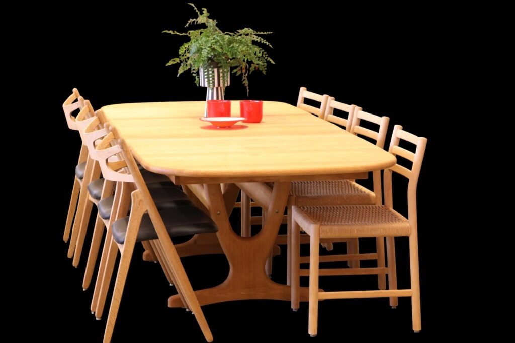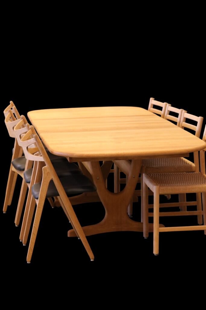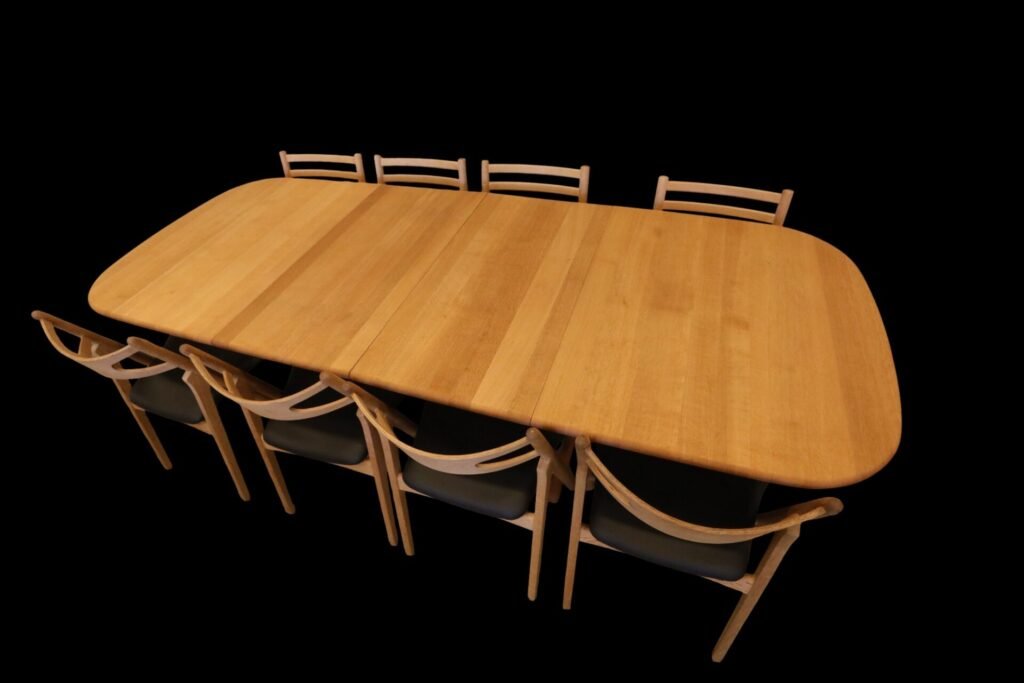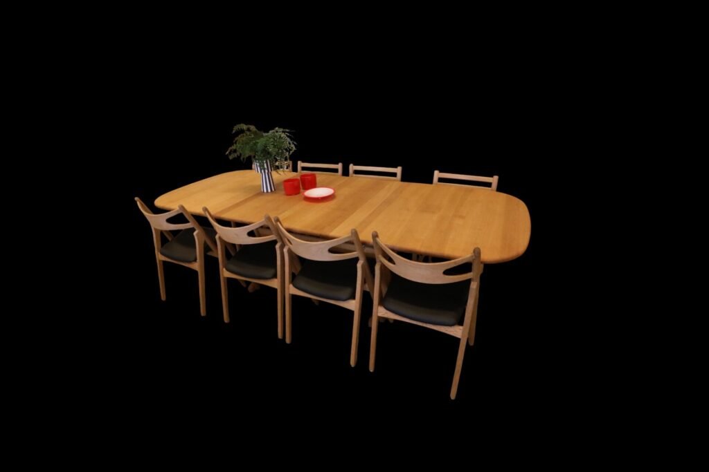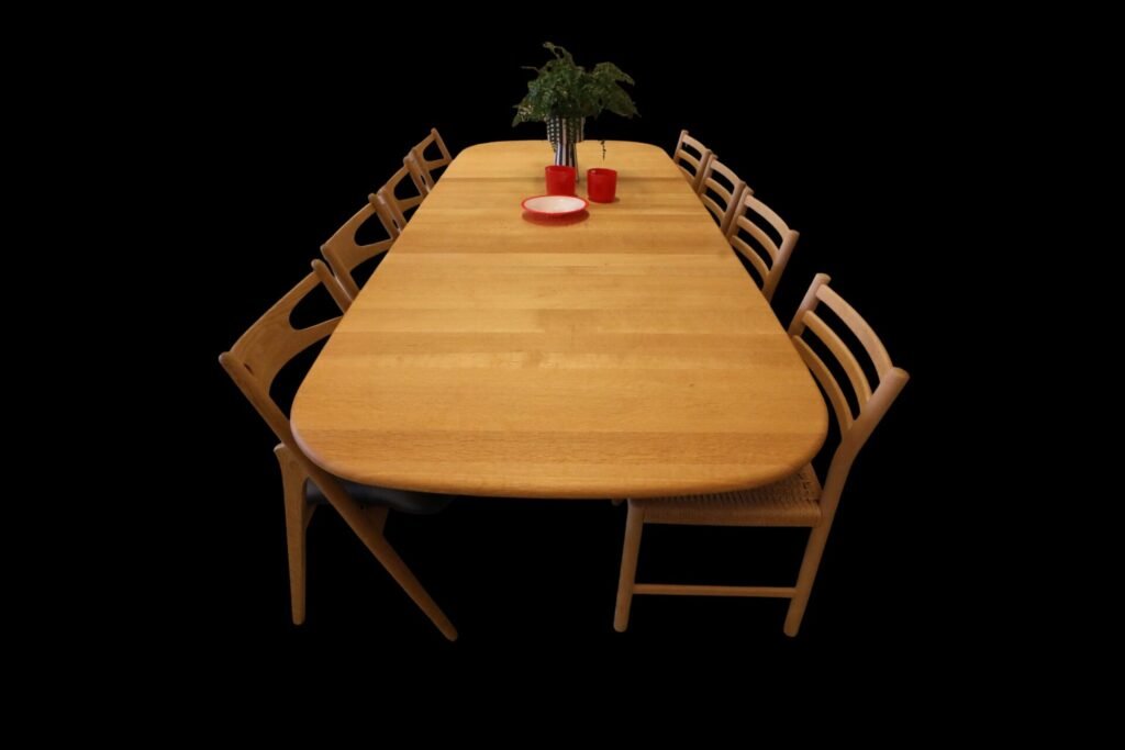 Stilrent ovalt matbord i massiv ek som är mycket välgjort och påkostat.