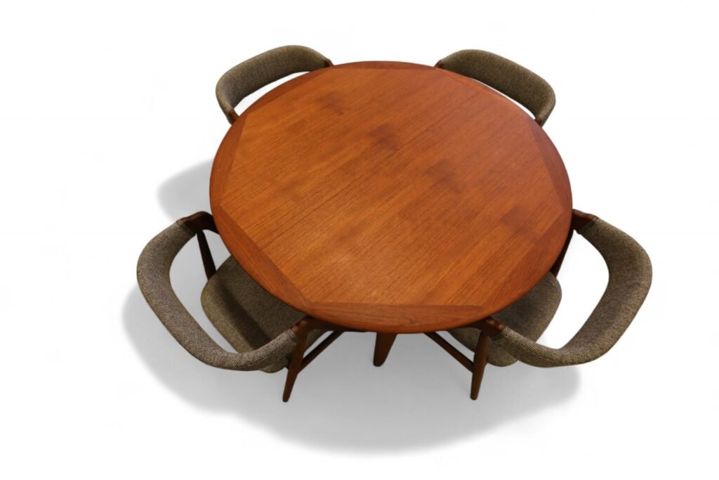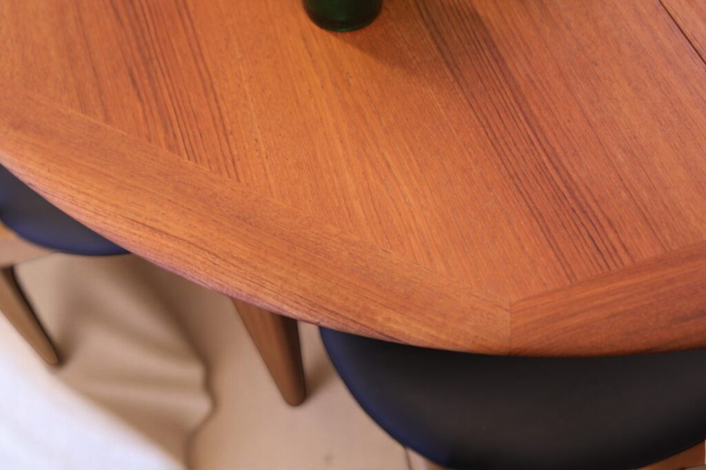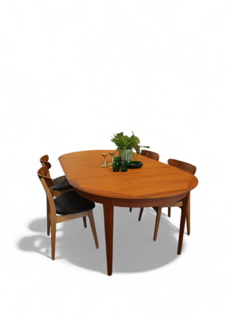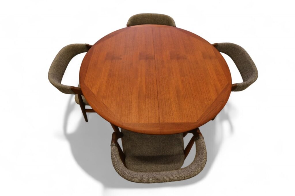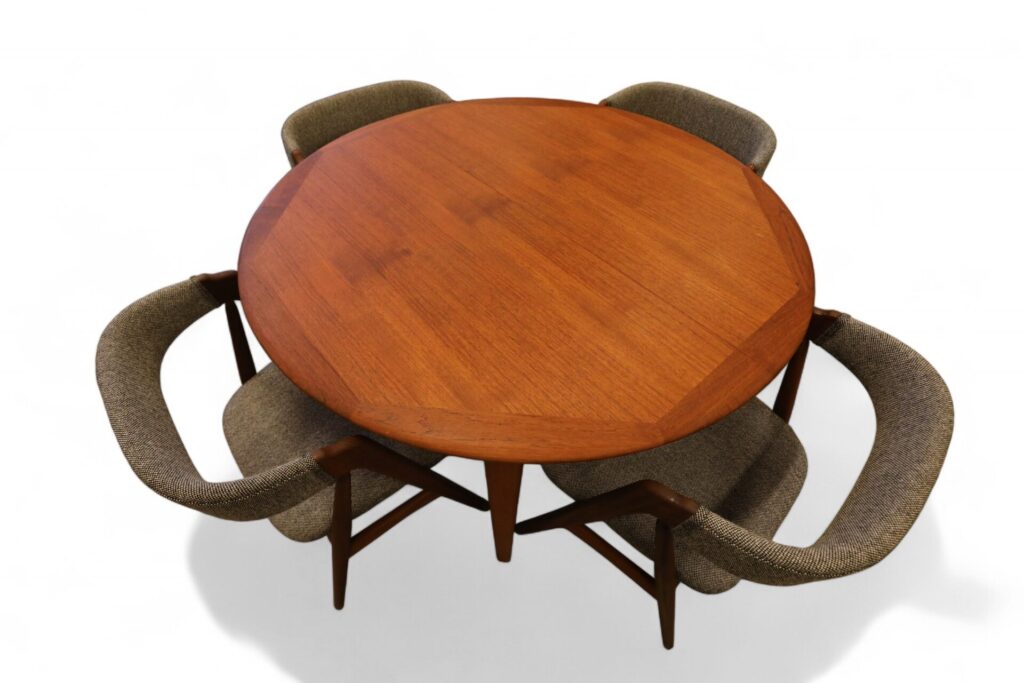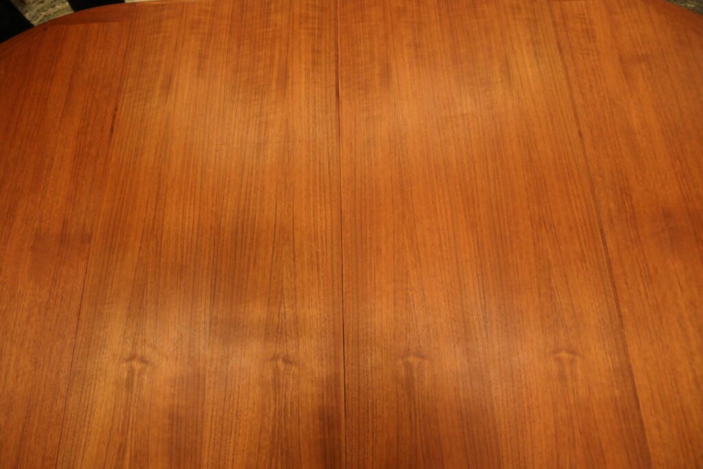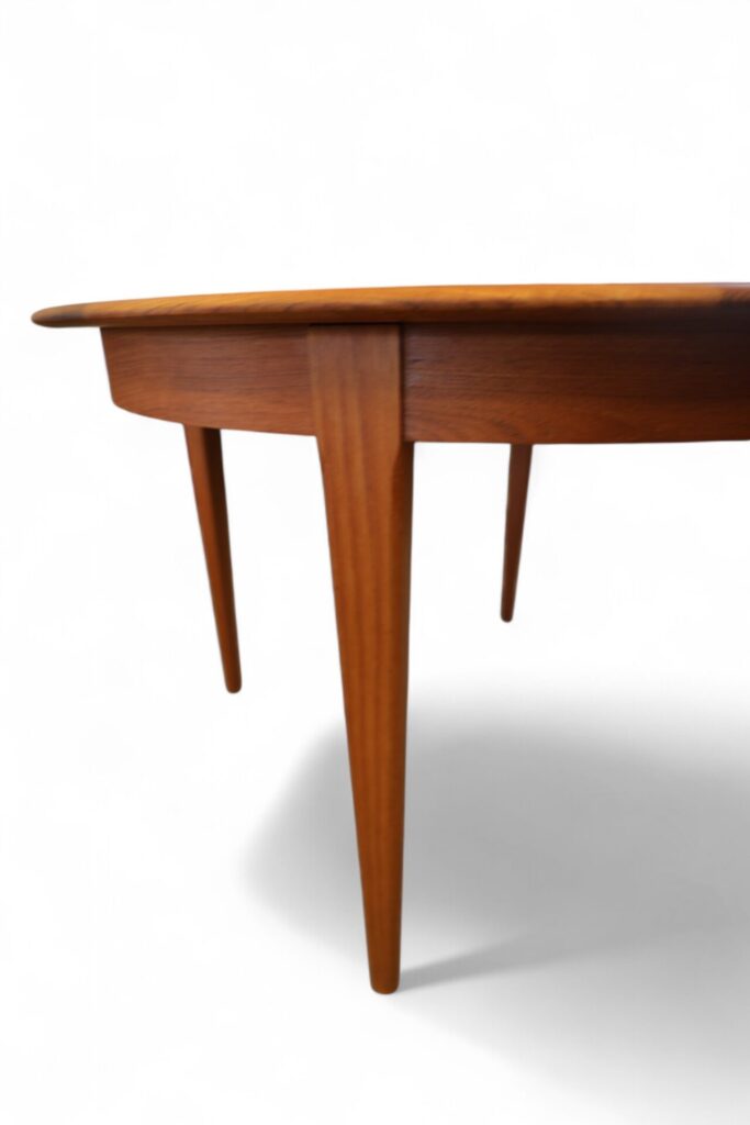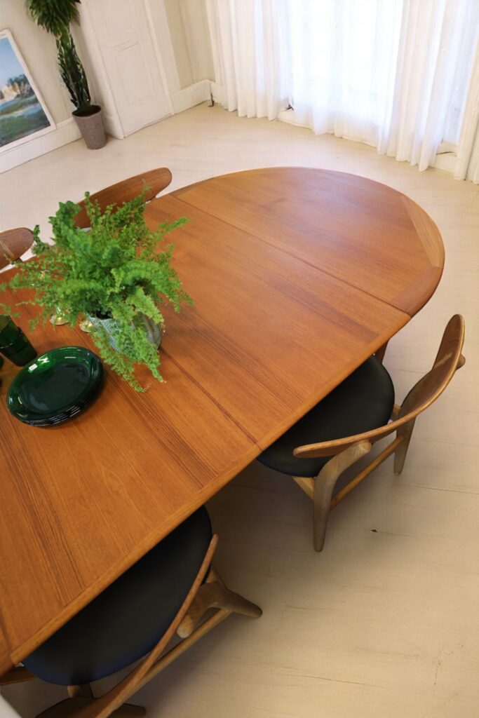 Danskt runt matbord i teak med iläggskivor. 114 ø+2×50 cm