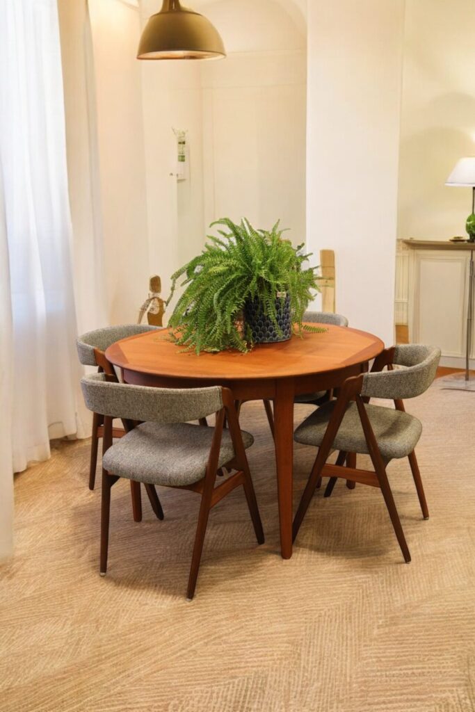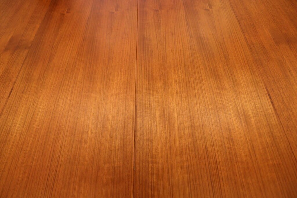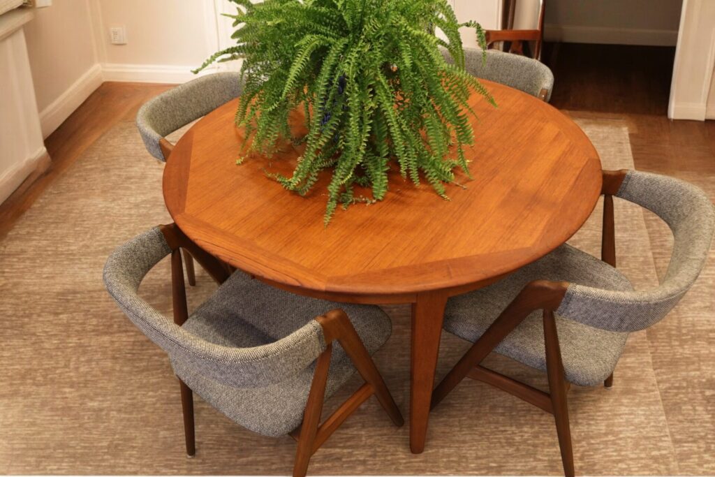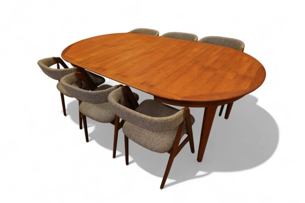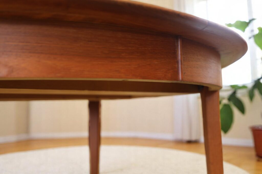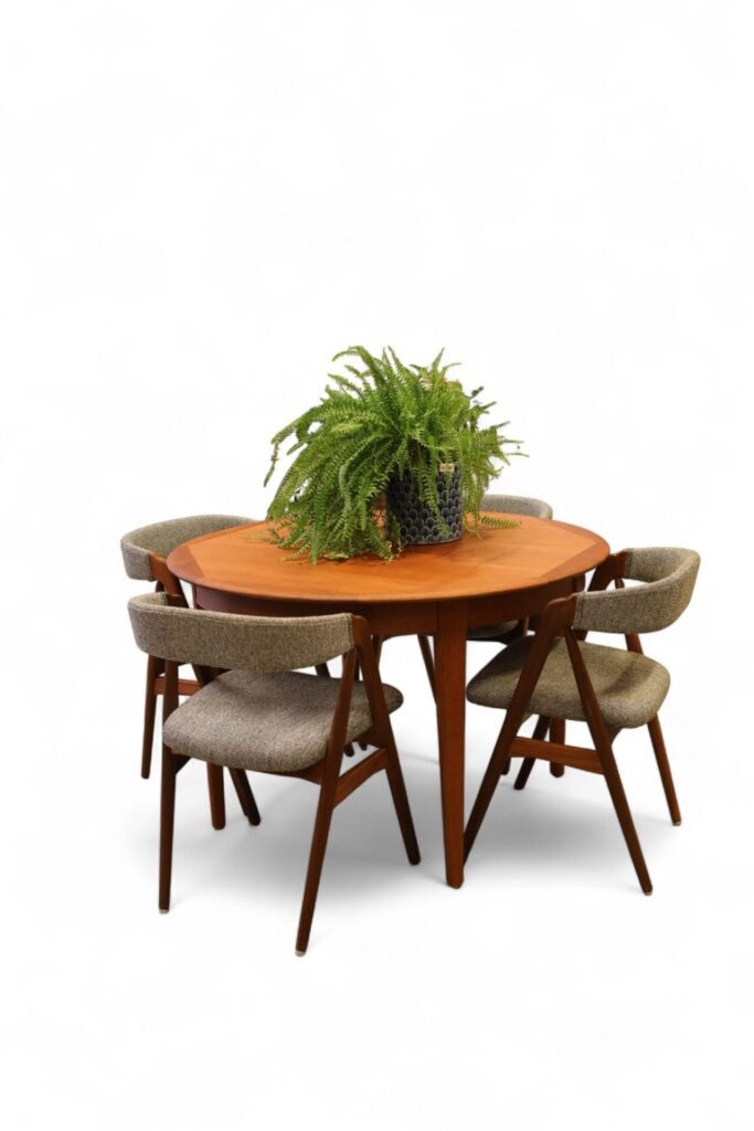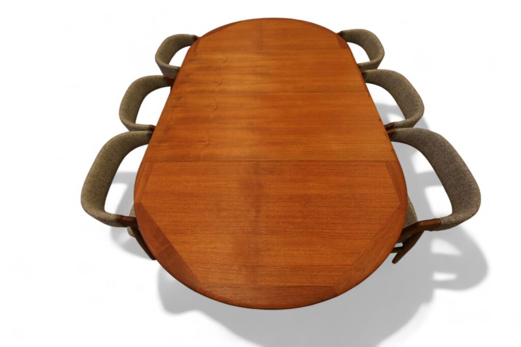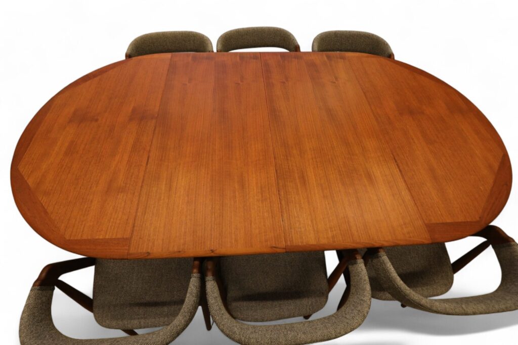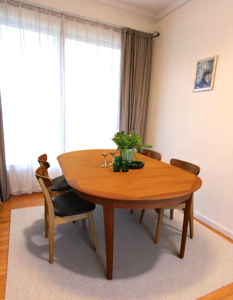 Danskt runt matbord i teak med iläggskivor. 114 ø+2×50 cm