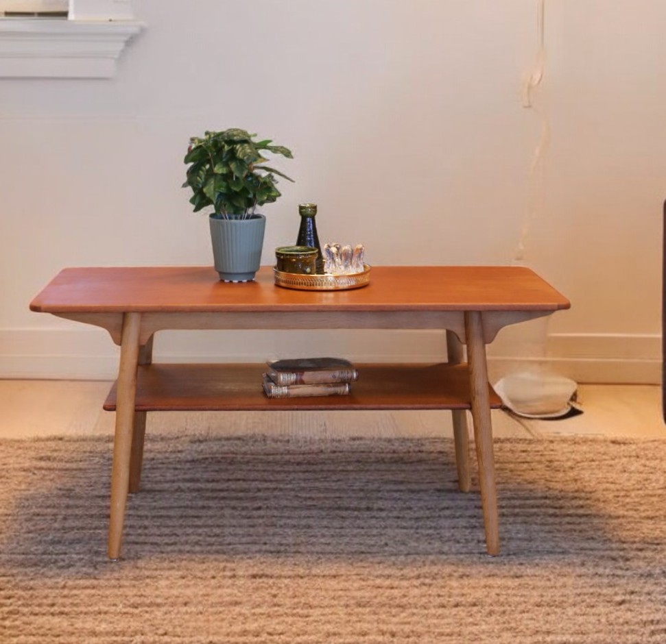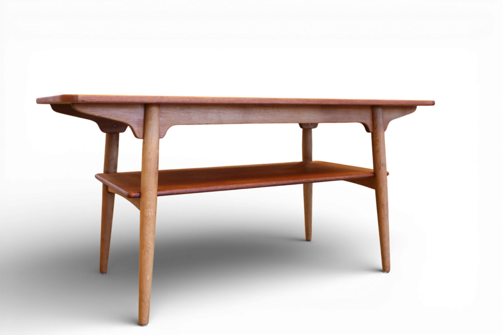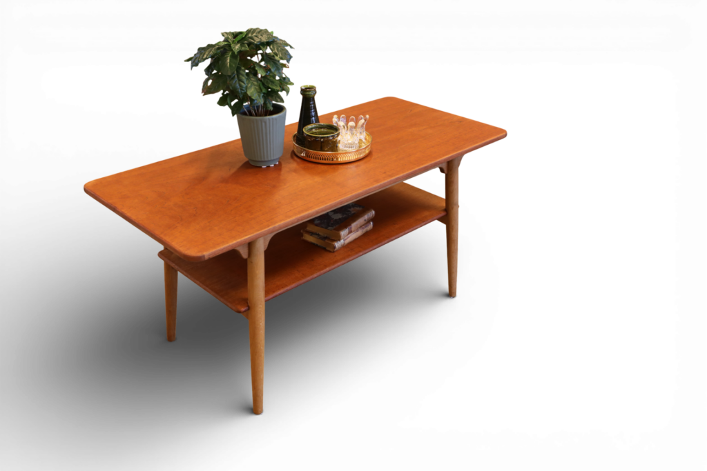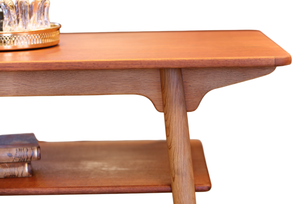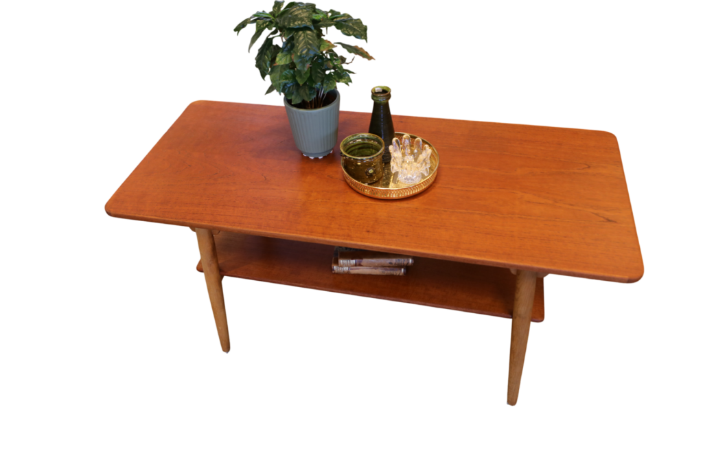 Danskt soffbord i en nätt och elegant modell som verkligen tillför stil och karaktär till ditt rum. Bordet har en slank och mjukt utformad bordsskiva i teak som ger en varm och inbjudande känsla. Benställningen är i ek och dessutom har bordet en praktisk tidningshylla. Ett soffbord som helt enkelt är en perfekt kombination av design och användbarhet.