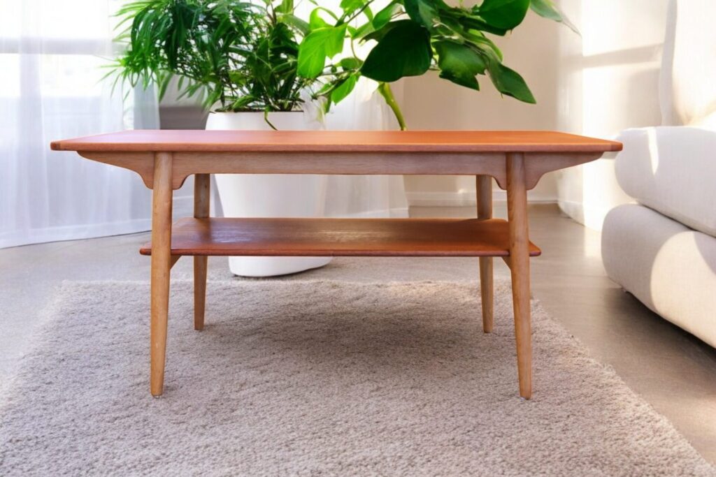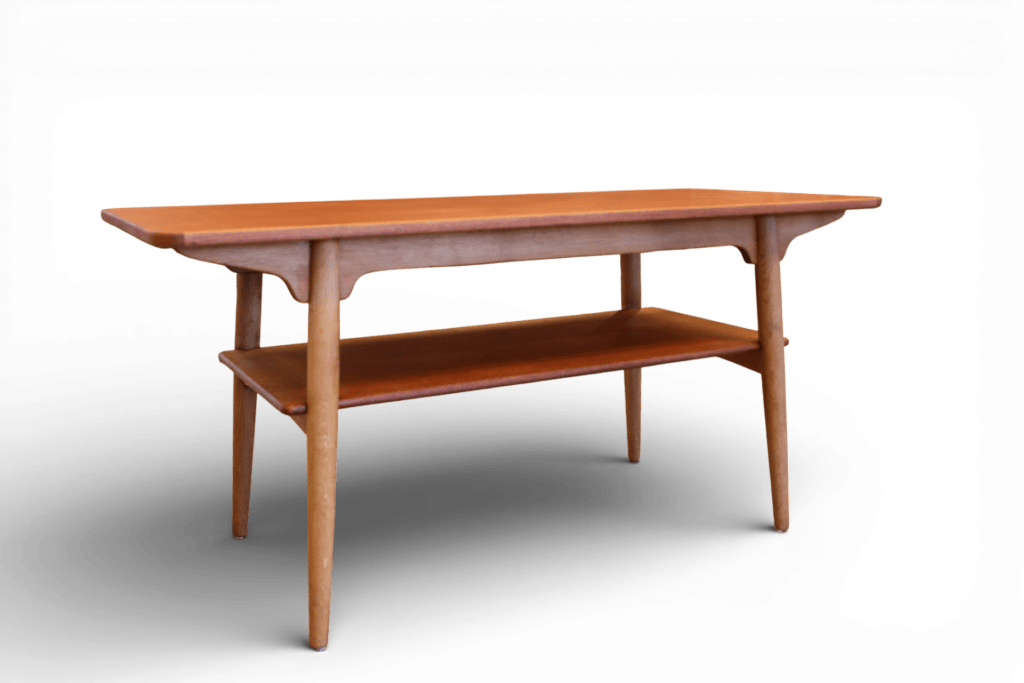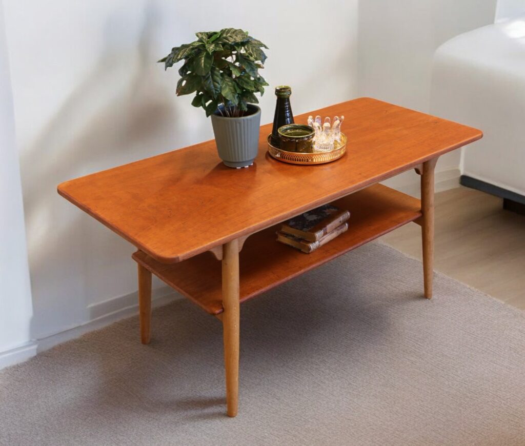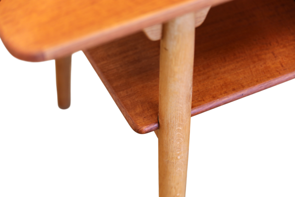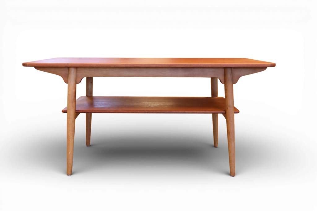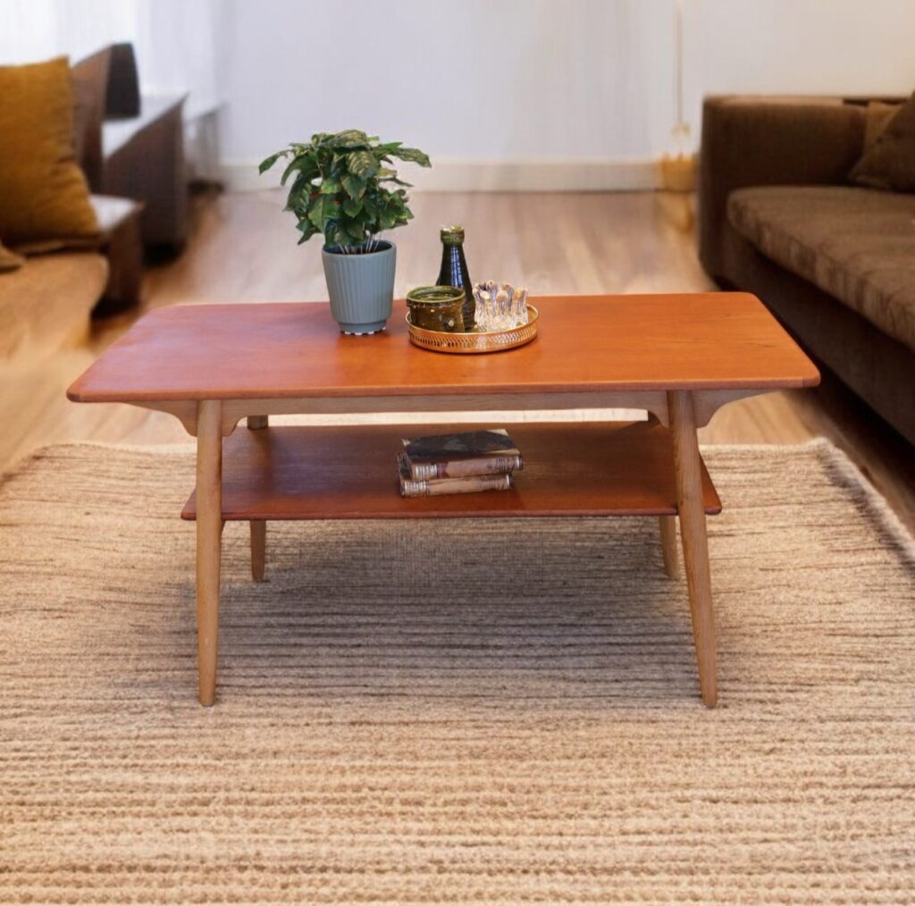 Danskt soffbord i en nätt och elegant modell som verkligen tillför stil och karaktär till ditt rum. Bordet har en slank och mjukt utformad bordsskiva i teak som ger en varm och inbjudande känsla. Benställningen är i ek och dessutom har bordet en praktisk tidningshylla. Ett soffbord som helt enkelt är en perfekt kombination av design och användbarhet.