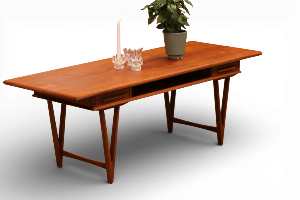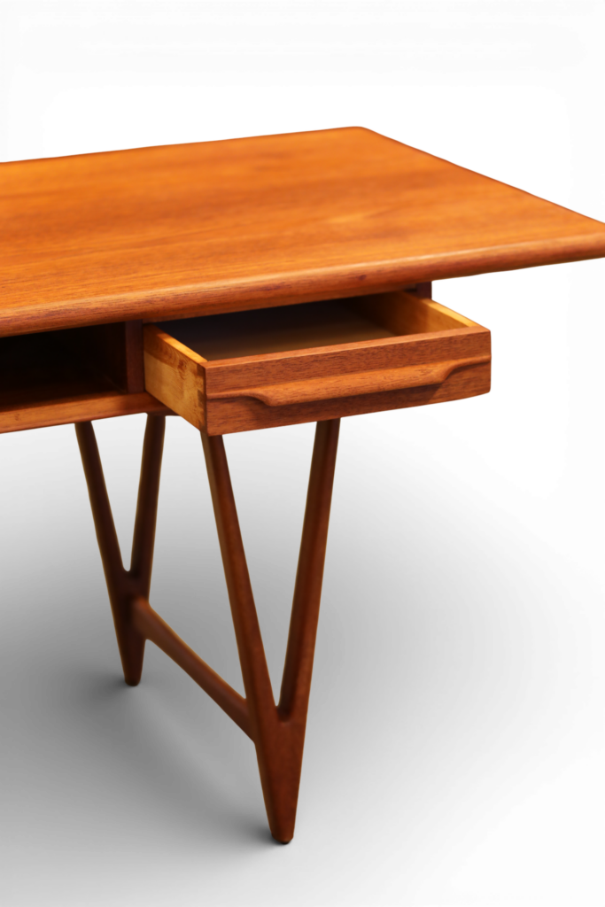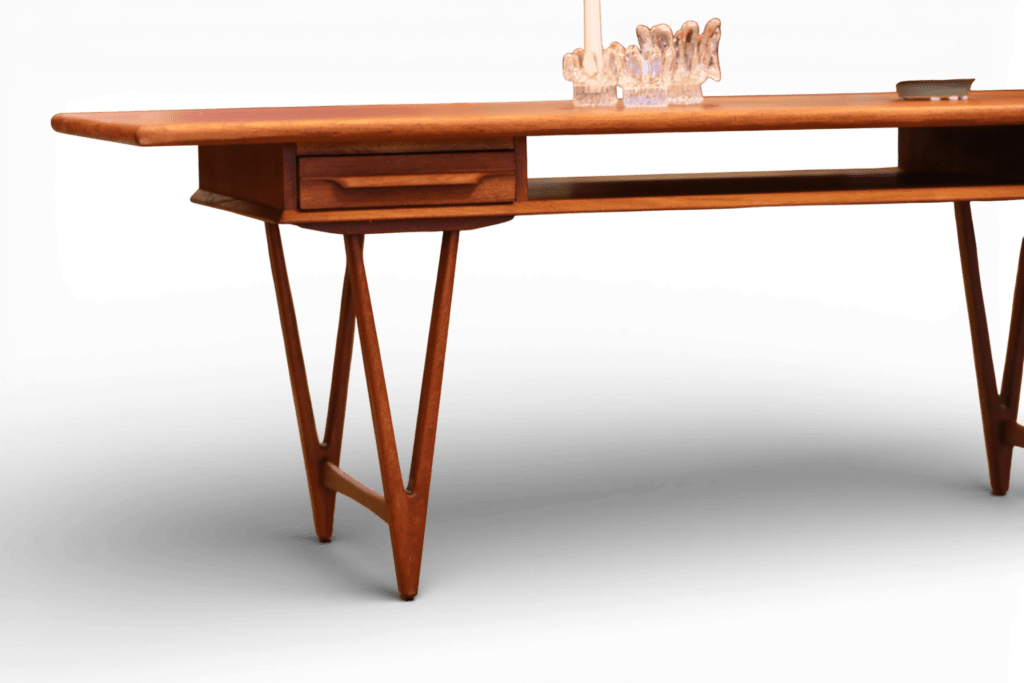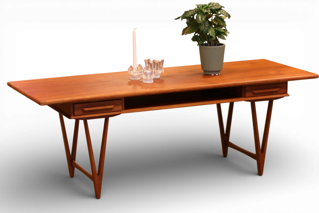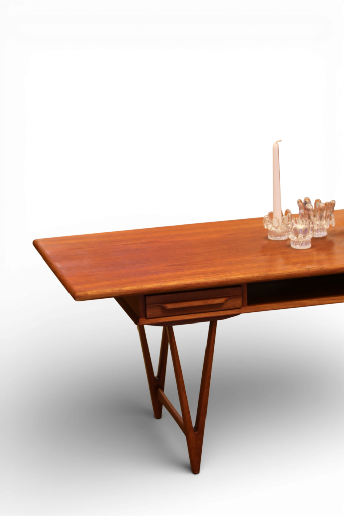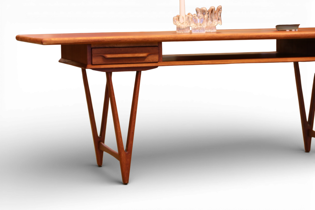 Bordet är i teak och står på V-formade ben samt har tidningshylla och dubbla lådor. Lådorna är genomgående så det går att nå dem praktiskt och smidigt från båda långsidorna Handtagen på lådfronterna är något utöver det vanliga med mjukt formade handtag, ett underbart hantverk.