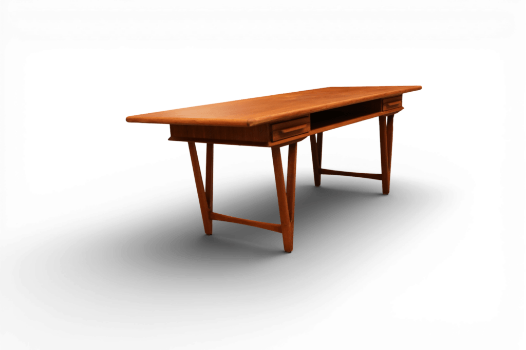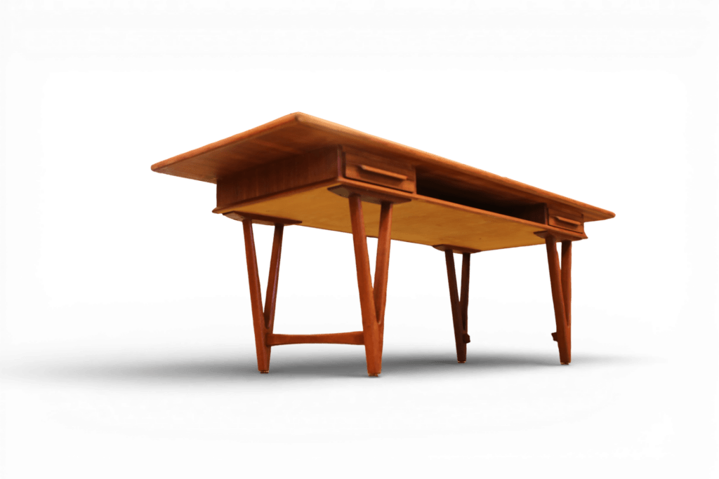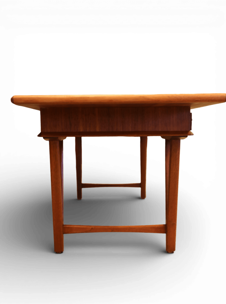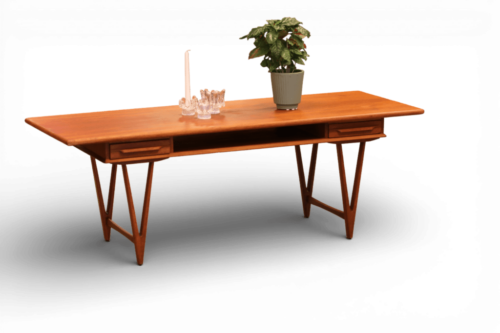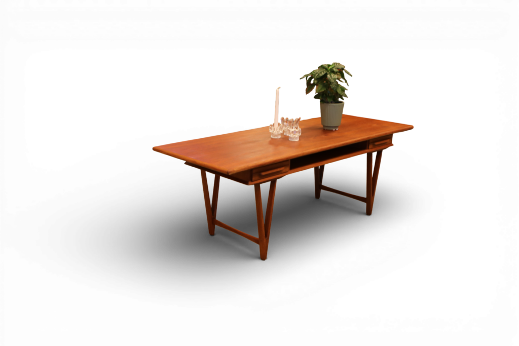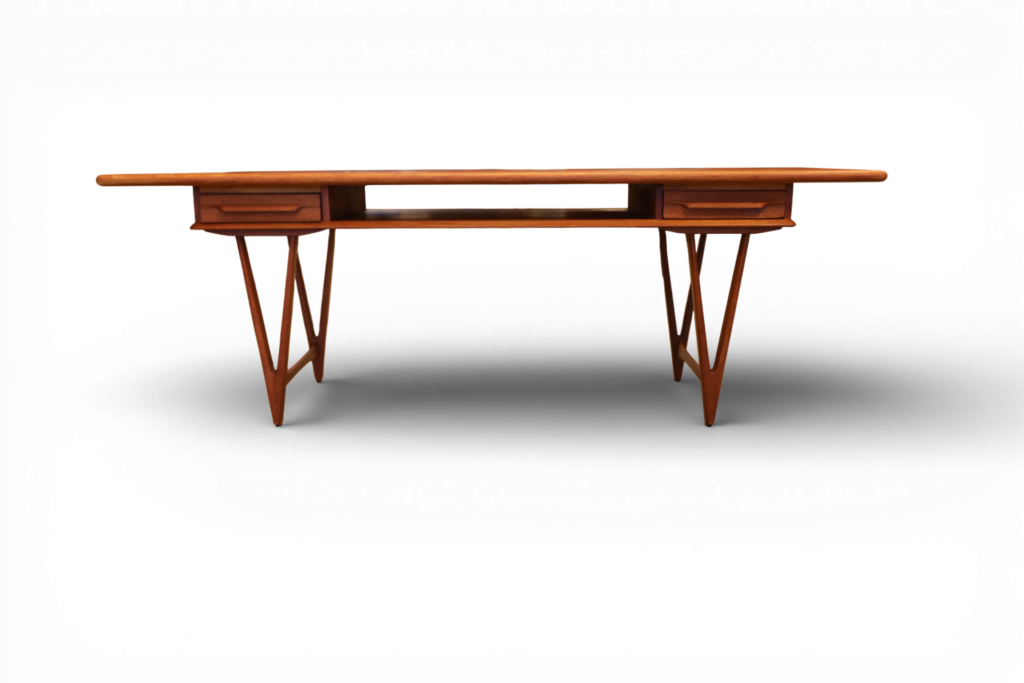 Bordet är i teak och står på V-formade ben samt har tidningshylla och dubbla lådor. Lådorna är genomgående så det går att nå dem praktiskt och smidigt från båda långsidorna Handtagen på lådfronterna är något utöver det vanliga med mjukt formade handtag, ett underbart hantverk.