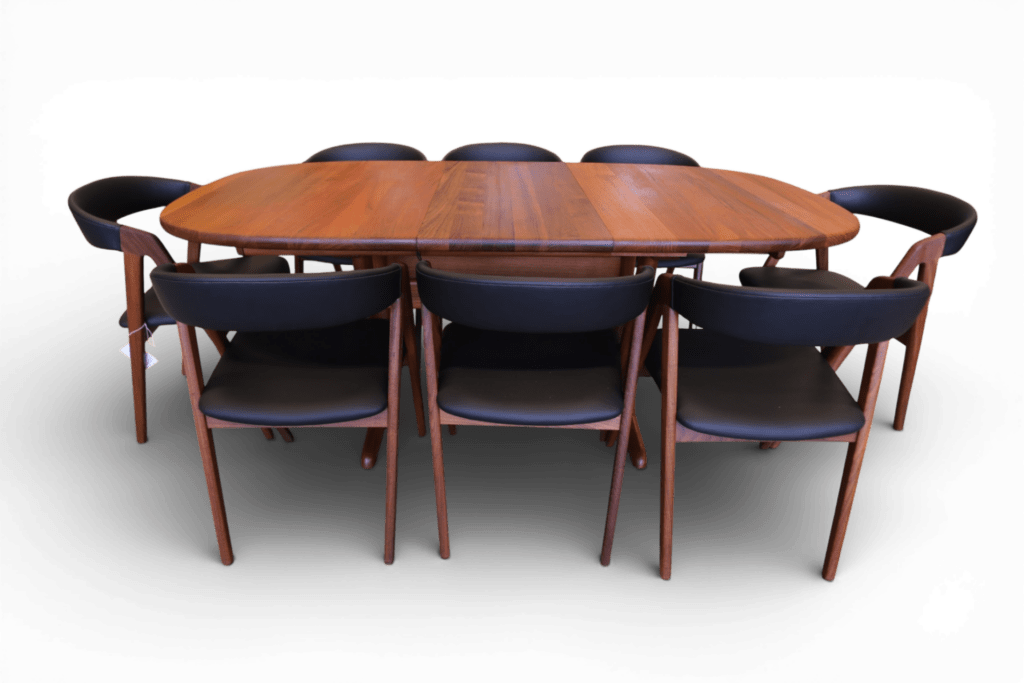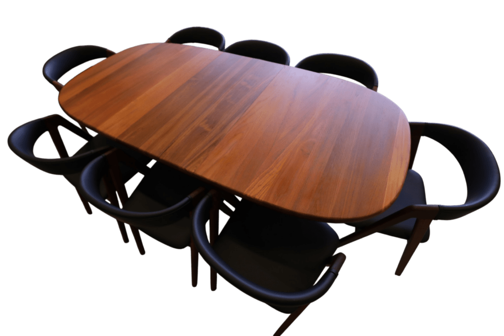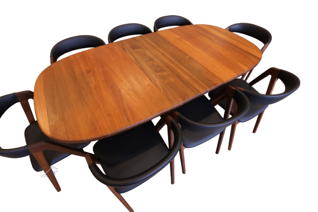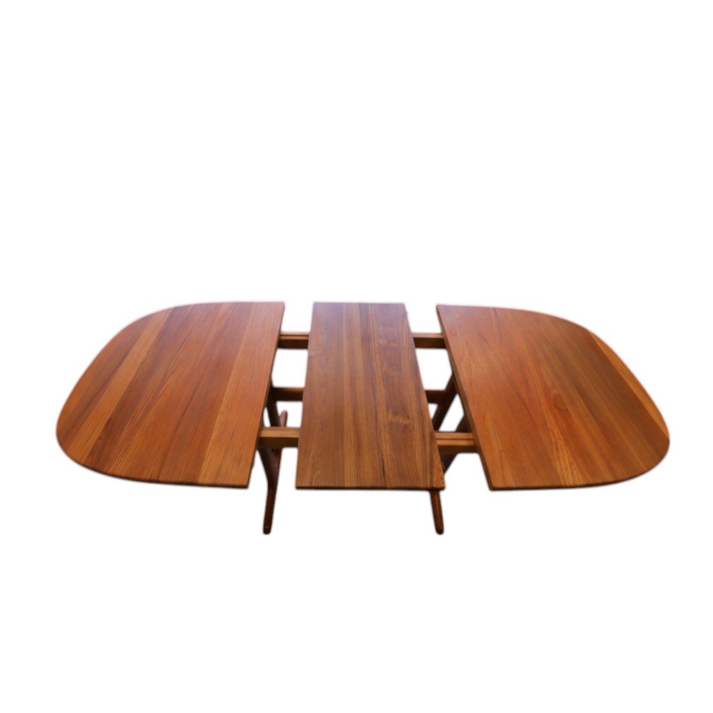 Perfekt och stadigt matbord, även för en barnfamilj. Det går att renovera bordet oändligt många gånger utan problem i och med att bordet är i massiv teak, bordsskivan är på hela 3.5 cm! Iläggsskivorna är även de massiva men är tunnare på mitten och det gör dem betydligt lättare att hantera.