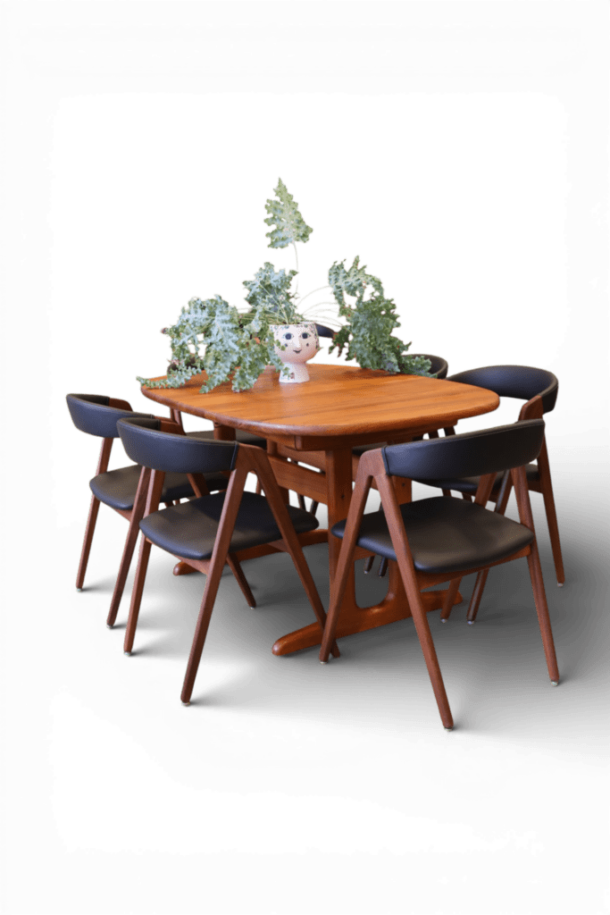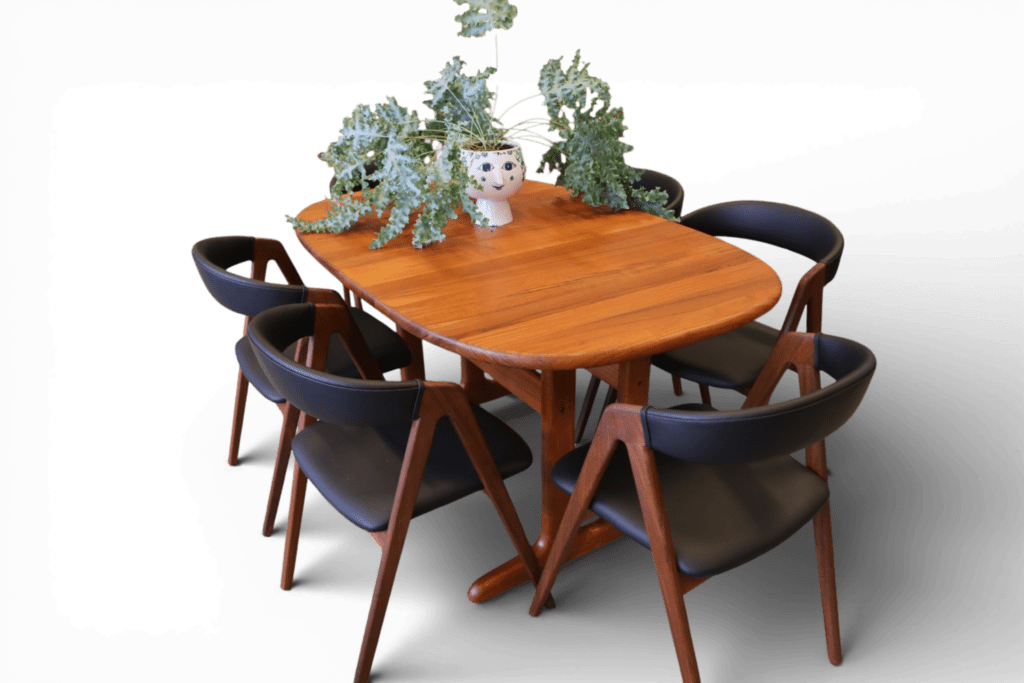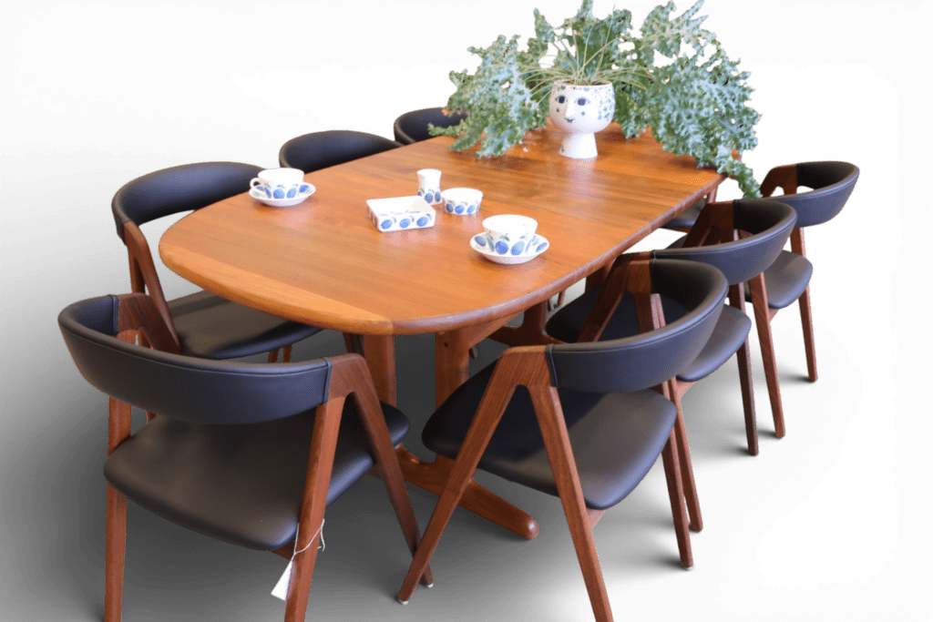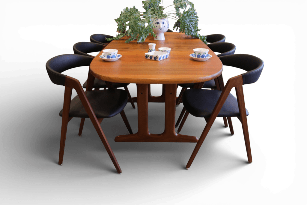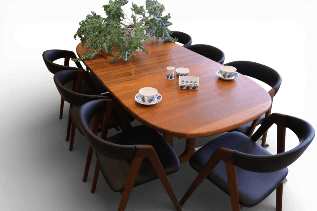 Perfekt och stadigt matbord, även för en barnfamilj. Det går att renovera bordet oändligt många gånger utan problem i och med att bordet är i massiv teak, bordsskivan är på hela 3.5 cm! Iläggsskivorna är även de massiva men är tunnare på mitten och det gör dem betydligt lättare att hantera.