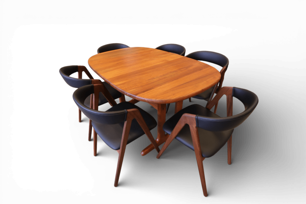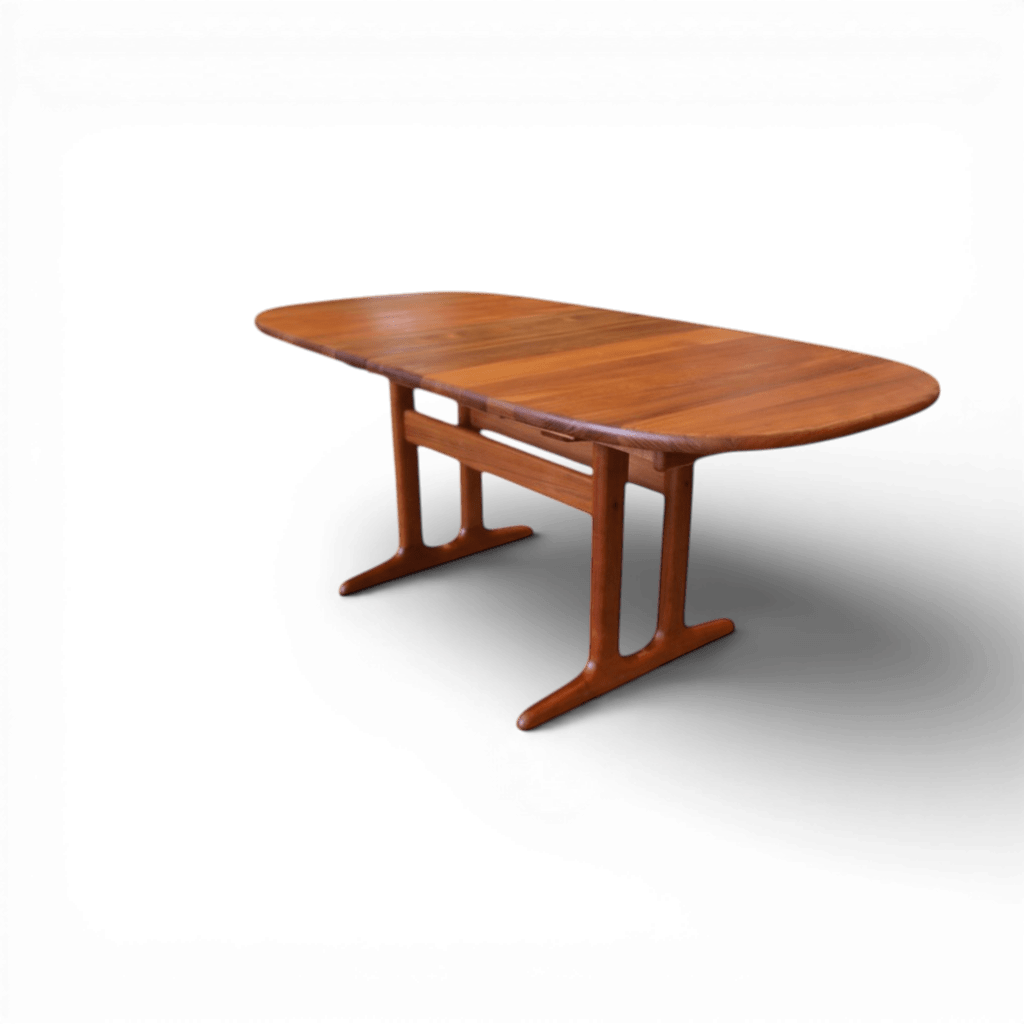 Matbordet i en stilren modell från danska företaget Glostrup med oval bordsskiva i massiv teak samt iläggsskiva.