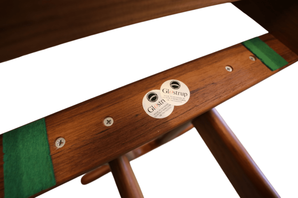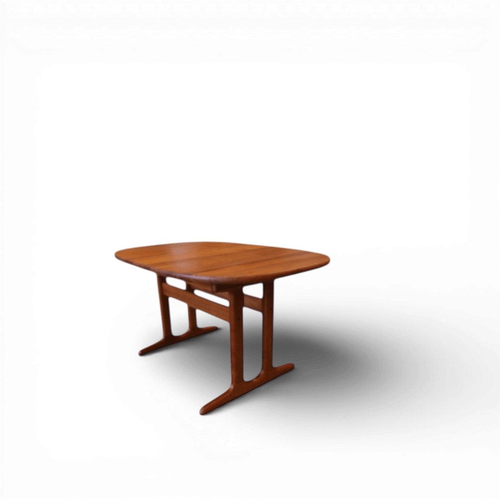 Bordet har mjukt rundade kanter och hörn samt en gyllene brun ton som är typiskt för de danska teakmöblerna. Det här bordet är ytterst välgjort och påkostat, hela stommen inklusive underrede mm är i massiv teak.