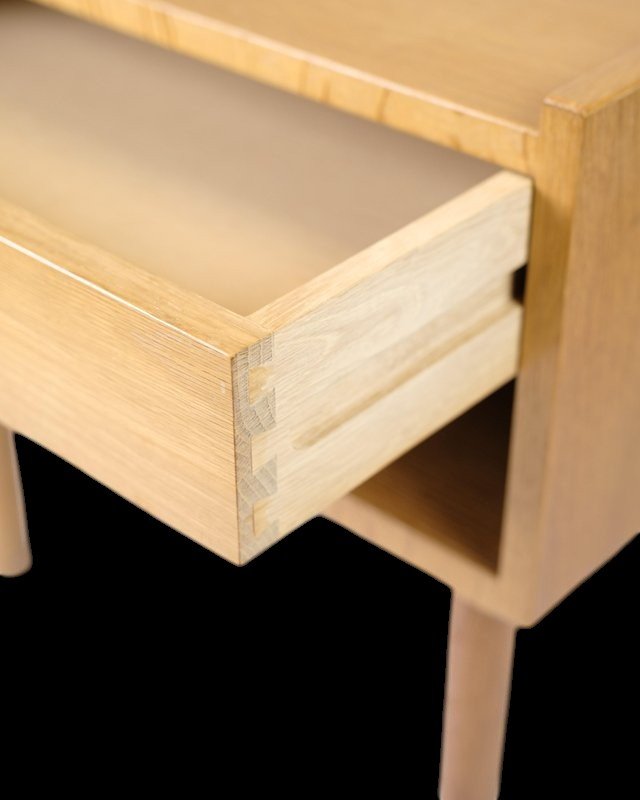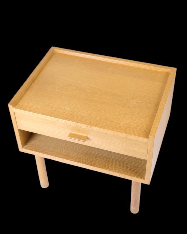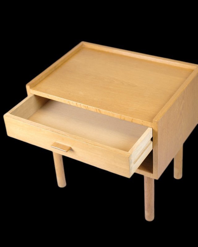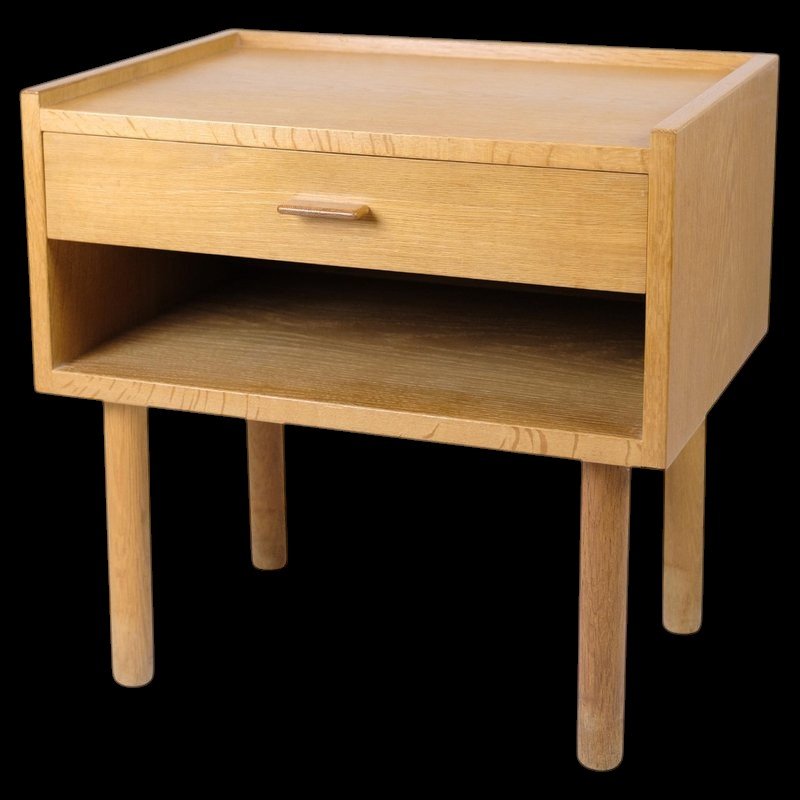 Borden har modellnummer GE 430 och är utformad med en låda i fronten, som har ett stilrent handtag i ek. Under lådan finns en praktisk hylla som är perfekt för att förvara tidningar, böcker och annat småplock som du vill ha inom räckhåll. Hyllan och lådan erbjuder en utmärkt lösning för att hålla sovrummet organiserat.