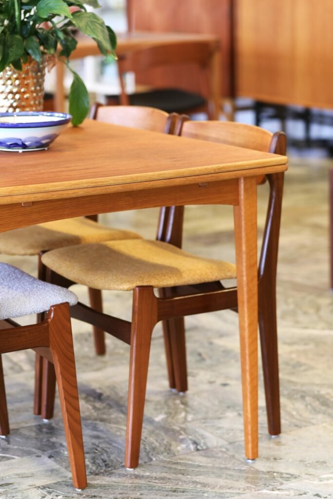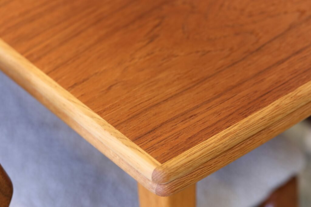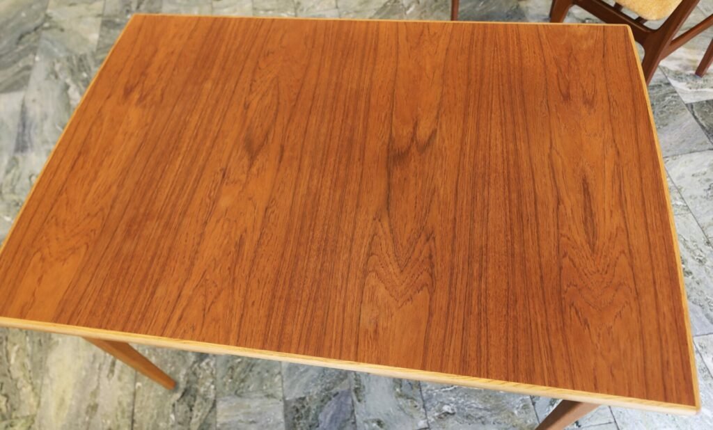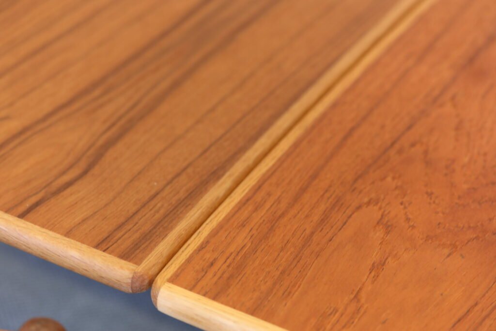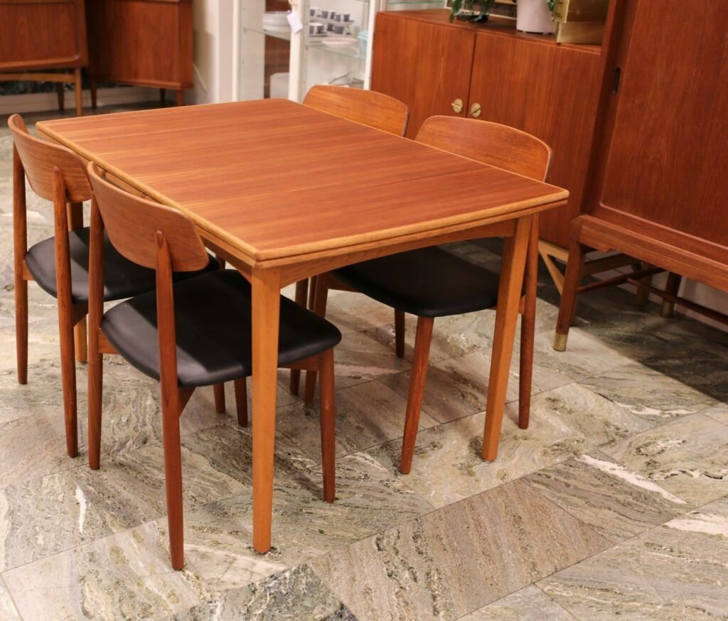Nätt och elegant matbord med bordsskivor i teak med friser och ben i ek. Kombinationen teak och ek var mycket vanlig på 50/60-talet och gör det lätta att kombinera med stolar i båda de träslagen!