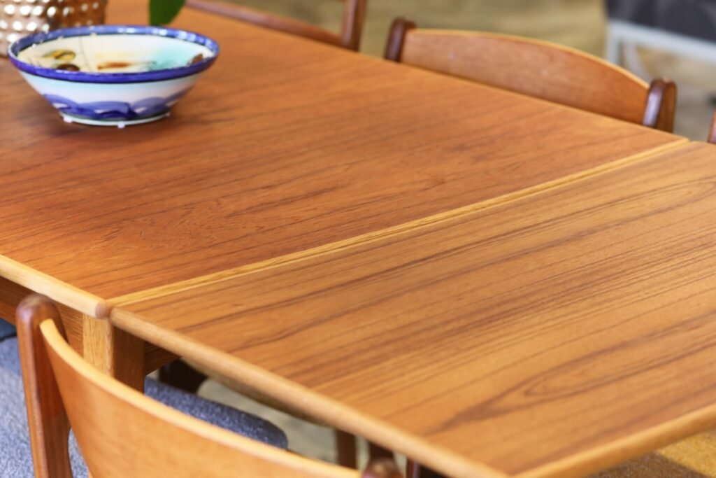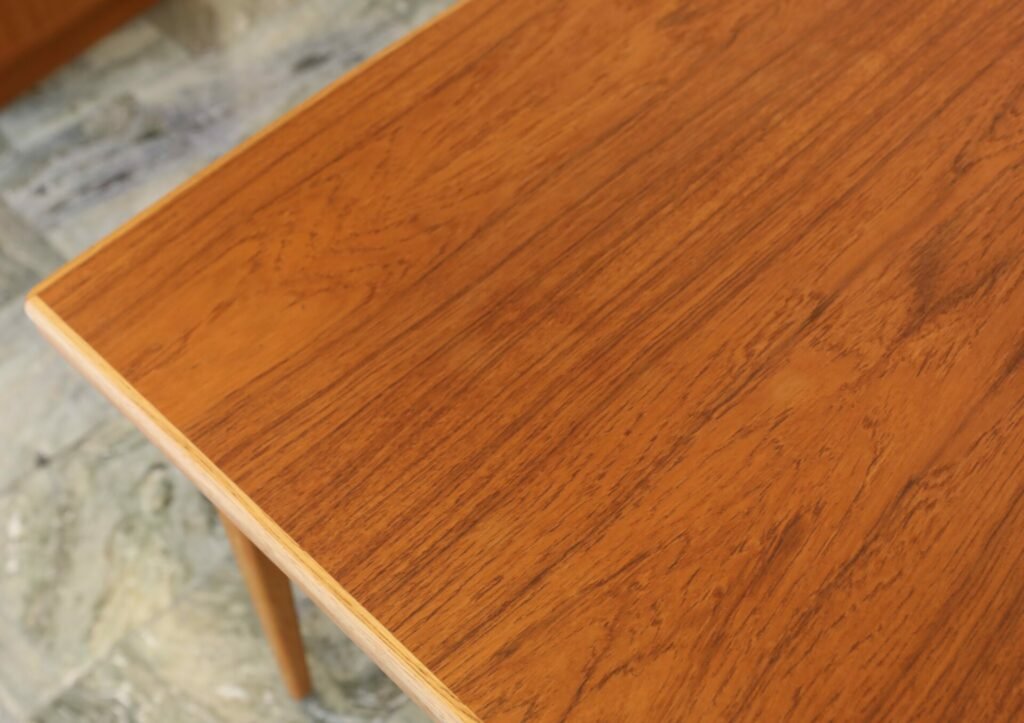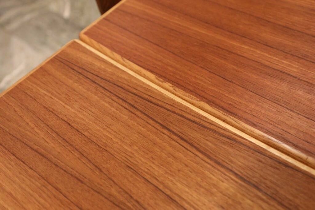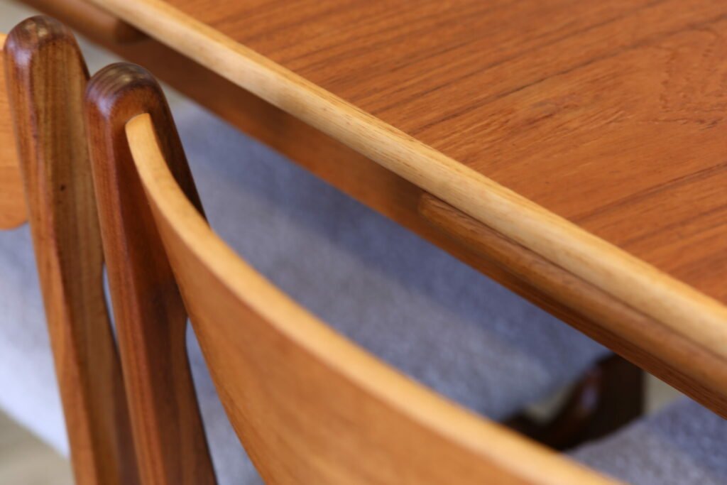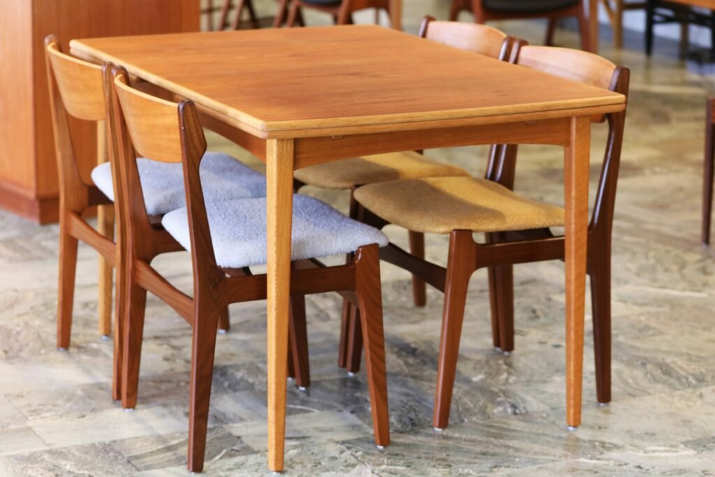 Nätt och elegant matbord med bordsskivor i teak med friser och ben i ek. Kombinationen teak och ek var mycket vanlig på 50/60-talet och gör det lätta att kombinera med stolar i båda de träslagen!