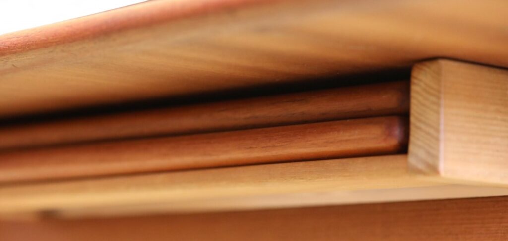 Till bordet hör två iläggsskivor som enkelt kan förvaras under bordet, alltid redo att användas när behovet uppstår. När de ska anävndas placeras skivorna i två ramar som dras ut från varje kortsida, Det är möjligt att använda en skiva i taget eller båda samtidigt, beroende på sällskapets storlek och behov. När båda iläggsskivorna är i bruk får man plats med åtta till tio sittplatser, perfekt för större sammankomster.