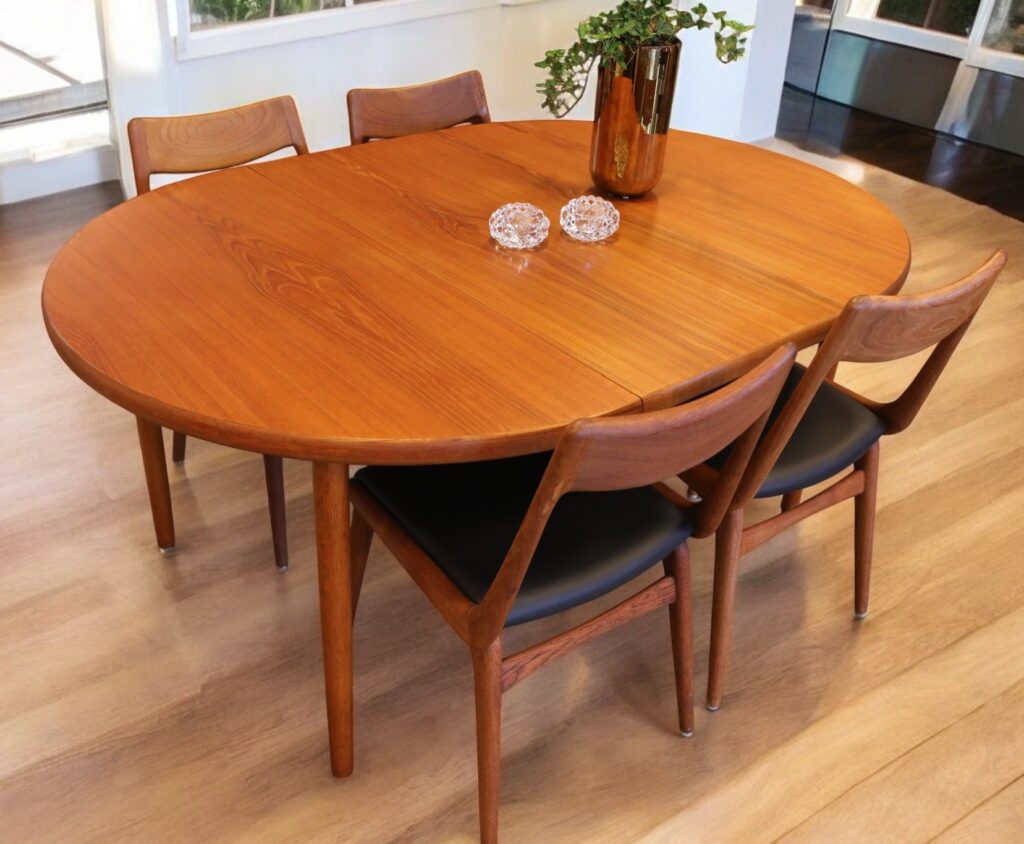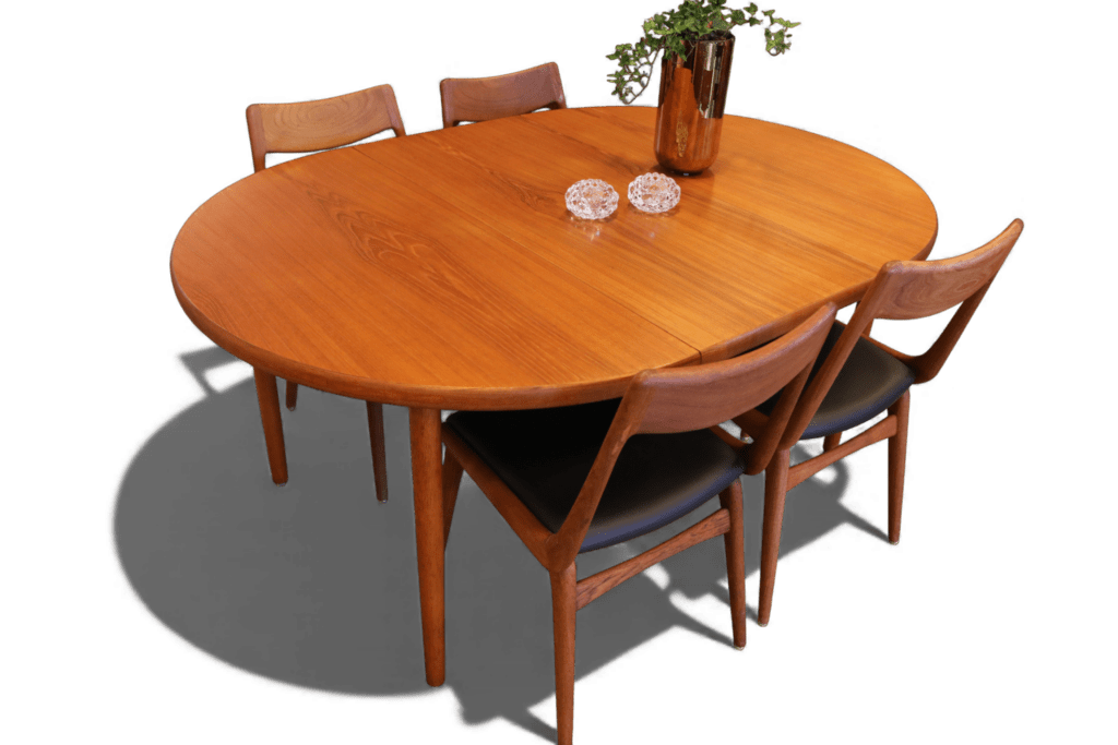 Matbordet är i teak med en mustig ton som verkligen framhäver träets naturliga skönhet. Bordet har en iläggsskiva, vilket gör det både praktiskt och mångsidigt. När skivan är i bordet på plats, finns det gott om utrymme för sex sittplatser, vilket gör det idealiskt för såväl familjemiddagar som festliga tillställningar med vänner. Bordsskivan och iläggsskivan har likadana kanter, vilket ger en fin och sammanhållen profil som gör att bordet ser elegant ut oavsett om det används i ett vardagsrum eller i en matsal. Den låga kanten ger en fördel genom att en eventuell förvaring av skivan underlättas, så att det alltid finns en smidig lösning för alla dina behov. Detta gör att bordet inte bara är en praktisk möbel, utan också en stilfull inredningsdetalj i hemmet.
