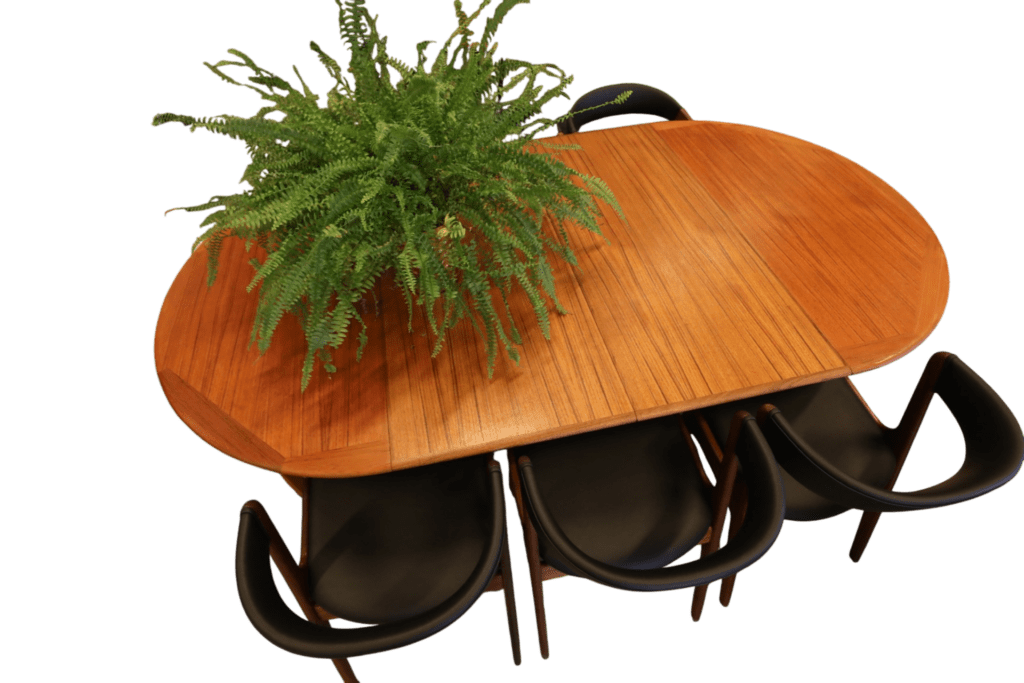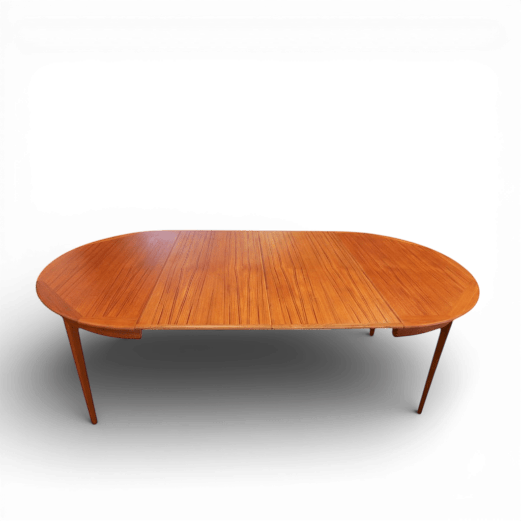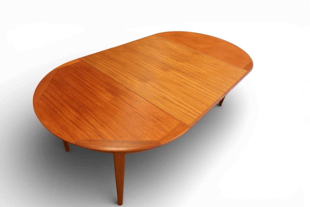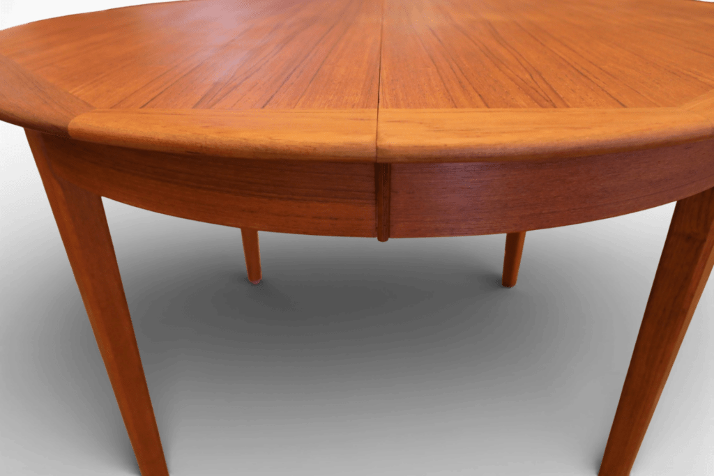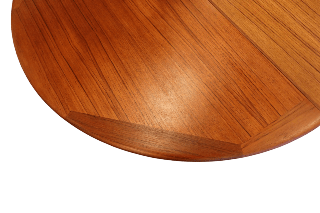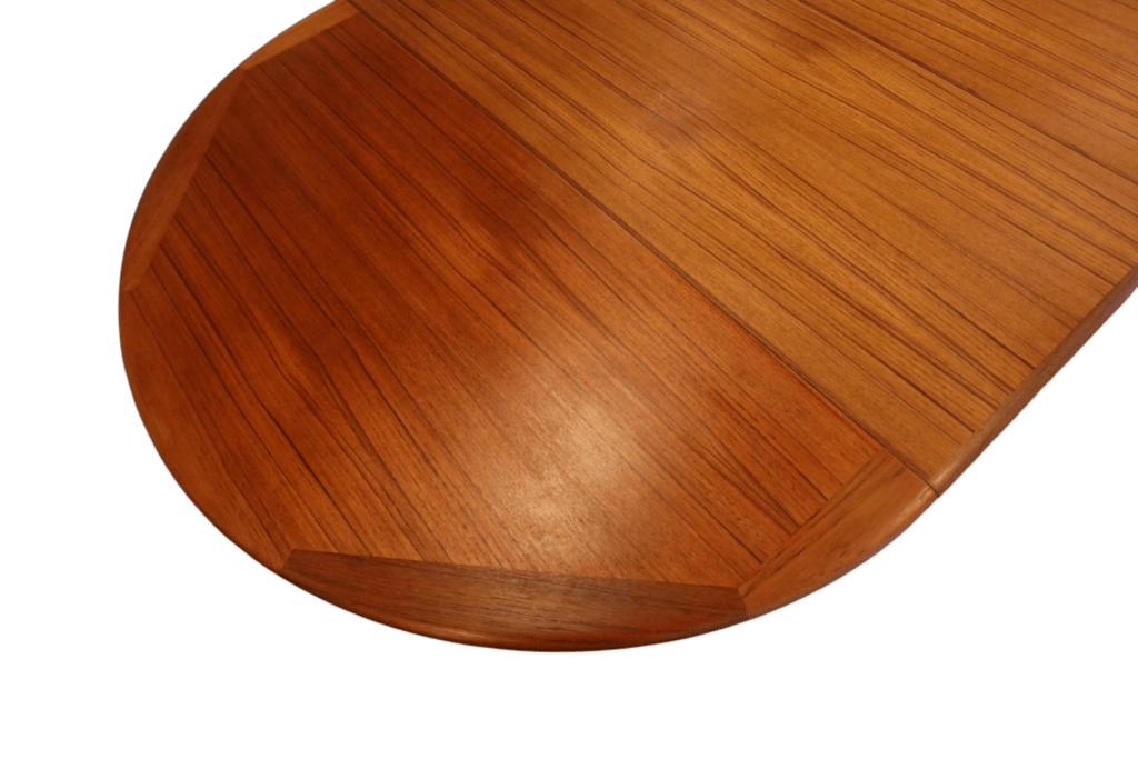 Bordet är tillverkat i teak med en varm, mustig ton och en mycket vacker ådring över hela bordsskivan. Den breda inramande frisen ger bordet en elegant karaktär, medan iläggsskivorna har en något smalare fris som fint följer designen.