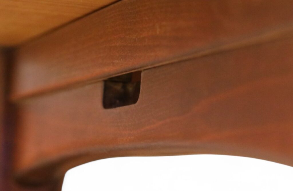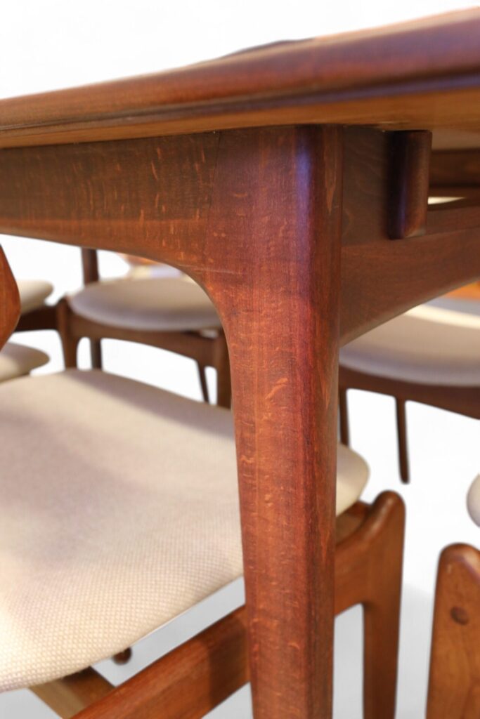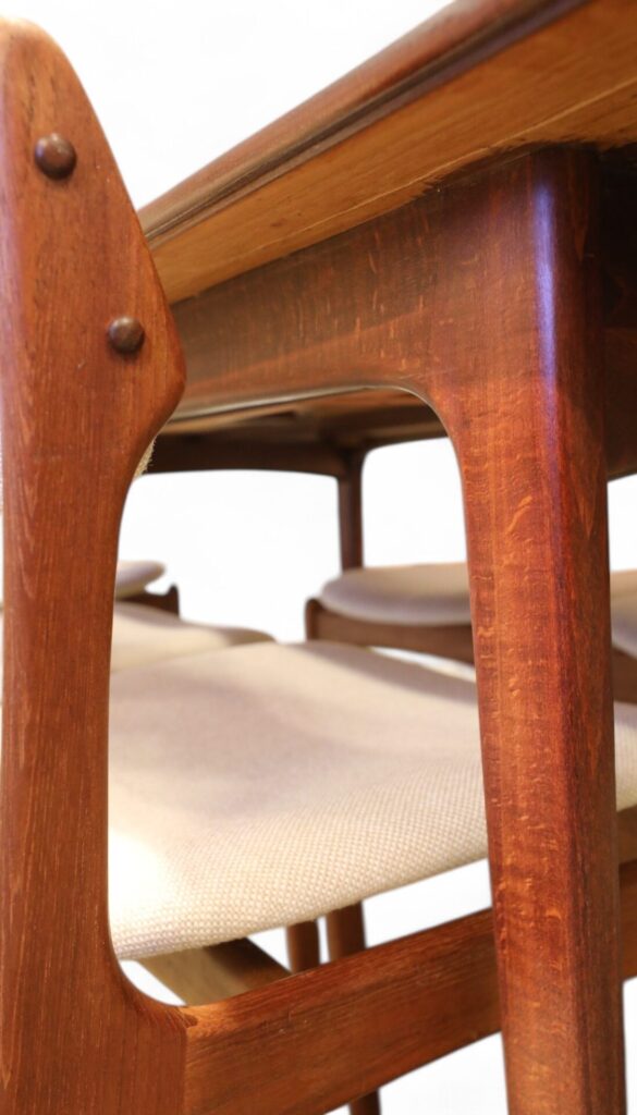 Bordet står på ben som är en aning snedställda samt ovala, vilket ger det en modern estetik. Benen, liksom hela bordets underrede, är mjukt formade och tillverkade med utmärkt hantverksskicklighet. Benställningen är i betsad ek, vilket ger en mycket snygg kontrast mot bordsskivan i teak och skapar en harmonisk balans mellan de olika materialens färger och strukturer.