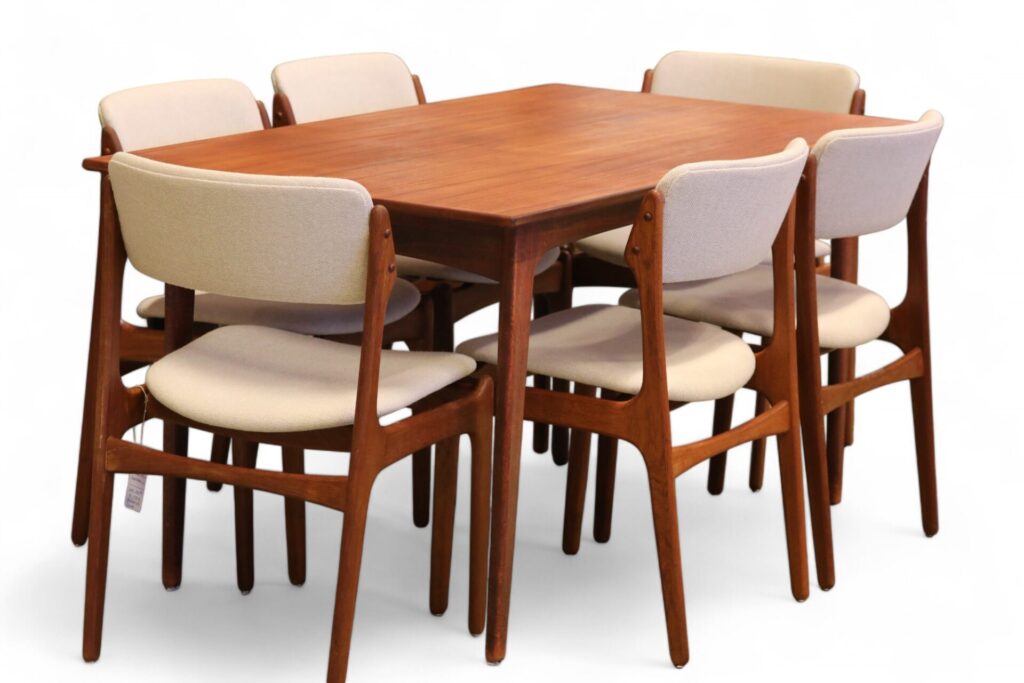 Danskt stilrent matbord i teak med dubbla ilägg. 150x83x75+2×45 cm