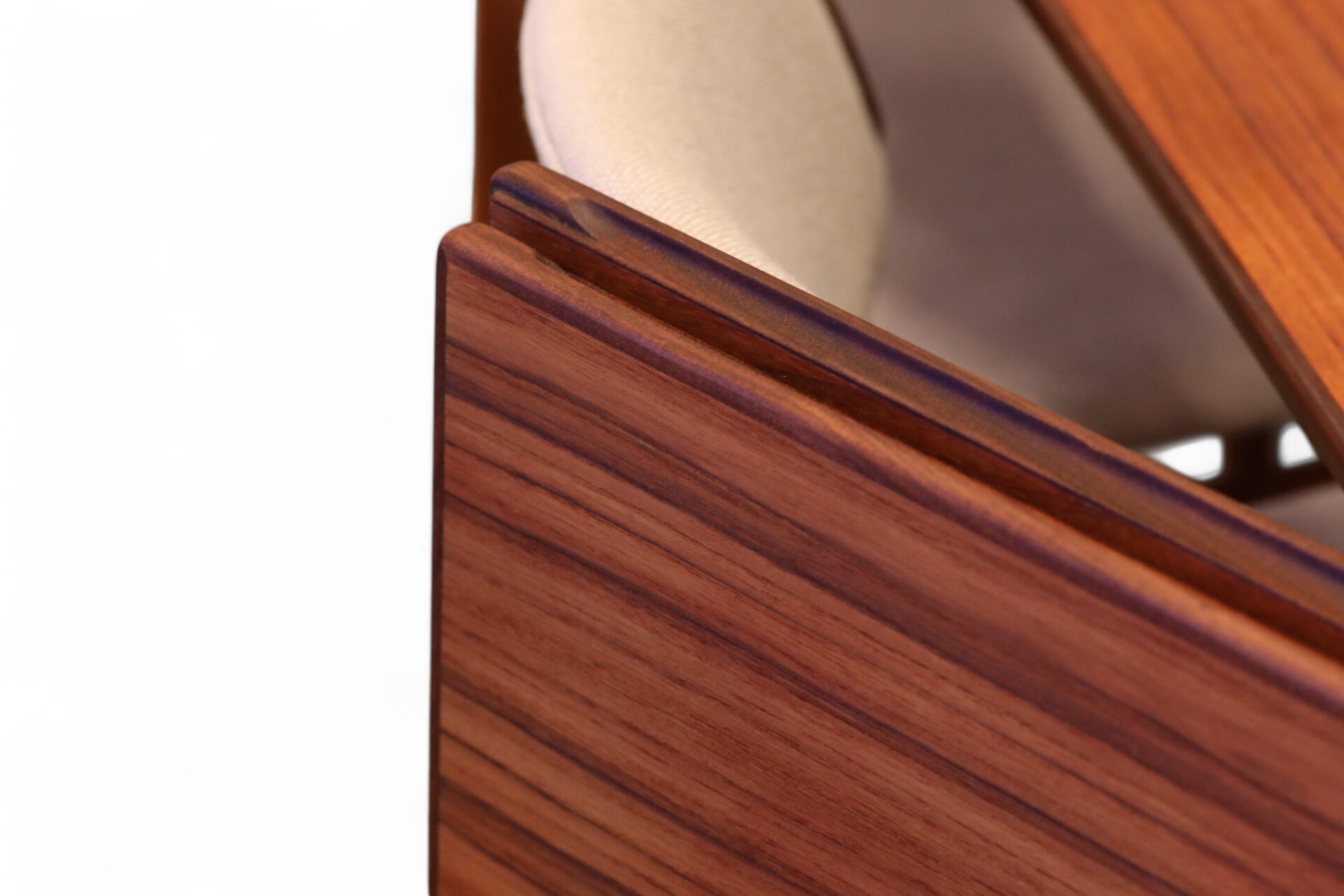 Bordet står på ben som är en aning snedställda samt ovala, vilket ger det en modern estetik. Benen, liksom hela bordets underrede, är mjukt formade och tillverkade med utmärkt hantverksskicklighet. Benställningen är i betsad ek, vilket ger en mycket snygg kontrast mot bordsskivan i teak och skapar en harmonisk balans mellan de olika materialens färger och strukturer.