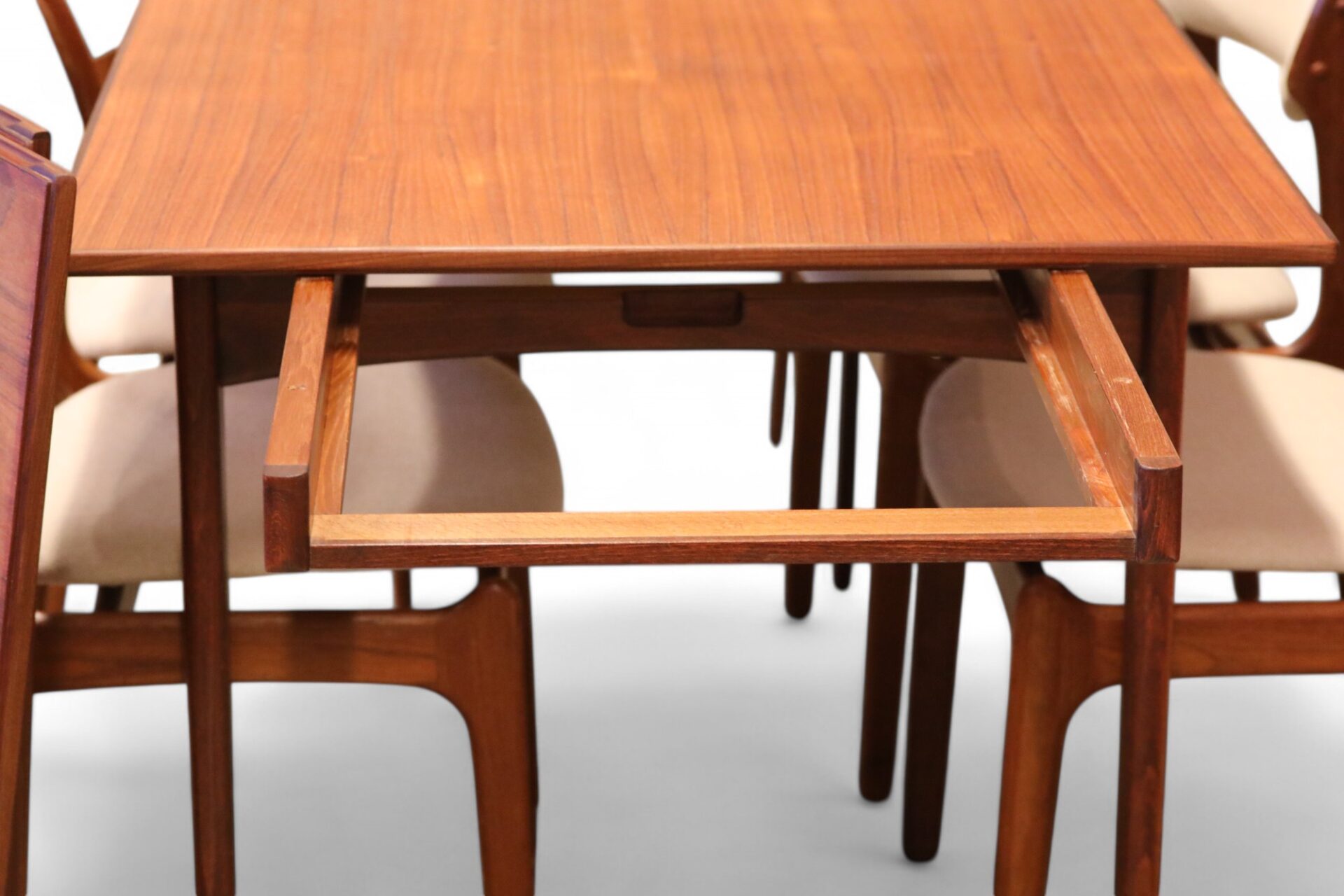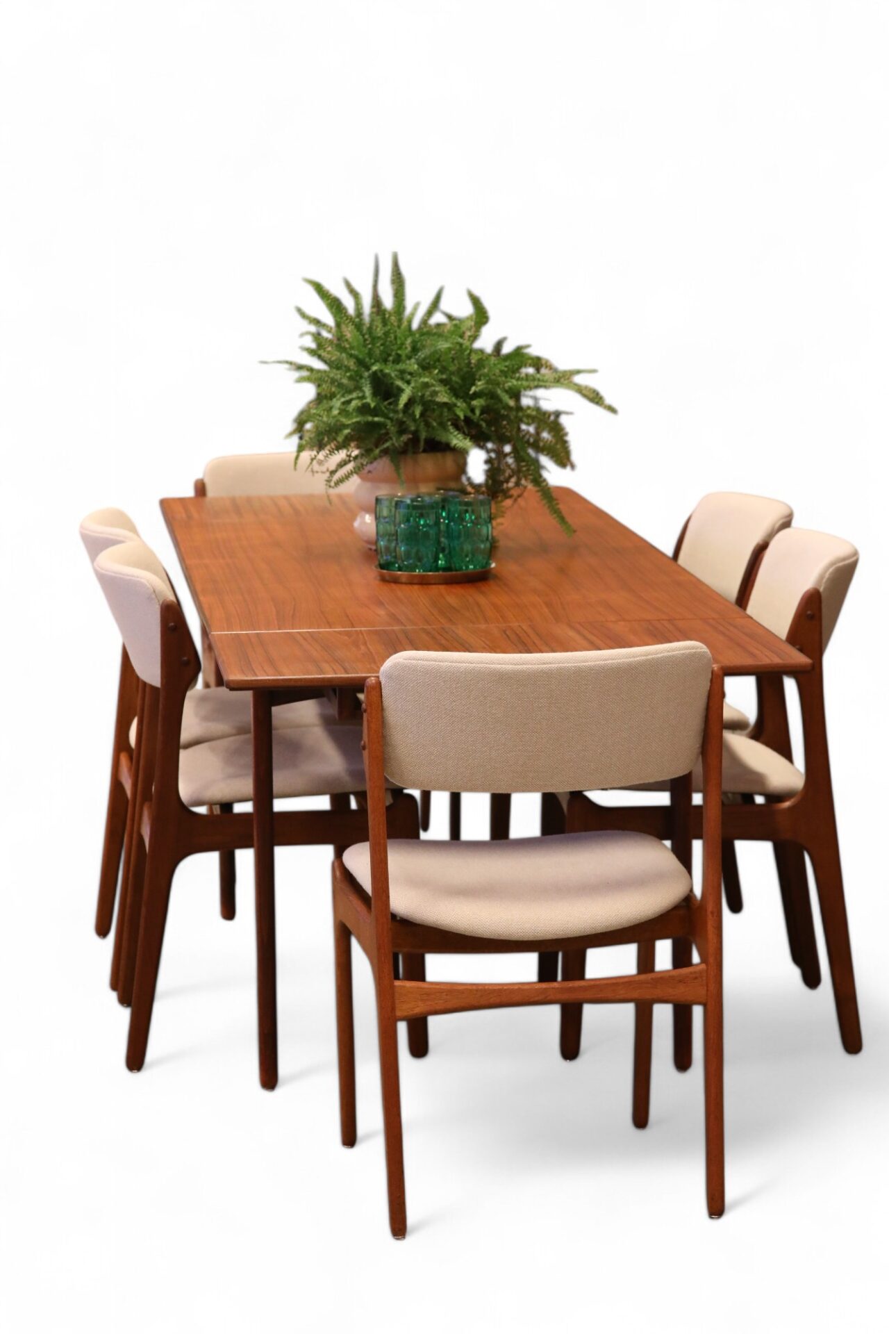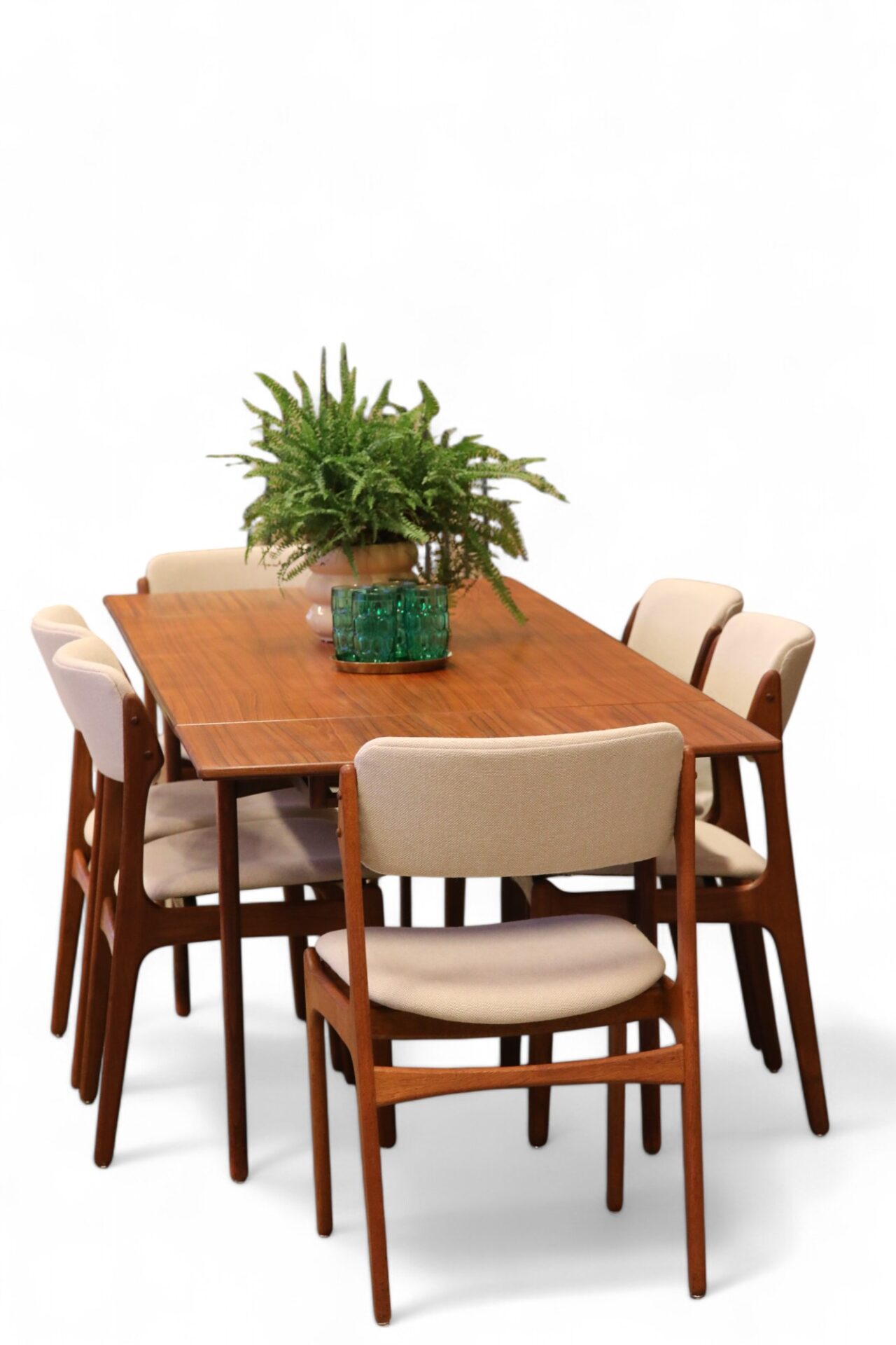 Danskt stilrent matbord i teak med dubbla ilägg. 150x83x75+2×45 cm