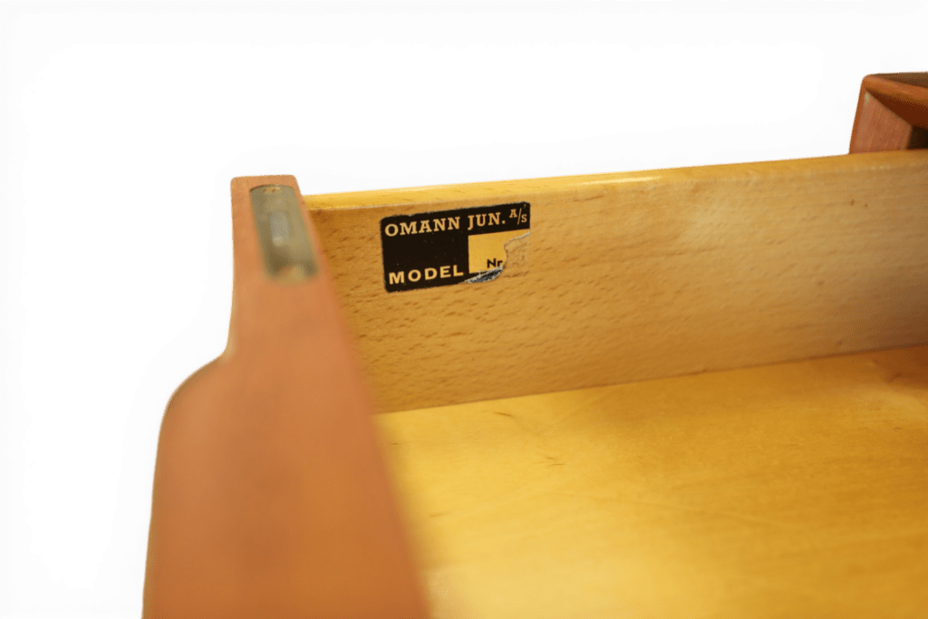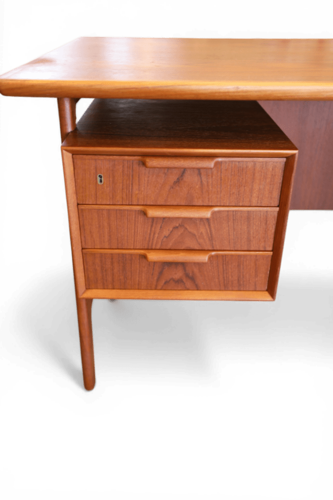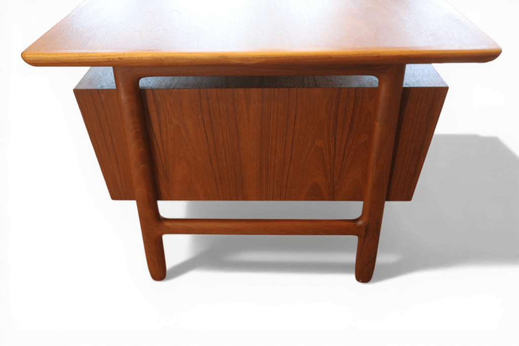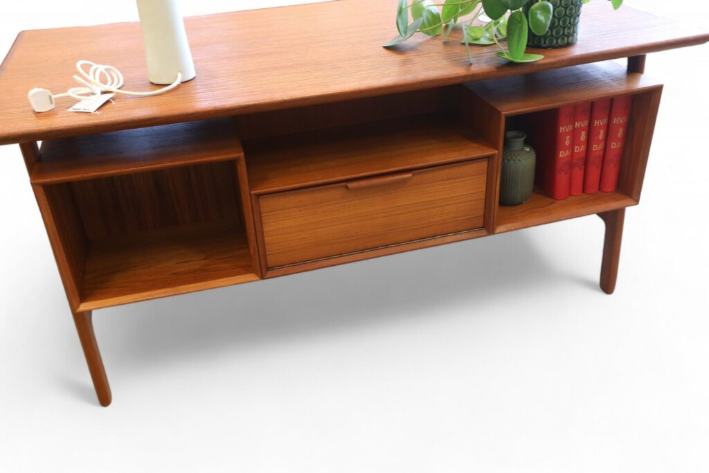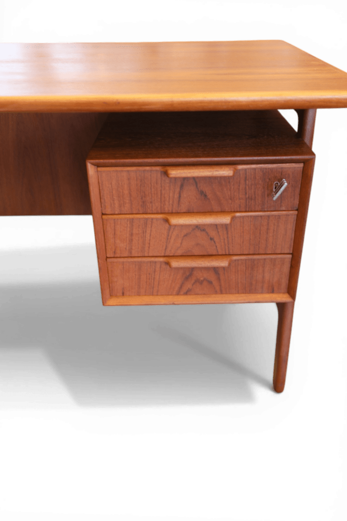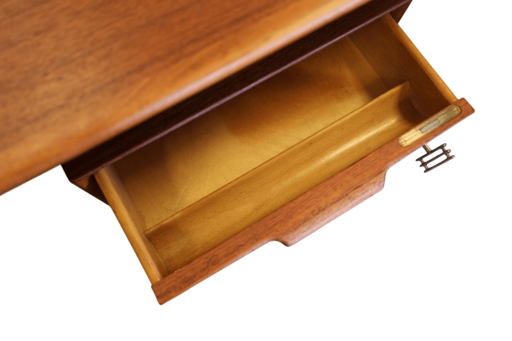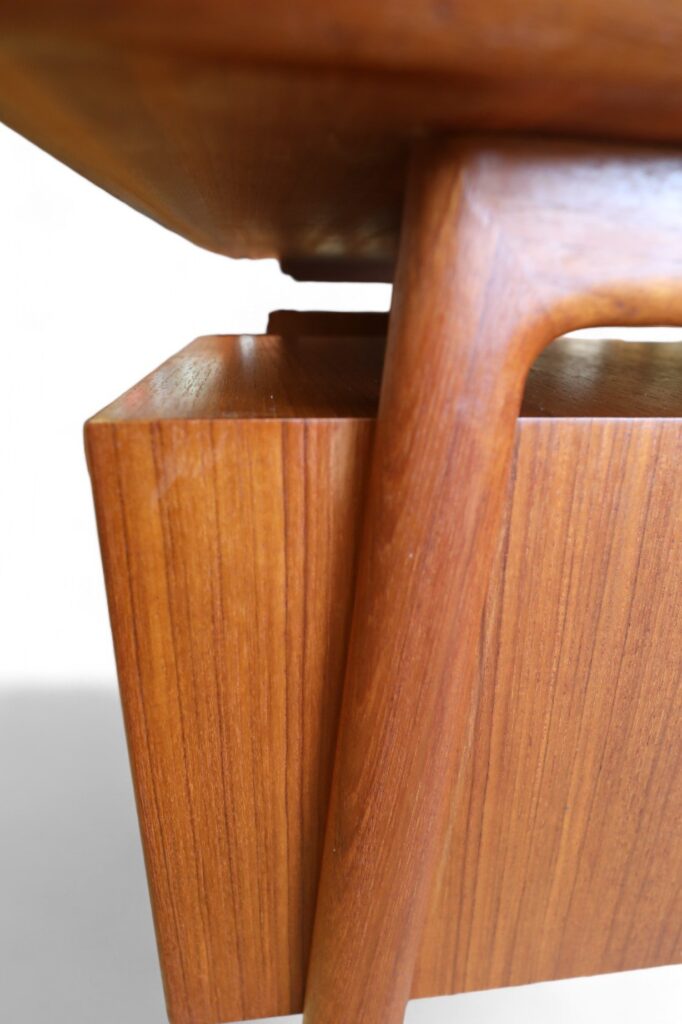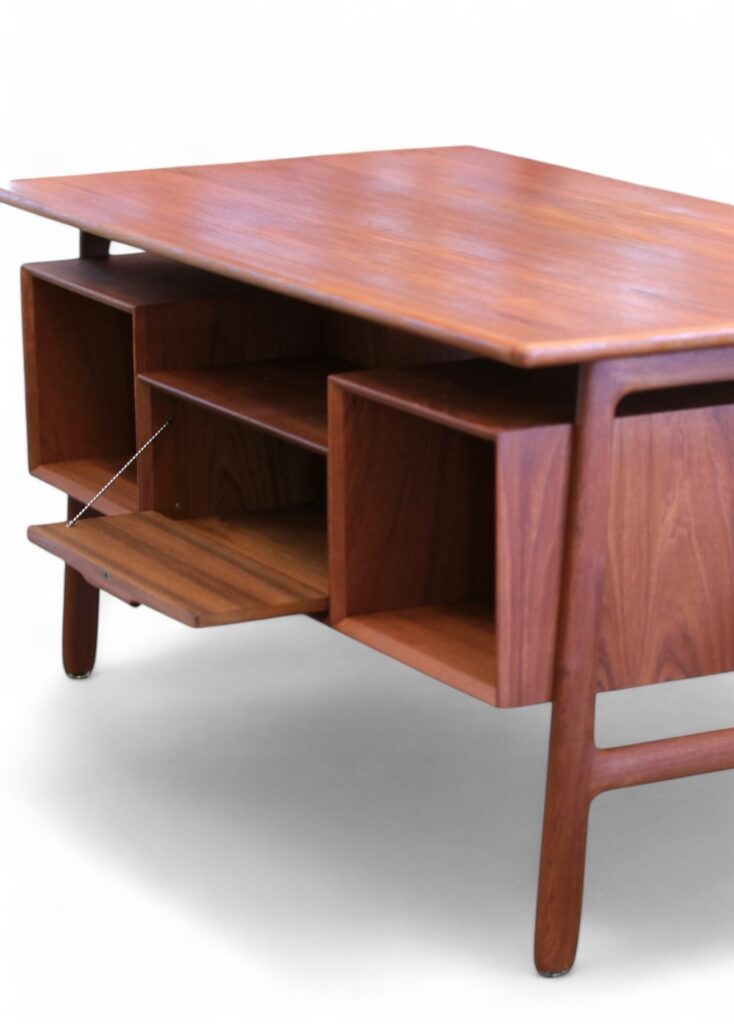 Ett utsökt elegant och tidlöst skrivbord med många fina detaljer och som vanligt när det gäller danskarna i mycket hög kvalitet. Skrivbordet är i mörk teak i en fristående modell och är formgivet av Omann Jun Danmark med modellbeteckning nr. 75.
