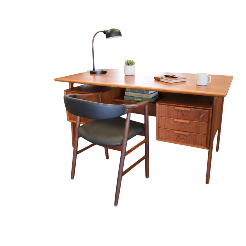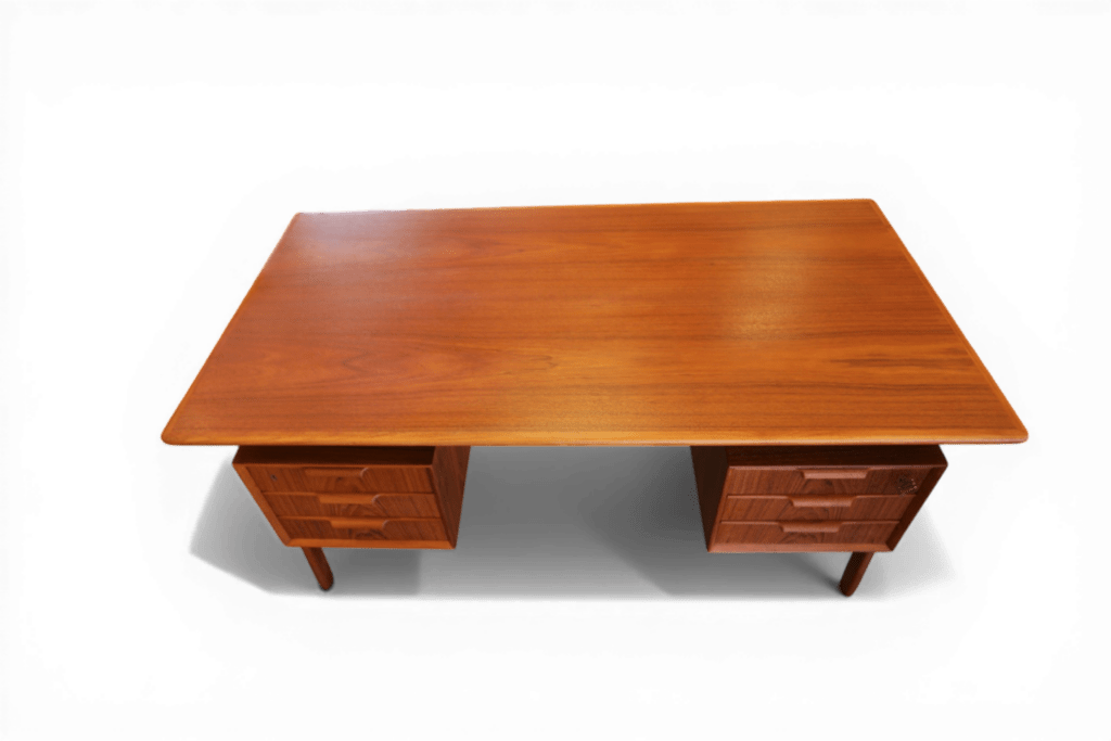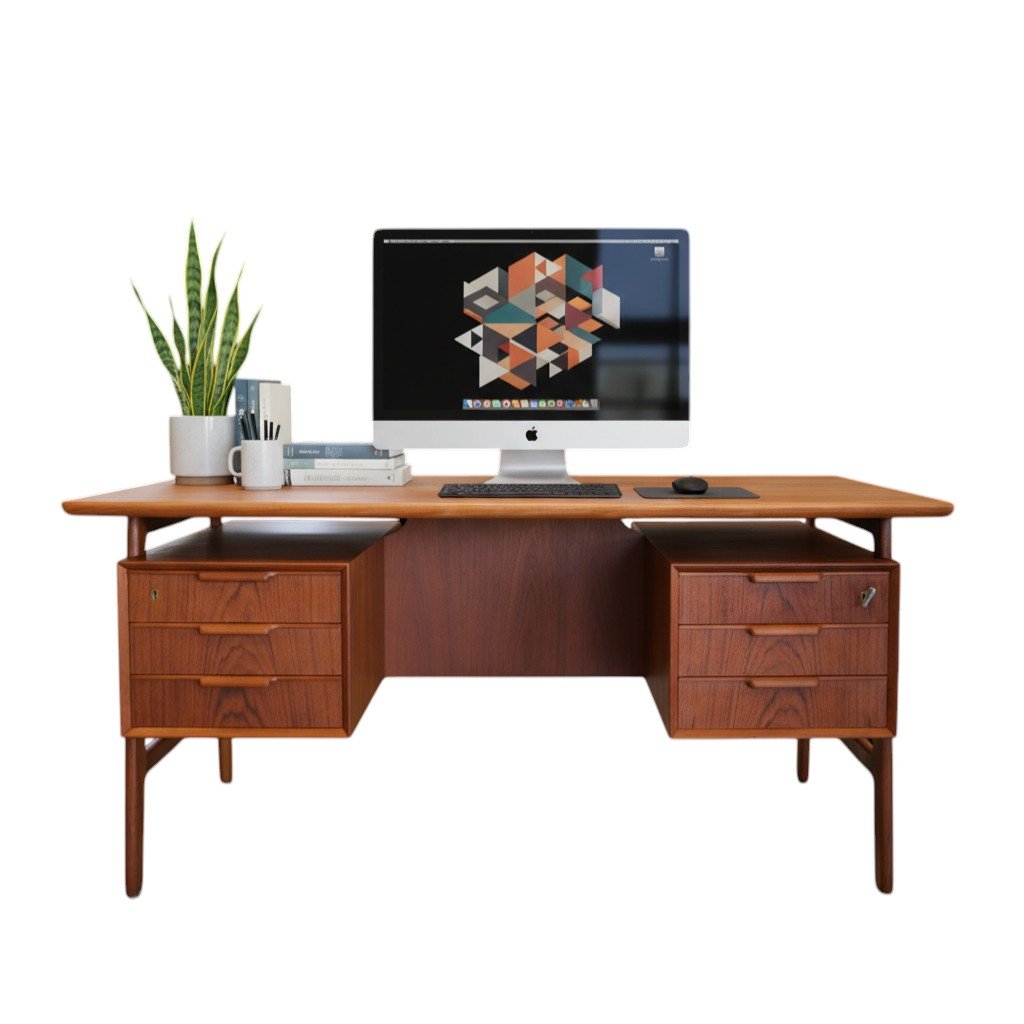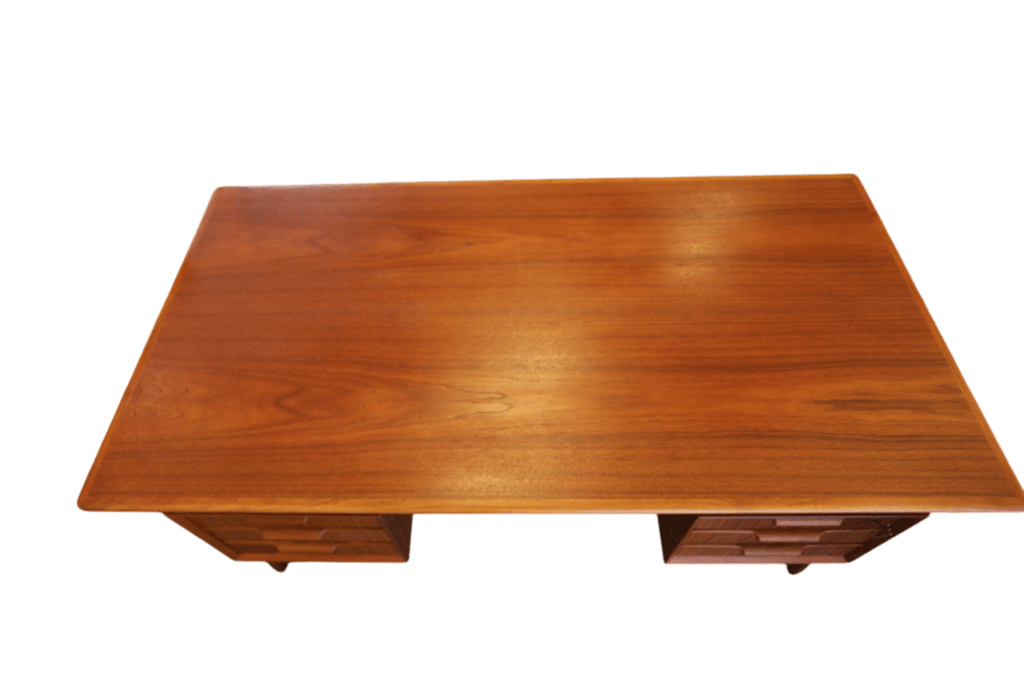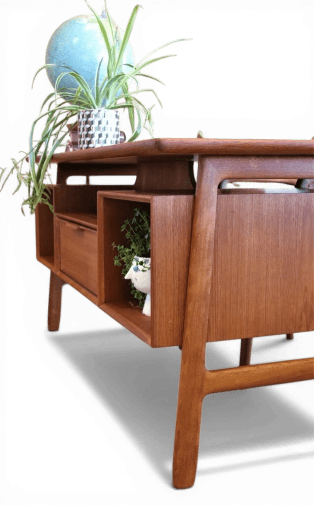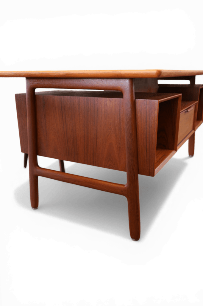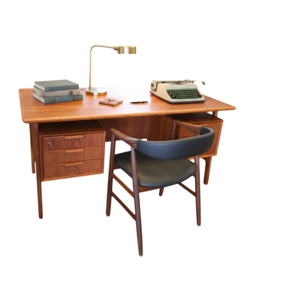 Ett utsökt elegant och tidlöst skrivbord med många fina detaljer och som vanligt när det gäller danskarna i mycket hög kvalitet. Skrivbordet är i mörk teak i en fristående modell och är formgivet av Omann Jun Danmark med modellbeteckning nr. 75.