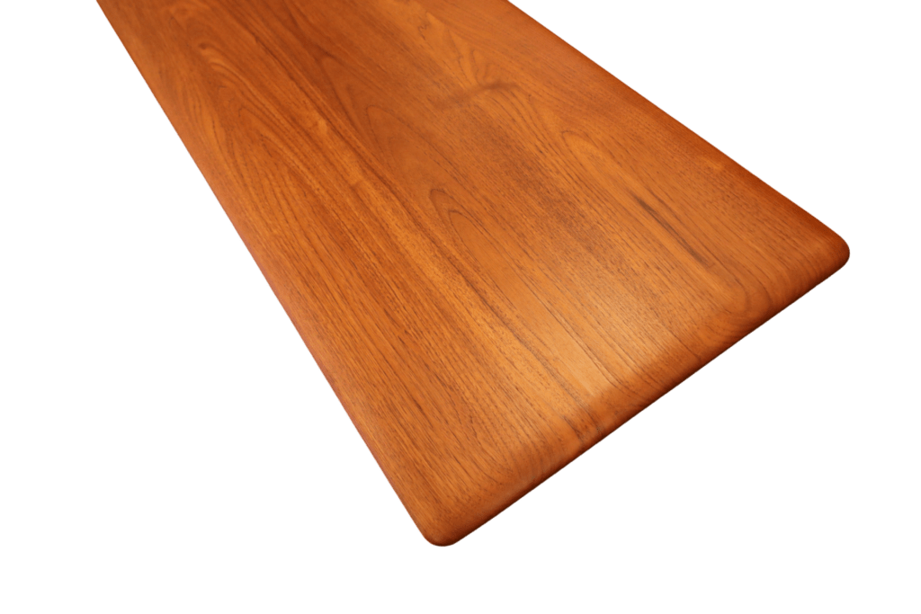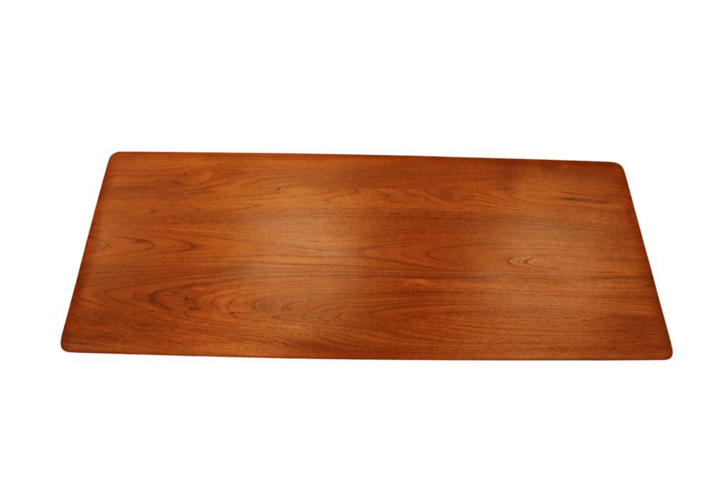Soffbordet är mycket stilrent och elegant, med en smäcker och tunn bordsskiva likt en surfingbräda, tillverkad av massiv teak. Bordet har mjukt rundade kanter och hörn som ger en mjuk och inbjudande känsla. Dessutom har bordet en praktisk tidningshylla, som är perfekt för att organisera dina tidningar och böcker. Hyllan har en ram i teak som harmonierar väl med bordet och är försedda med partier som är vackert flätade i rotting. Tidningshyllan är fäst med mässingsbeslag mellan bordsskivan och hyllan, där en diskret distans skapar en illusion av att hyllan svävar, vilket bidrar till bordets raffinerade och moderna estetik. Detta soffbord är inte bara en möbel, utan en verklig designikon som passar perfekt i alla moderna hem.