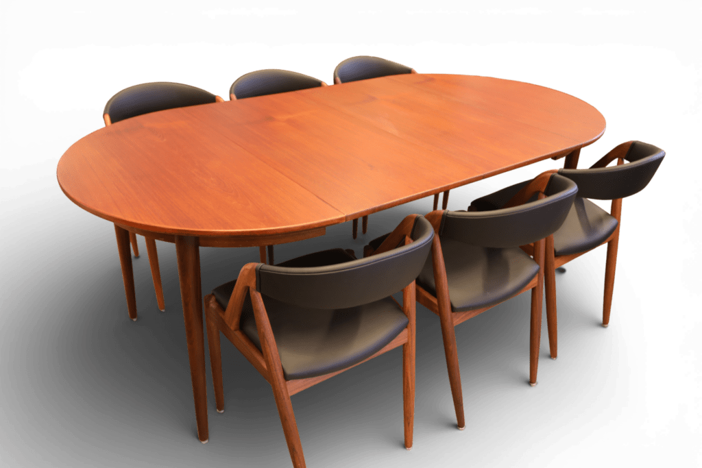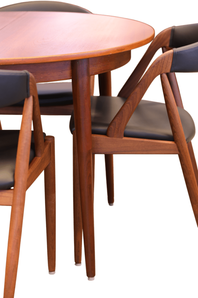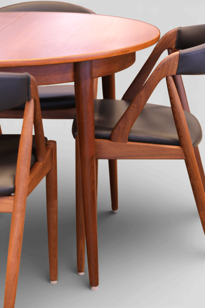 Bordet har bordsskiva, iläggsskivor och benställning i teak i en härlig gyllene ton. Bordet har alla ytor omfanerade med teak av den kvalitén som den som användes vid tillverkning förr. Nuförtiden är det endast den odlade teak som används, den som är i nytillverkade trädgårdsmöbler. Matbordet går utmärkt även att möblera med möbler i palisander då den har en djup och härlig ton!