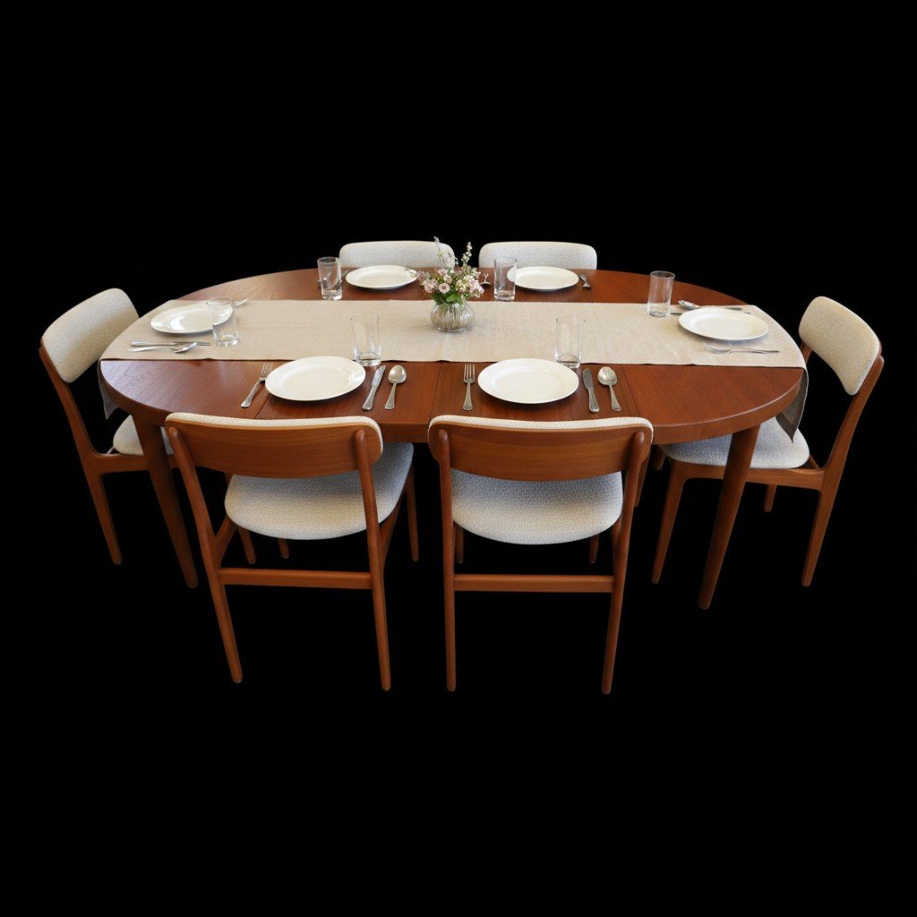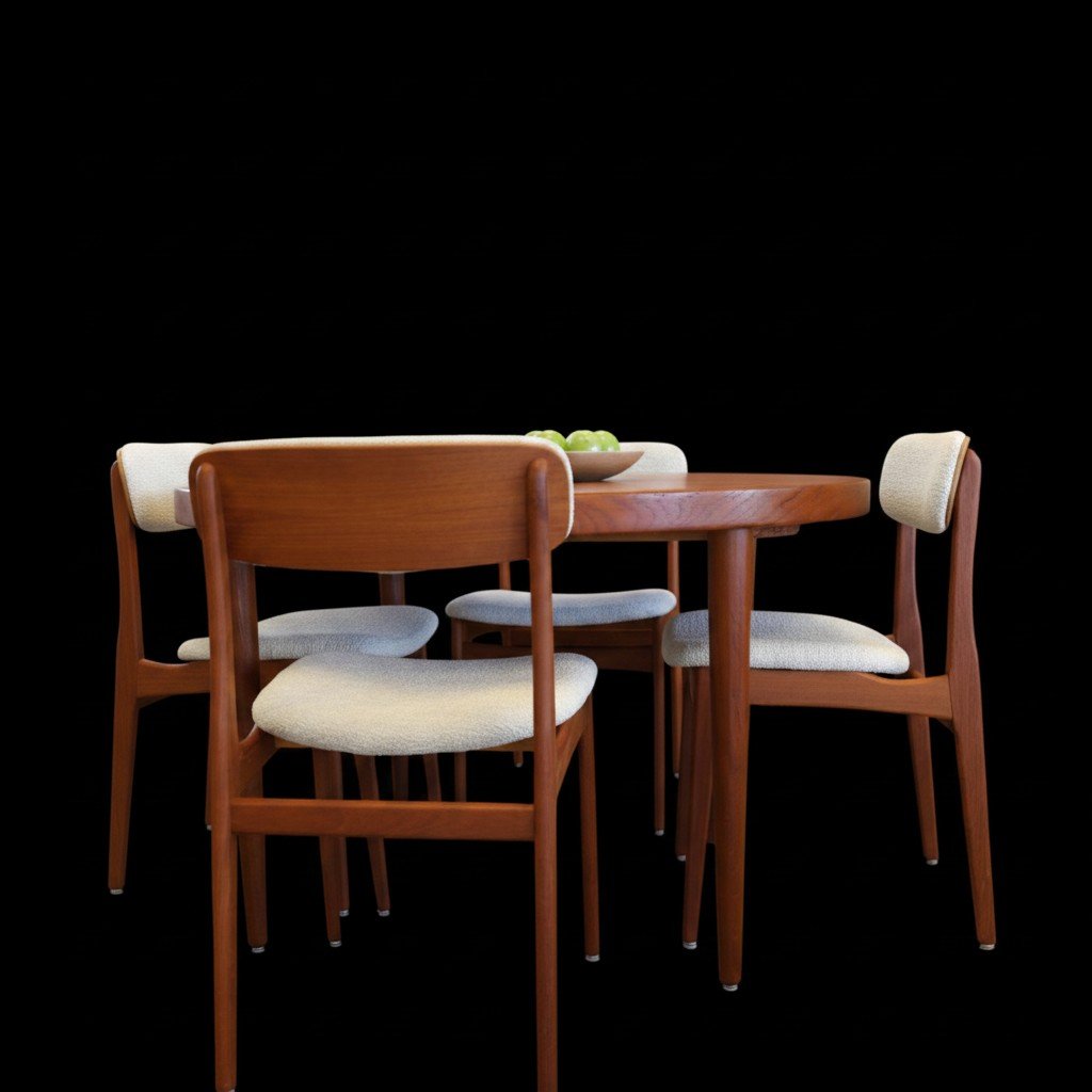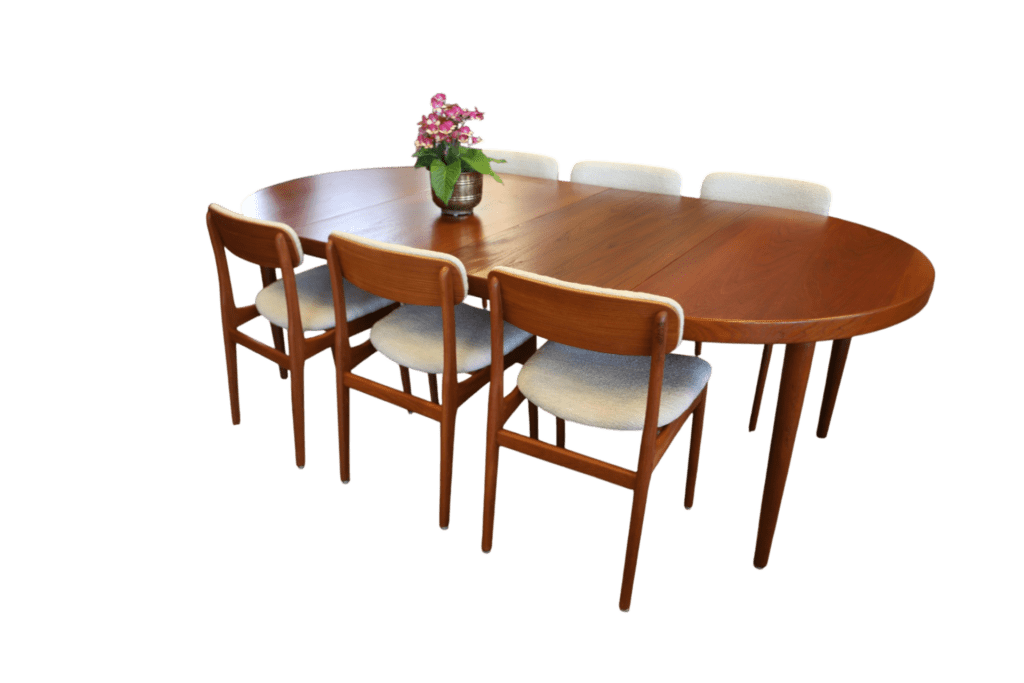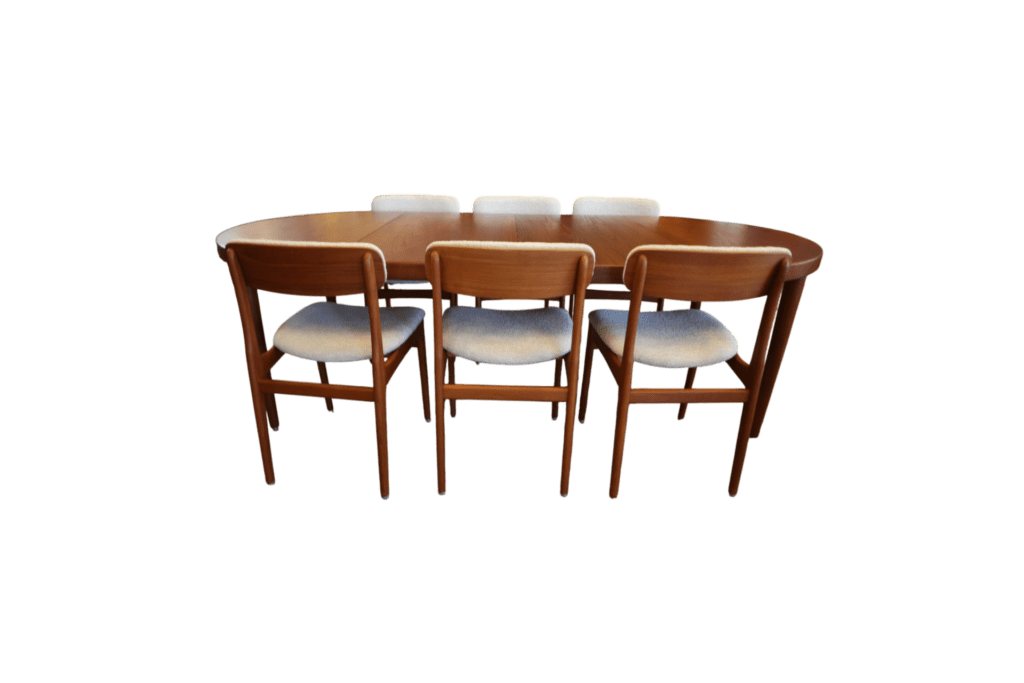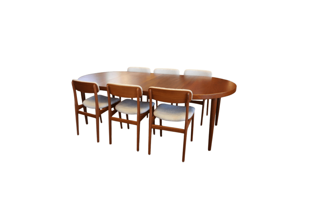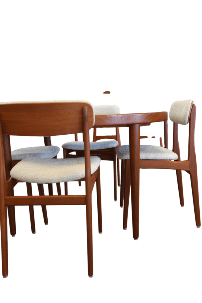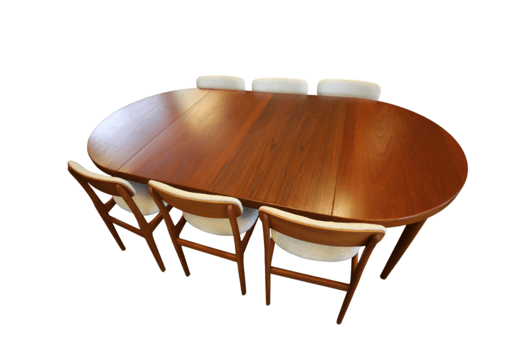 Bordet är tillverkat av Skovmand & Andersen och både bordsskiva, iläggsskivor och benställning är noggrant renoverat där alla ytor har nyfanerats i teak av samma höga kvalitet som användes förr. Resultatet är en elegant, tidlös och slitstark finish med en varm, gyllene ton som ger rummet ett mjukt och exklusivt uttryck. Det här är ett bord som både syns och känns.