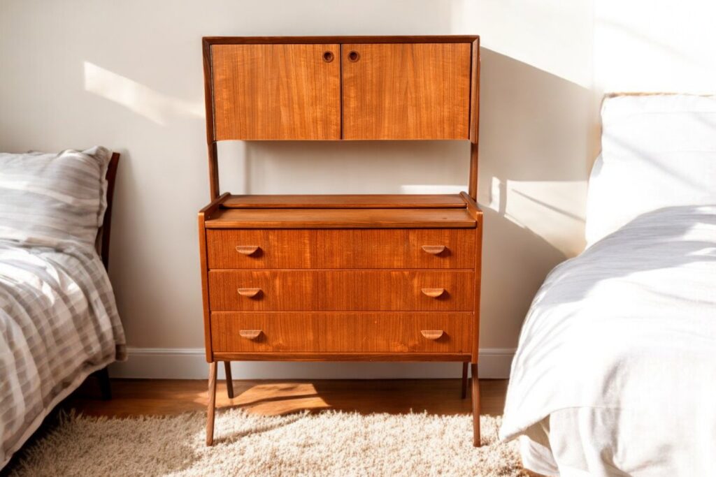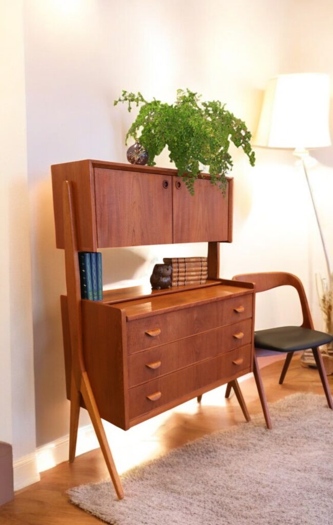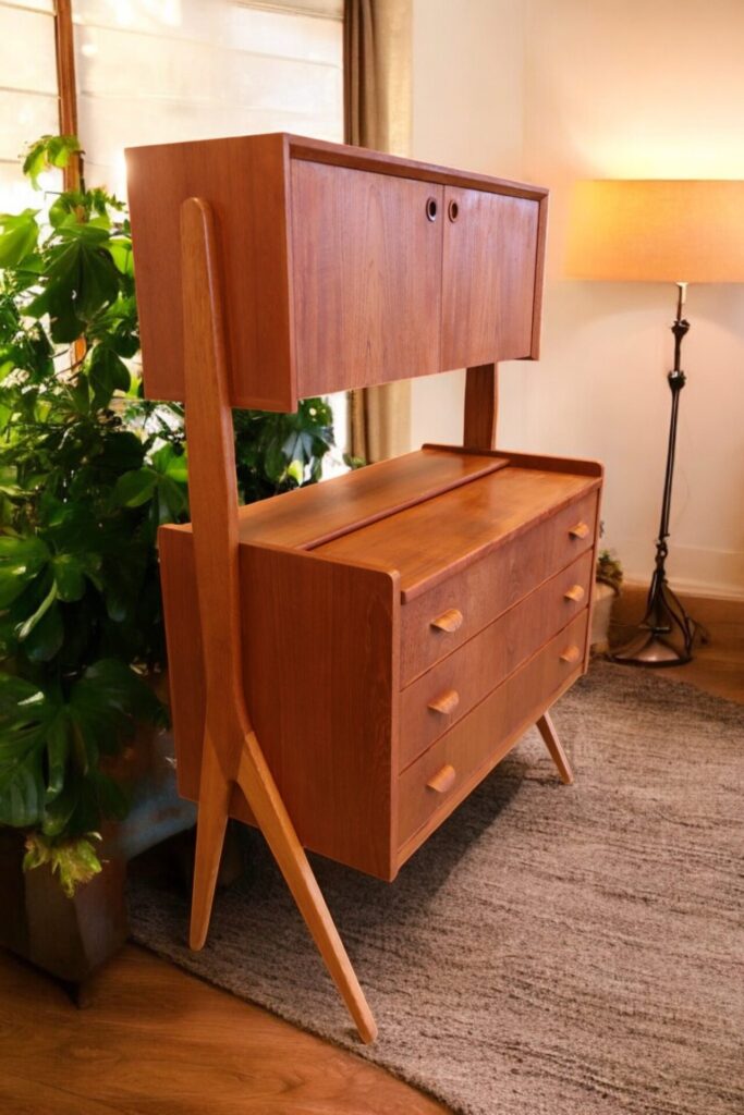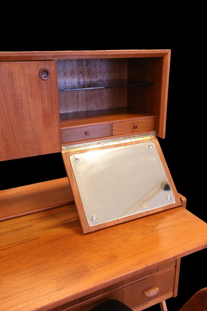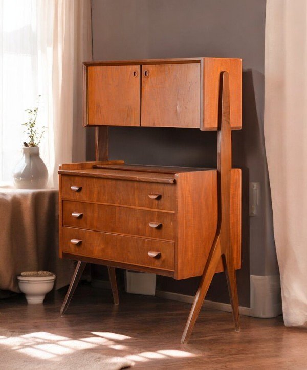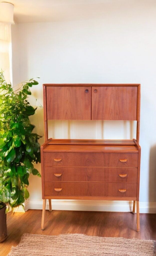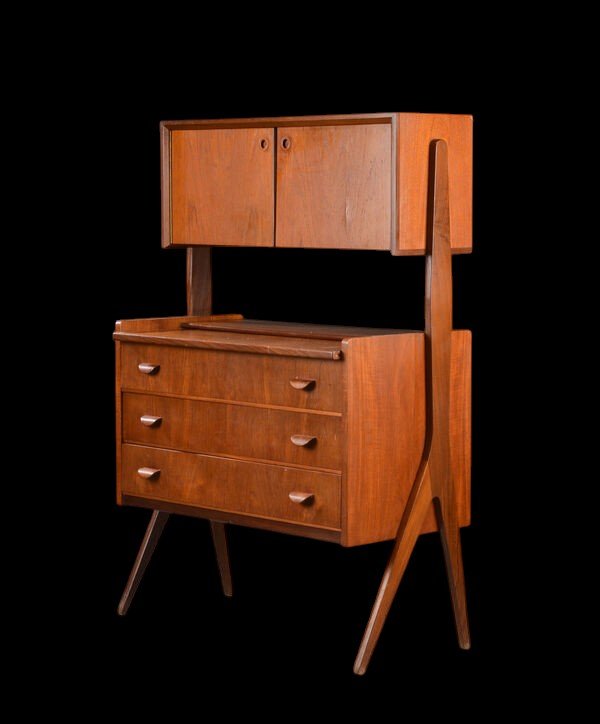 Skåpet är är i teak och har tre rejäla lådor för förvaring av kläder mm samt en utdragsskiva som är perfekt som skrivbordsyta eller pysslebord.