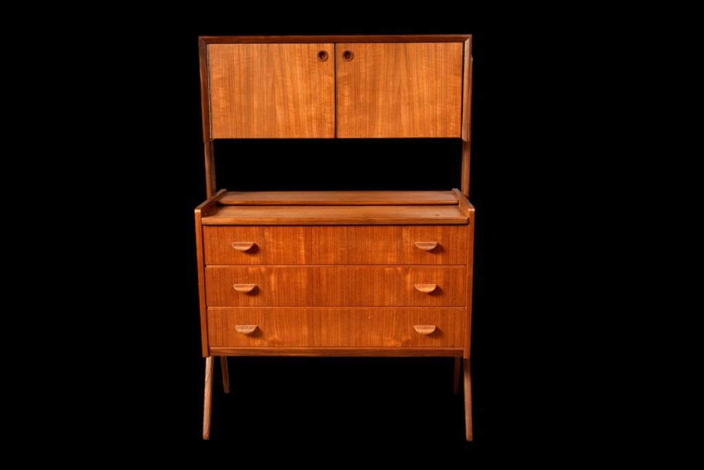 Ovanför byråhurtsen finns ett skåp med en traditionell dörr samt en fälllucka.