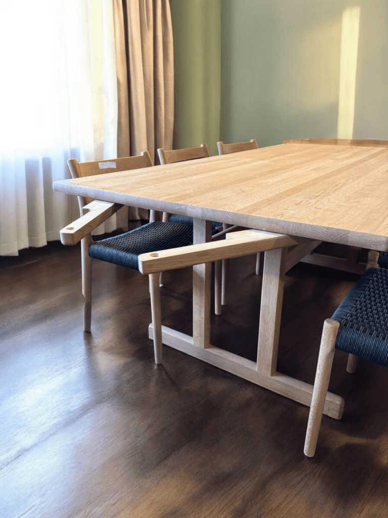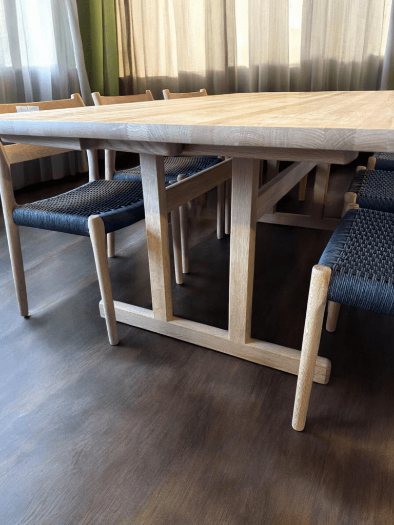 Matbordet har ett tidlöst utseende med raka linjer som är en del av det danska väl igenkända formspråk. Inspirationen kommer från den amerikanska shakerstilen, precis som många andra möbler danska har haft.