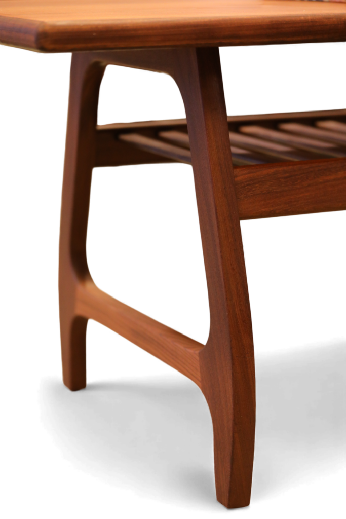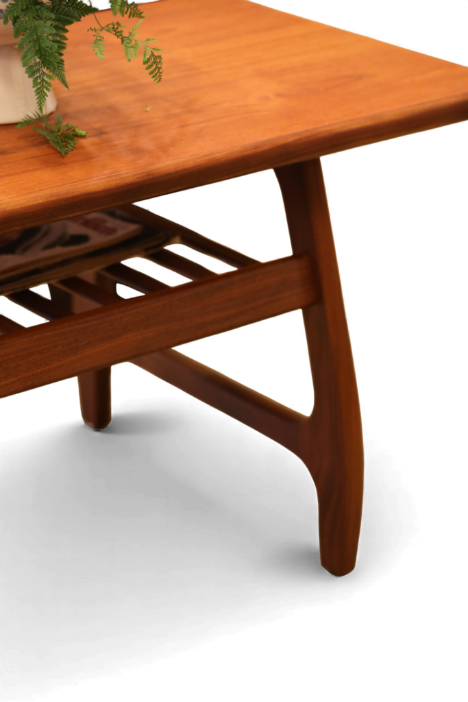 Bordet är i en vacker gyllenbrun teak och har A-formade ben i valnöt som utstrålar både stil och stabilitet. Mellan benparen finns en ribbad tidningshylla monterad, vilket inte bara tillför en estetisk detalj, utan också en praktisk funktion. Det blir även ett luftigt intryck med ribbingen.