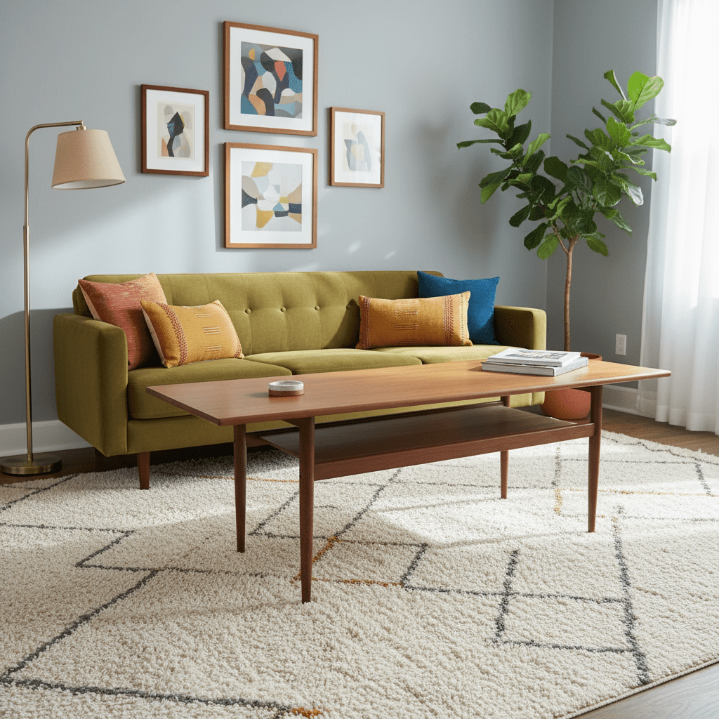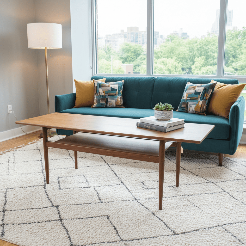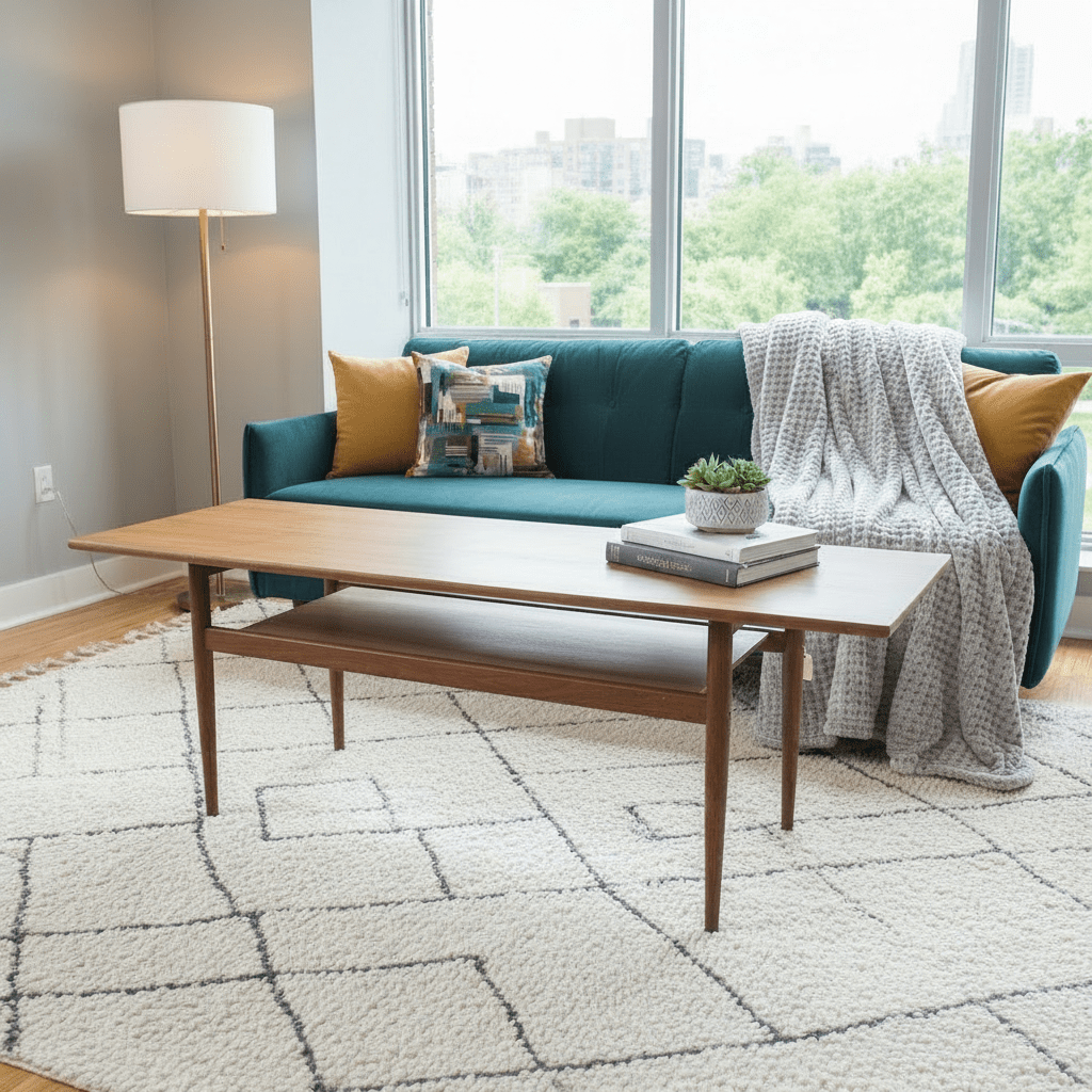 Mellan benparen finns en stadig tidningshylla som i princip ger bordet dubbel yta. Samtidigt erbjuder hyllan möjlighet att hålla bordsytan clean genom att lägga undan tidningar, fjärrkontroller och annat småplock på hyllan.