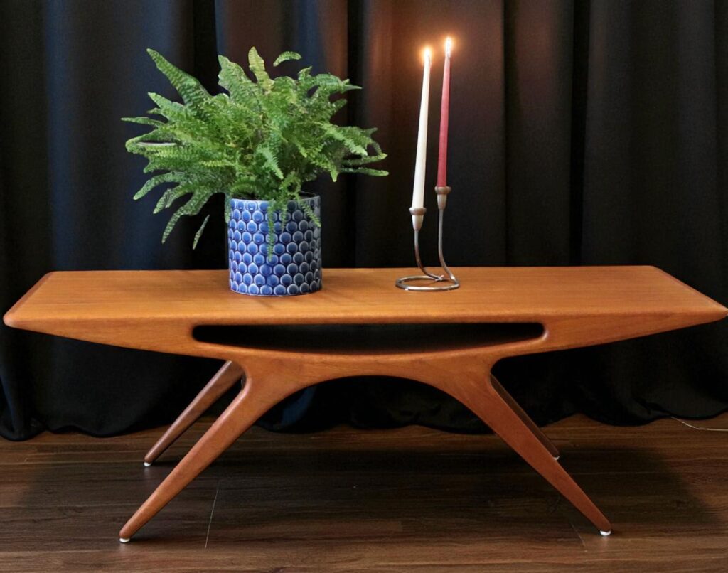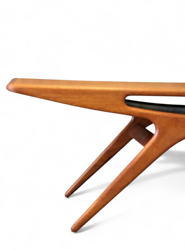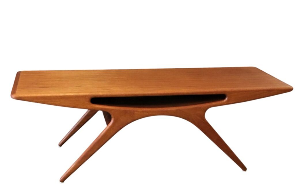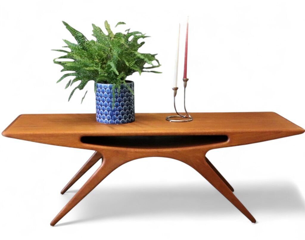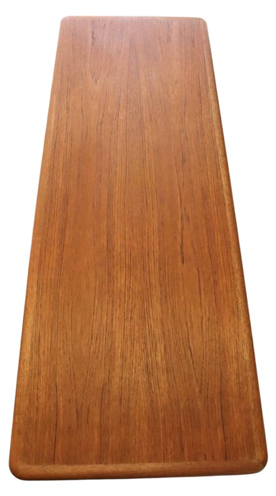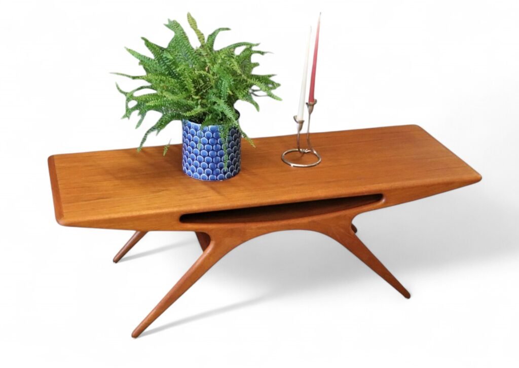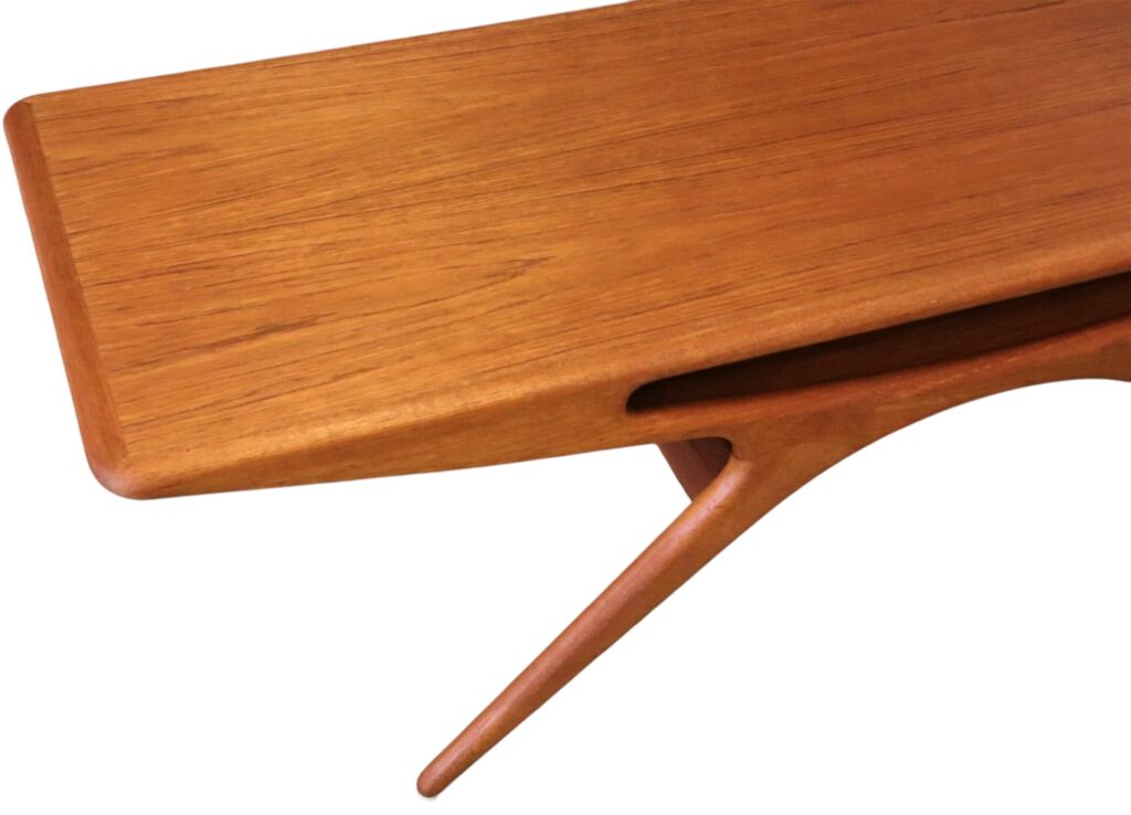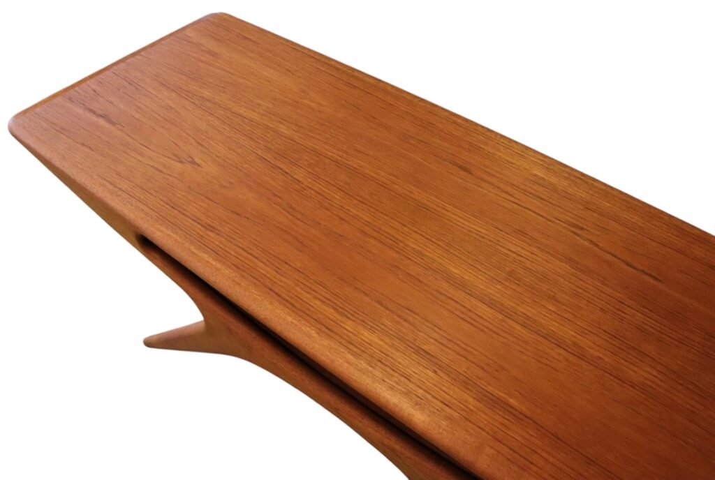 Soffbordet går under namnet Smile och är i elegant teak, formgivet år 1957 av designern Johannes Andersen för danska företaget CFC Silkeborg.