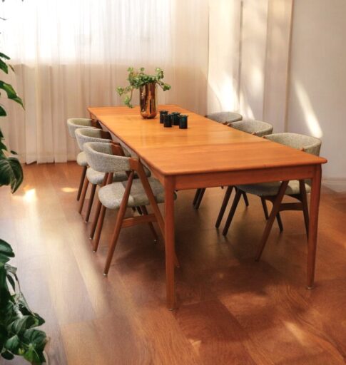 Ett matbord i teak med en gyllene ton och bordet är formgivet av Omann Jun,