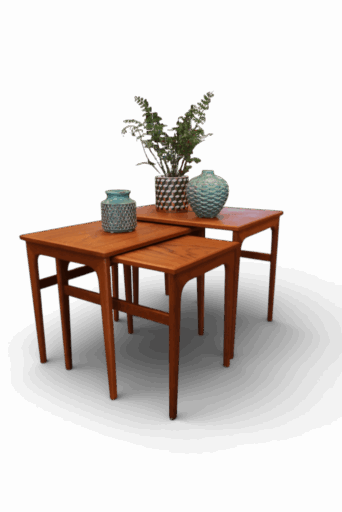 Ett makalöst vackert och elegant satsbord i teak tillverkat i Danmark under 1960-talet. Setet består